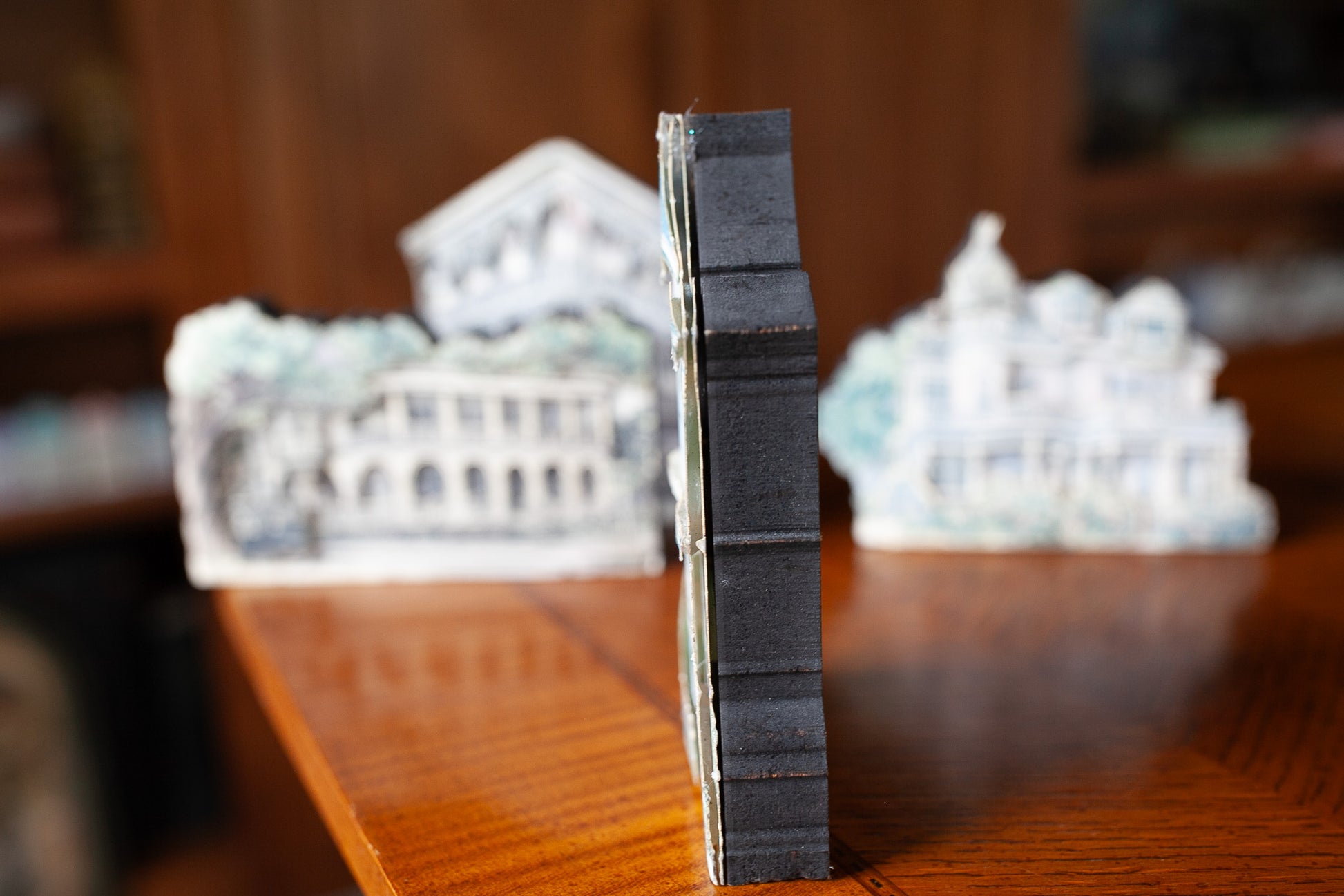 This little house is a paper 3d model that has been mounted to a wood block. It is so neat with the little tiny details and layered paper. There are a few little spots where the paper pieces are worn or turned under a little like the top center window bottom corner, but overall so sweet for display! It is about 5.5" tall and 3.25" wide. This listing is for the one house that is pulled forward the others are listed in separate listings at the time it was posted. Faded pink colors!