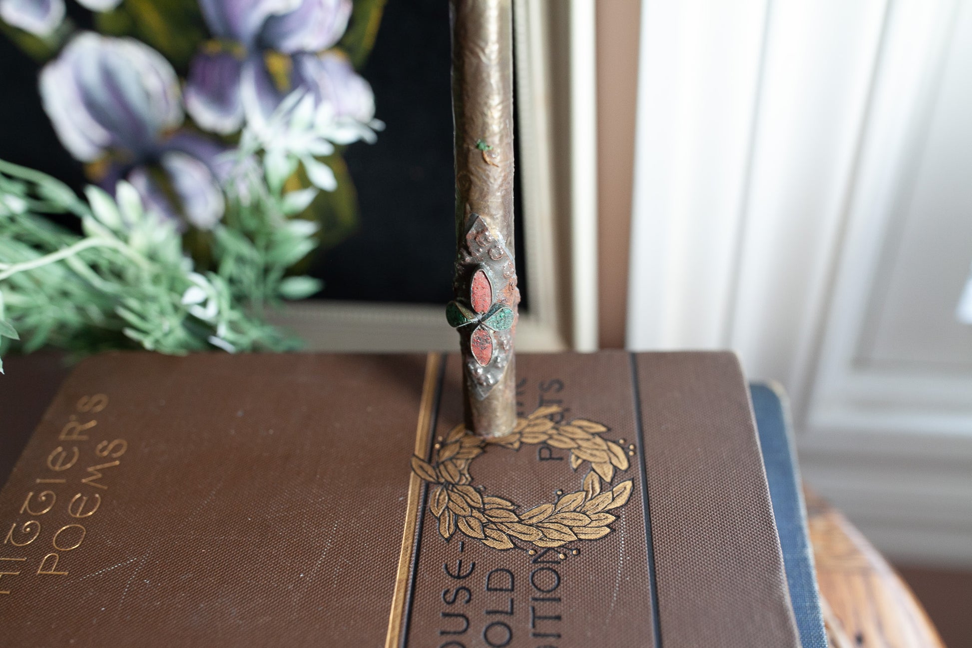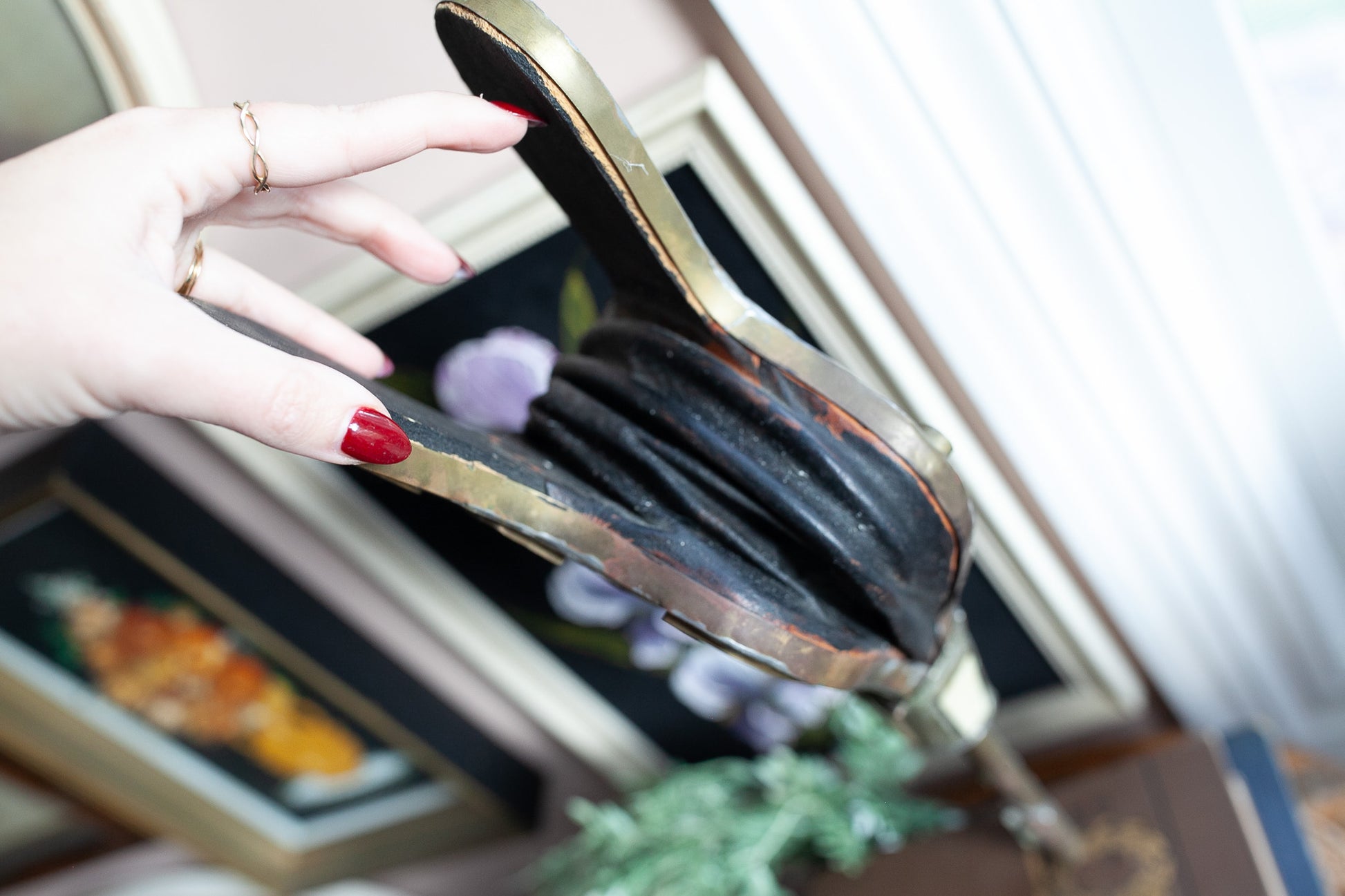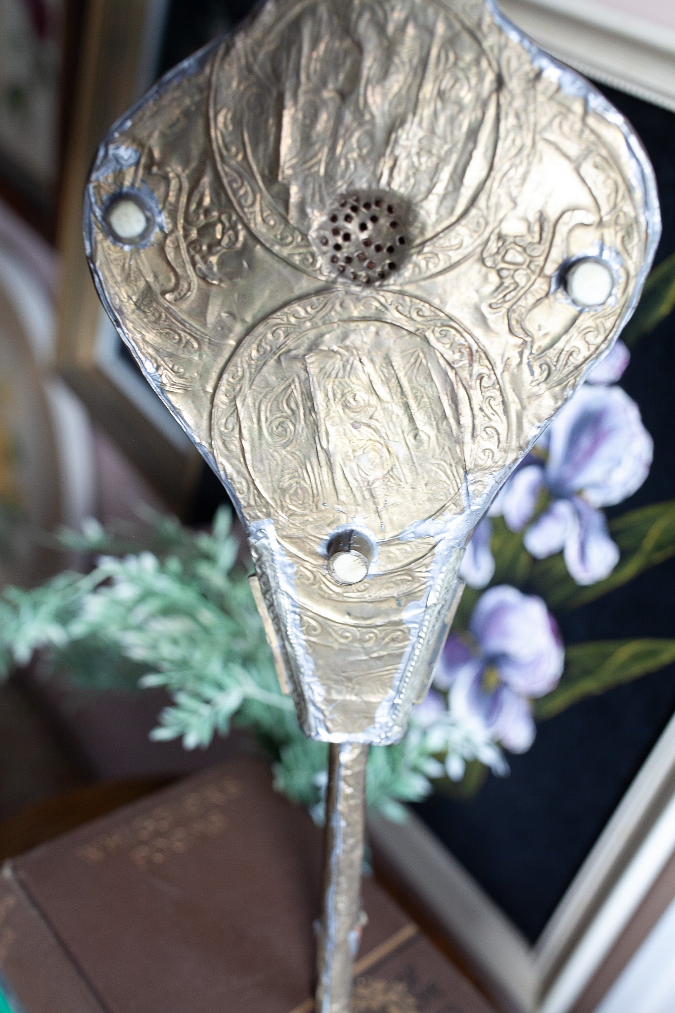 This is such a unique piece. It still works and you can blow air out of it. 18" long and about 6.25" wide at the widest. Pretty unique designs all around it. Some wear to the piece. Some paint wear and stone wear, but overall still very nice for the age.