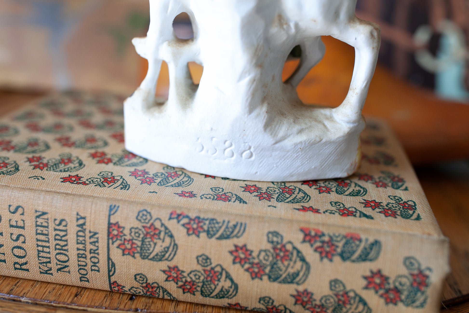 I'd assume this is German made or Austrian based on what it looks like, but am not certain. She is detailed so finely and has gold accents on her bow and shoes. She is holding onto a horse- who has a spot in the back for a small bud vase. The piece is about 6"x4.5" in size. No chips or cracks.