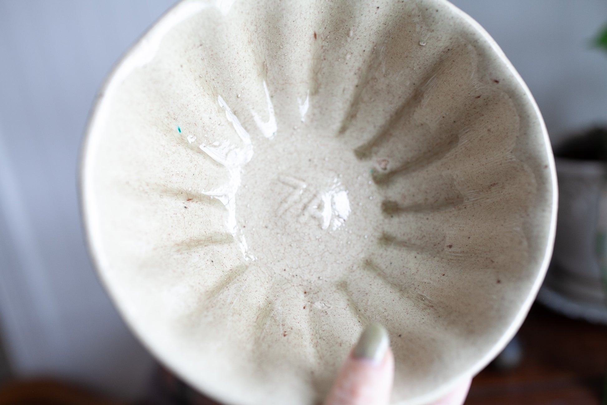 I wish I knew more about this one! It is intriquing with the 7A in the middle center of the inside. But regardless it is very old and stained and crazed and such a beautiful color! It is about 8" in diameter and 3" tall. It has a few little chips inside the bowl. It has no other markings but it does have fluted sides inside and out, which makes me wonder if maybe it was used to make some kind of bread... A great stacking piece!