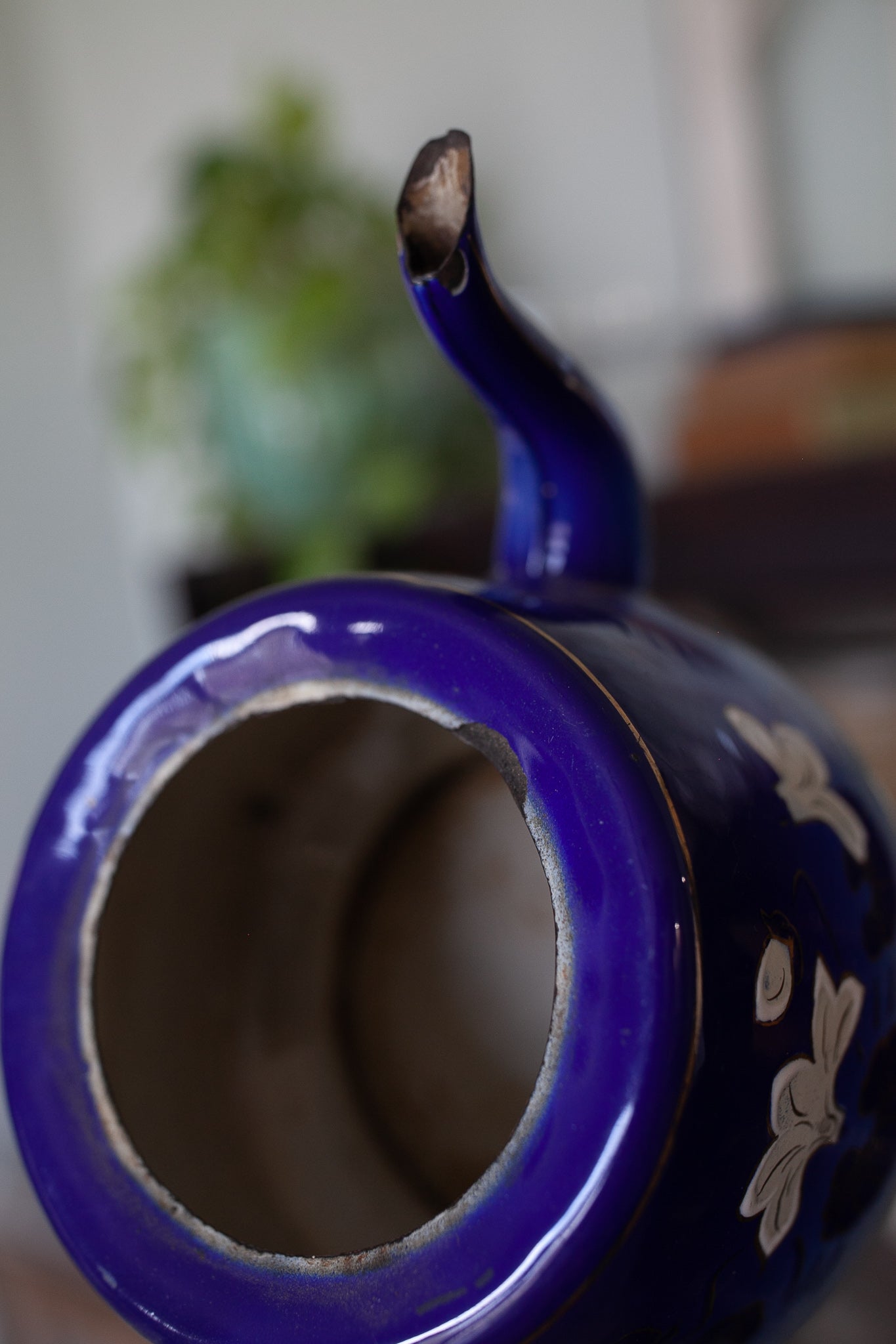 Antique Enamelware Teapot - Blue and White Teapot  -About 9.5" wide spout to handle 5" tall to the top of the teapot and 6.25" to the top of the lid. 3.5" diameter opening under the lid. This enamel teapot is stunning! It is deep navy blue to light blue to white at the base. It has flowers on the front and back and has gold detailing around the edges and on the flowers. It has some worn enamel spots typical of the age of this piece and a start of a chip under the lid around the rim of the opening where it has worn away (see photos), but no holes in the enamel.