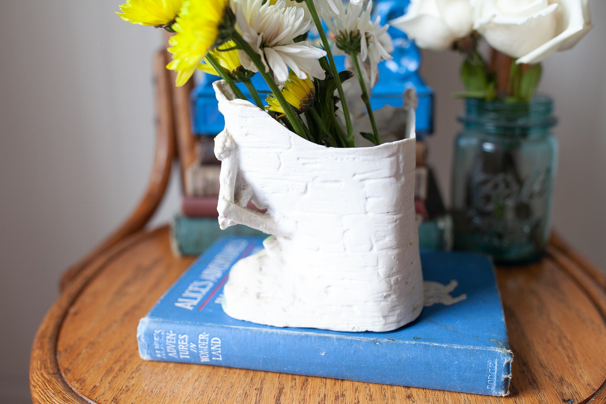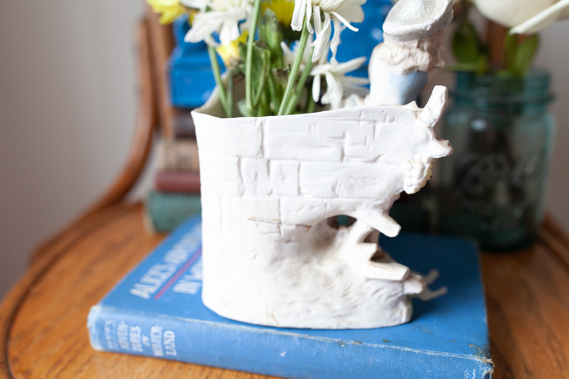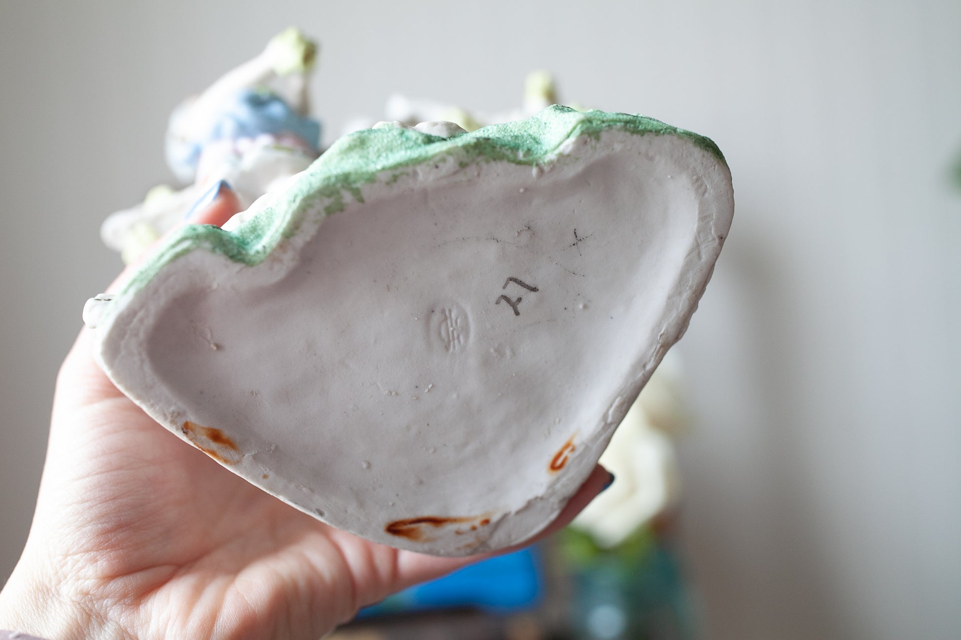 This is a lovely antique German Carl Schneider bisque piece. The girl is standing in front of what looks like a vine of grapes and is holding a hand full of grapes. She has flowers painted on her dress and an apron full of grapes. Maybe the perfect wine cork holder!  She is a vase and in good shape for the age with no glued or repaired spots. She does have a slit in the bisque on the back that I am not sure how it happened as it is about 2" across and is like the pottery was sliced there before drying... but regardless It is sturdy but would not be water tight. There are two tiny little flea bite chips along the back top edge. She has a stamp on the base. 6.5" tall at the tallest point by 6" wide at the widest by about 4.25" deep vase portion.