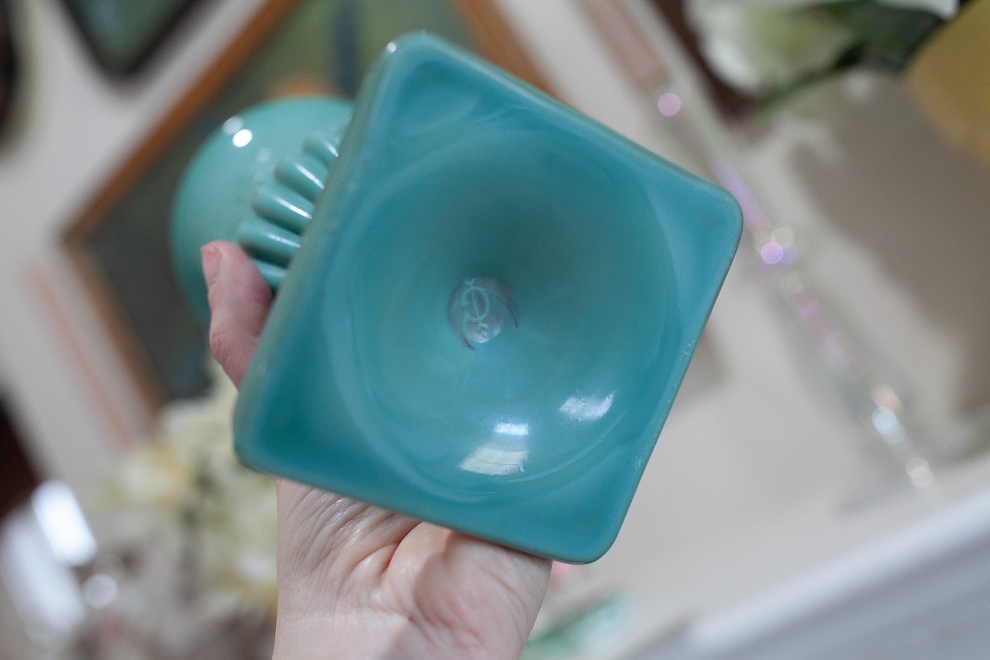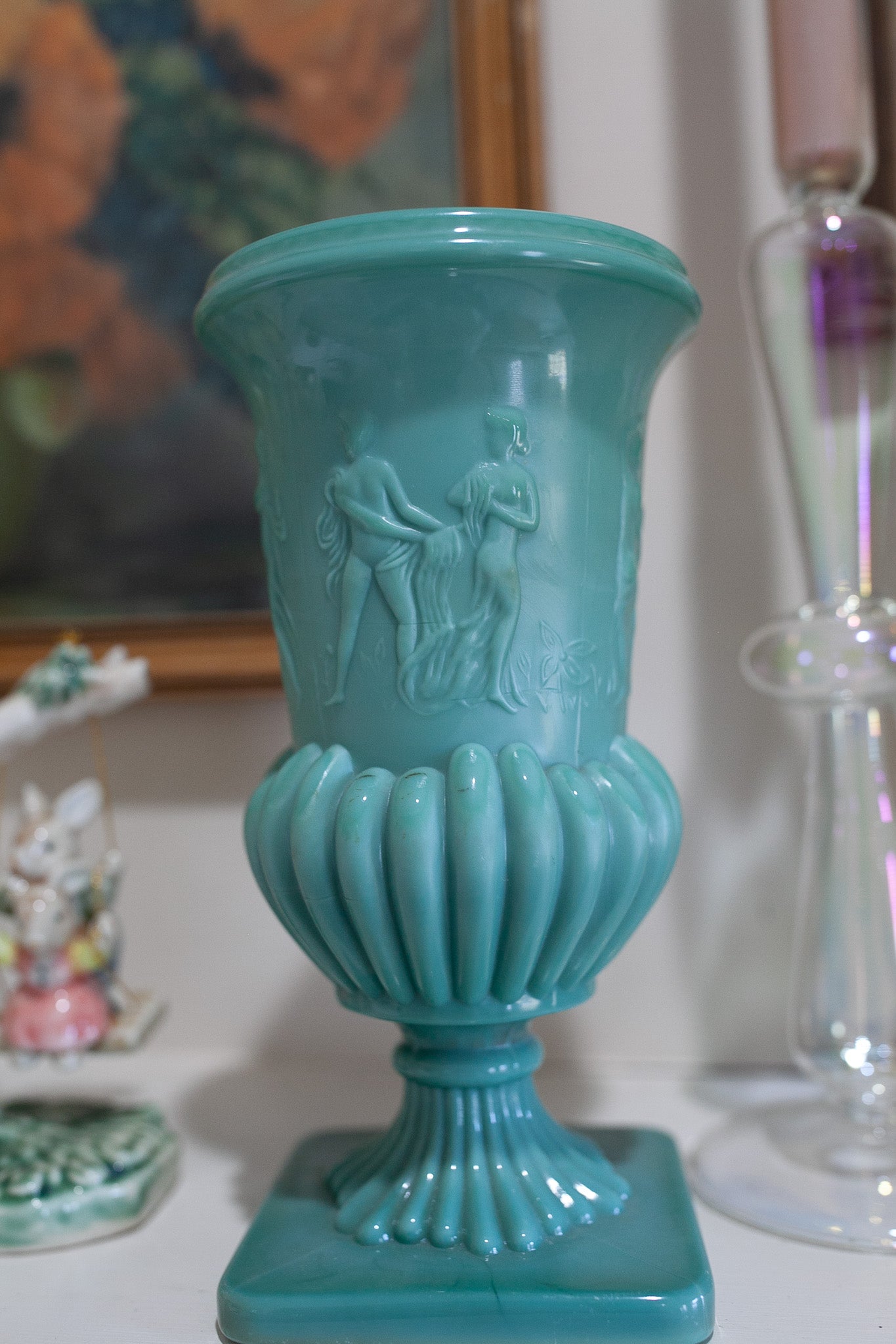 Antique Glass Urn Classical Figures Nymphs and Dogs 8.25 Inch tall with a 3.5" square base- This is such a beautiful vase! A heavy glass in a deep aqua color. This antique satin glass urn depicts classical nude female figures with flowers and a sitting dog. Measuring approximately 8.25 inches tall this glass urn shows a few surface scuffs and is free from any chips, cracks or repairs. Please see all photos.