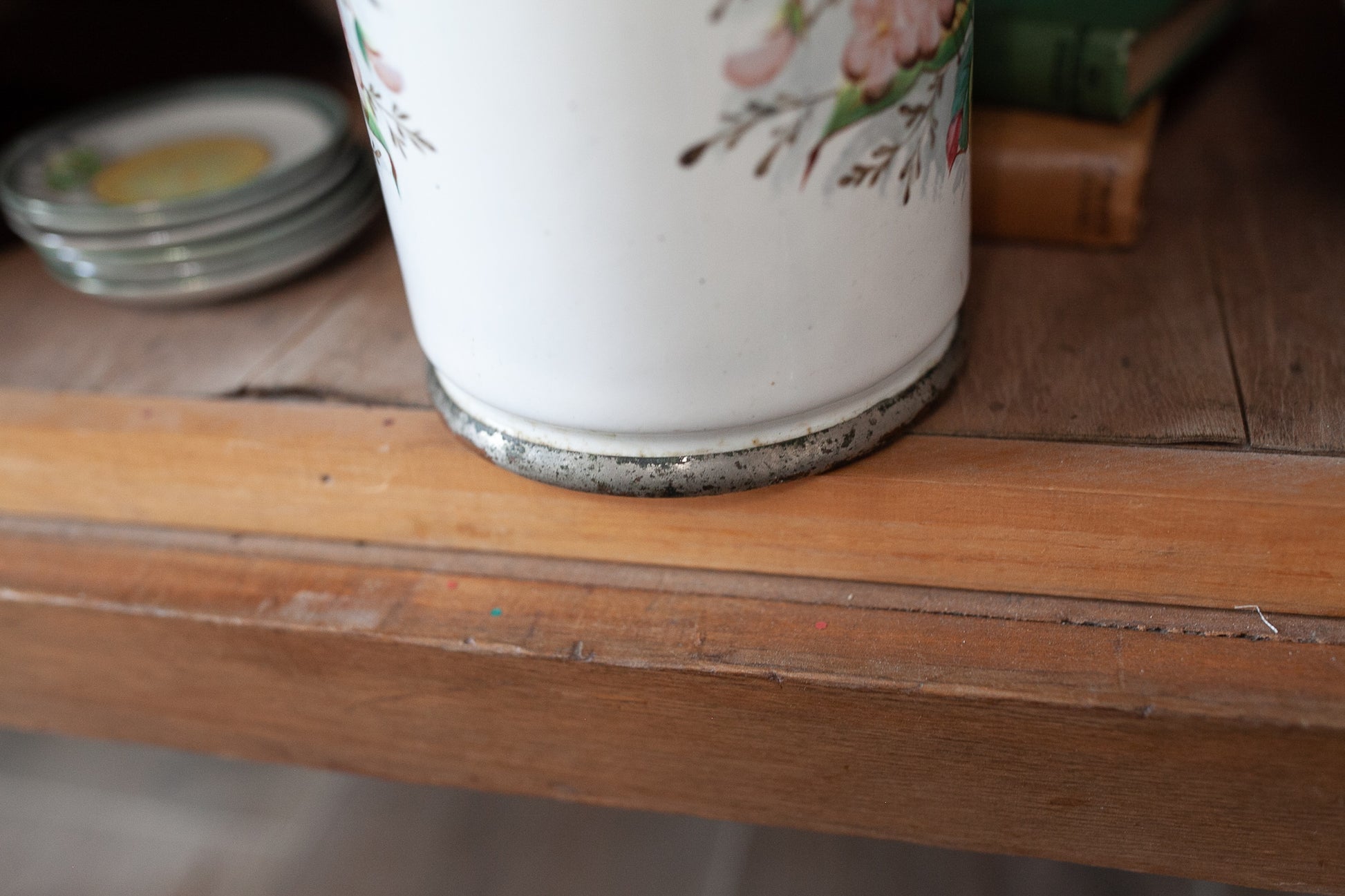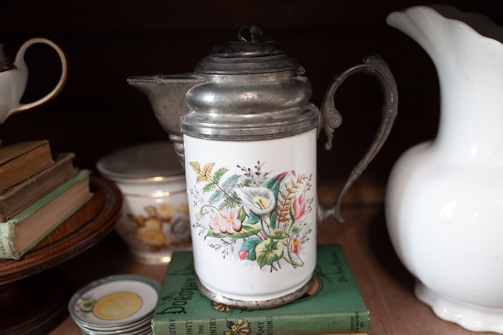 This gorgeous pitcher is an antique beauty! I love these so much with their pretty designs- they make for great display pieces. This one is about 10" tall and wide spout to handle. It has a floral image on both sides. It is in good condition for the age, but does have some rusting around the bottom edge. Some wear to the metal around the teapot. Hinge still working and spout can still open.