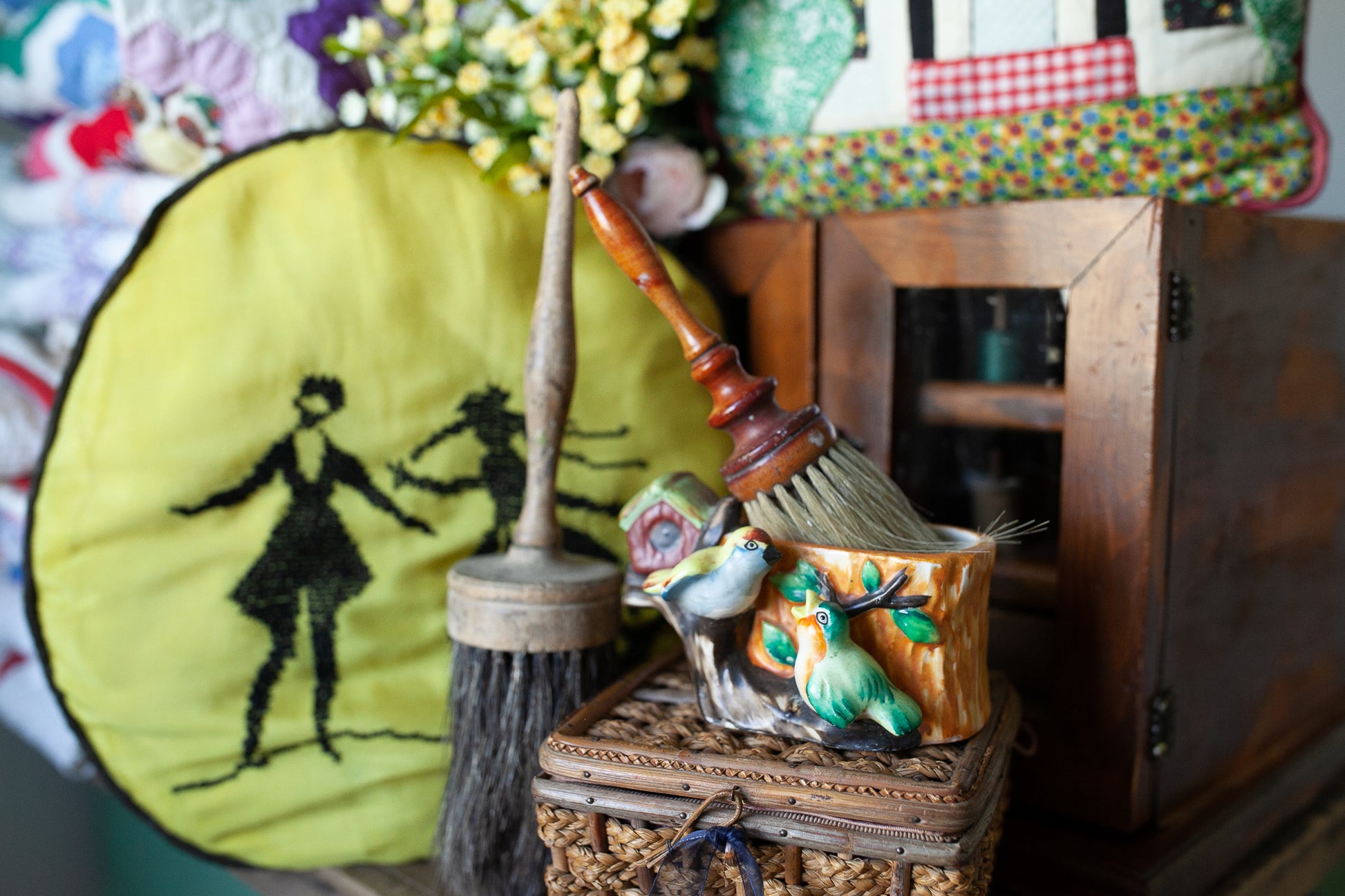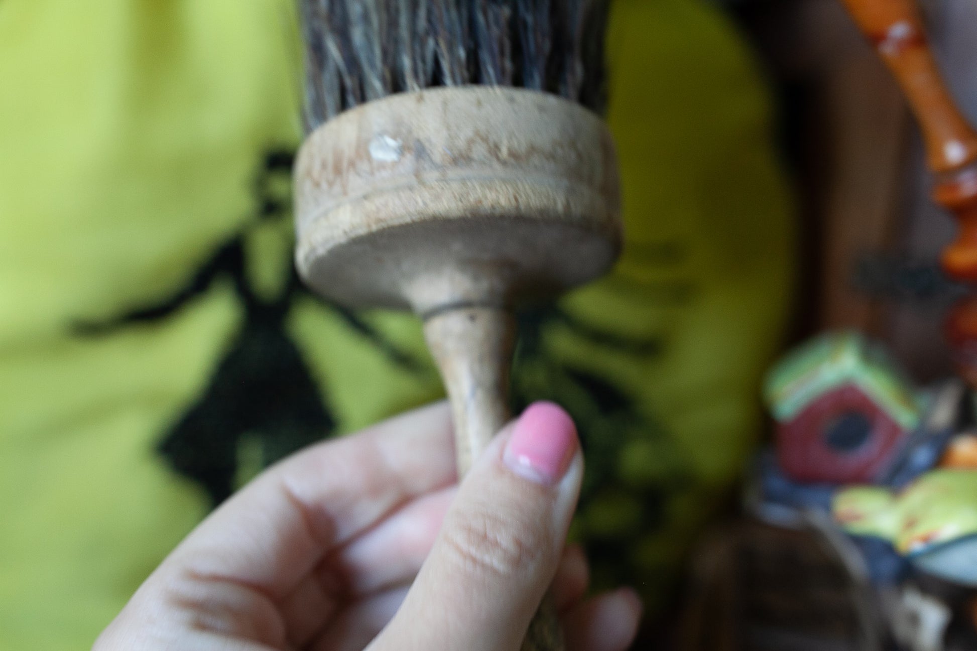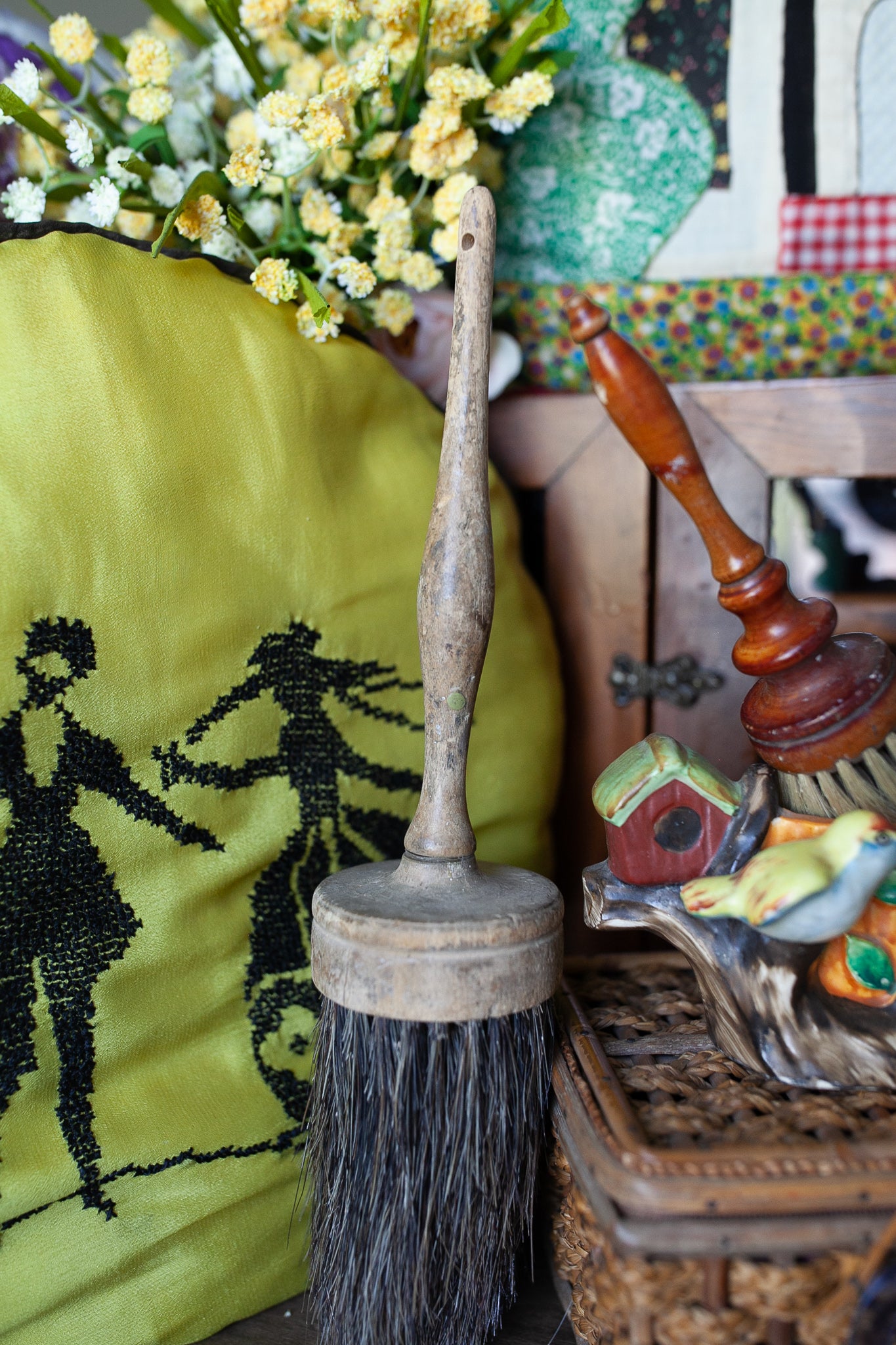 This brush is about 12" tall. It has a bunch of bristles that are of varying lengths. The wood is gorgeous with wear and character. Only for the one brush -everything else in photos are props. There is a tiny bit of what looks like white paint on the base of the bristles.