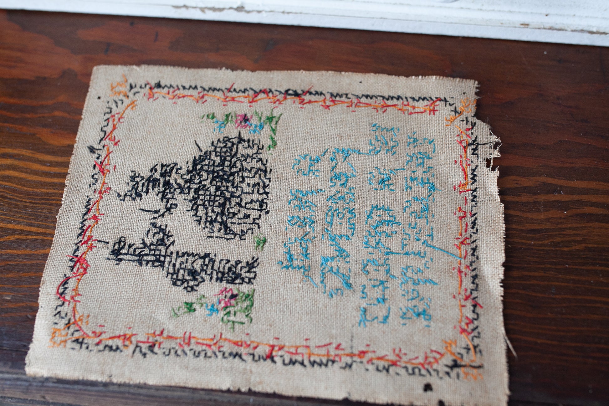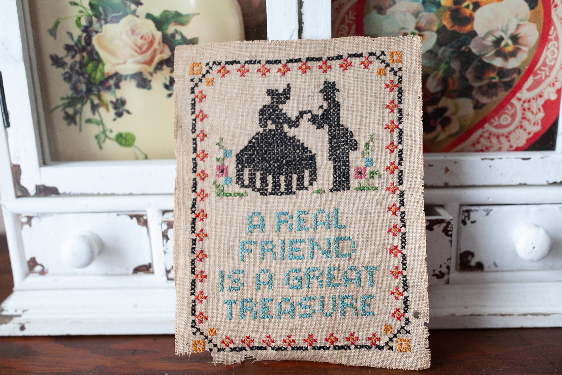 This antique sampler is so sweet! It is small in size at about 8x6". It says A real friend is a great treasure. It has a small silhouette of a man and woman at the top of the sampler and flowers surrounding them. The material is fragile and the lower left corner has torn some - see photos please. There is also a few small holes in the border, but could still be framed and displayed to make a wonderful piece of art or a sweet gift!