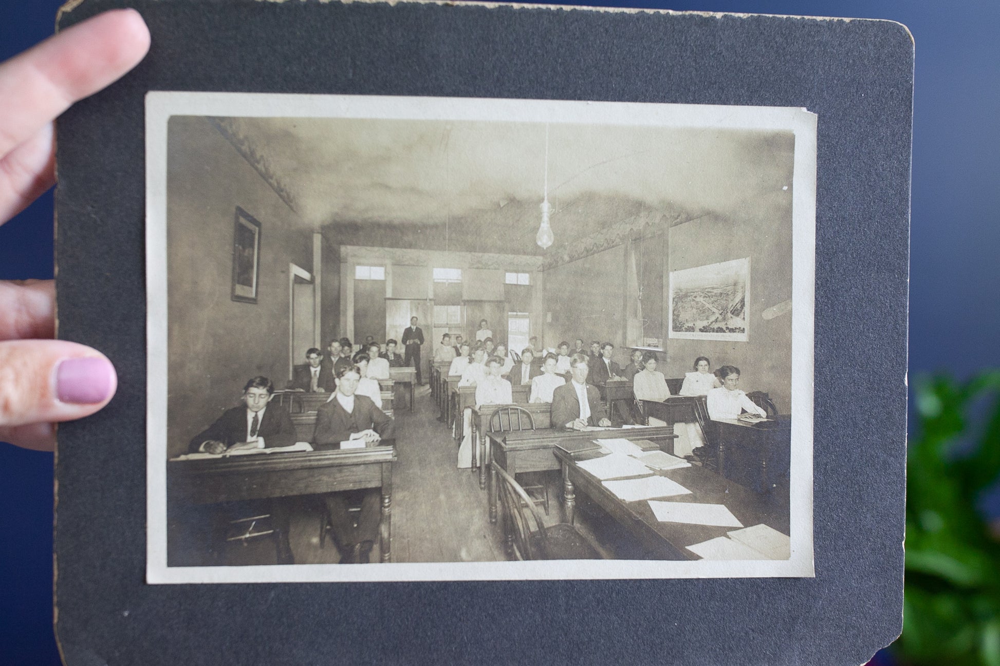 This old photo shows a classroom full of students. It is neat to look at all the details and how it appears their were definitely multiple ages in one classroom as there often were early on! The outfits show respect for the classroom as well! I personally like the lightbulb in focus in the front of the room. The photo is mounted to a black cardstock. The photo itself is about 7x5" and overall dims are about 9x7". A few pieces of old tape remain on the back.