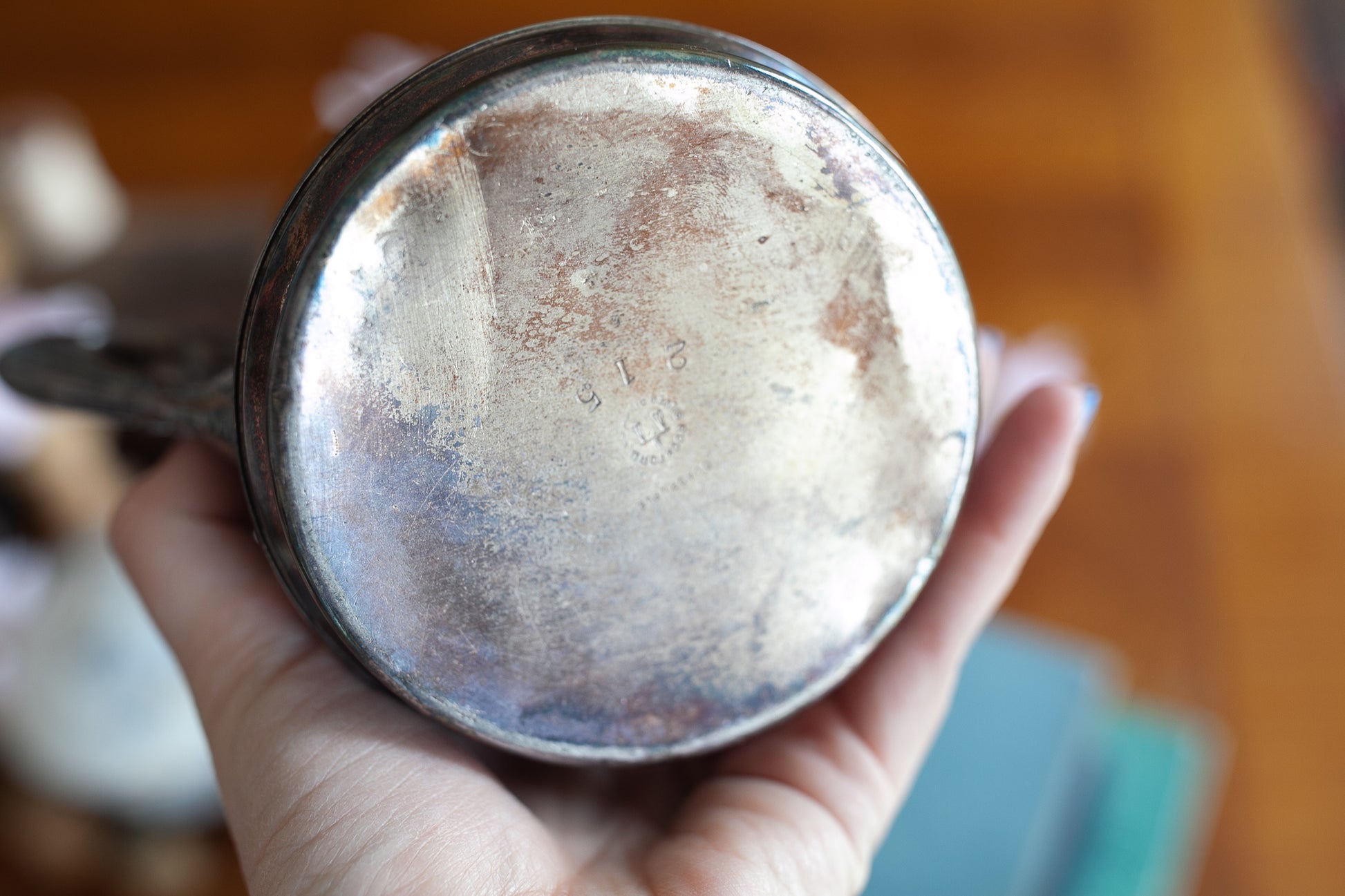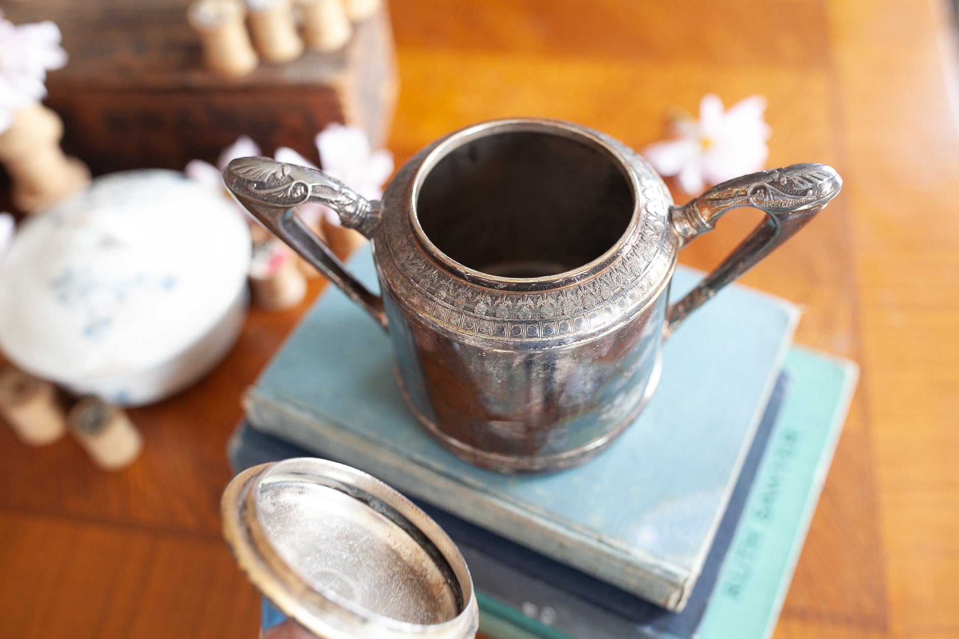Labeled on the base quadruple silver plated Rockford- It is a pretty shaped sugar bowl! It has tiny flower details around the top edge. It is tarnished and worn, but could be cleaned up if desired. It is about 6" tall to the top of the lid and about 7.5" wide handle to handle. The top opening is about 2.75" diameter. There is an old sticker mark still on the lid that was tarnished around it looks like and a small dent on the base, but otherwise still in good condition.