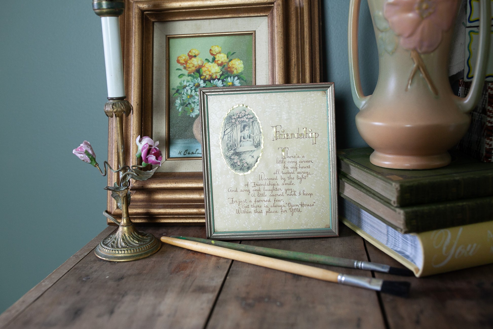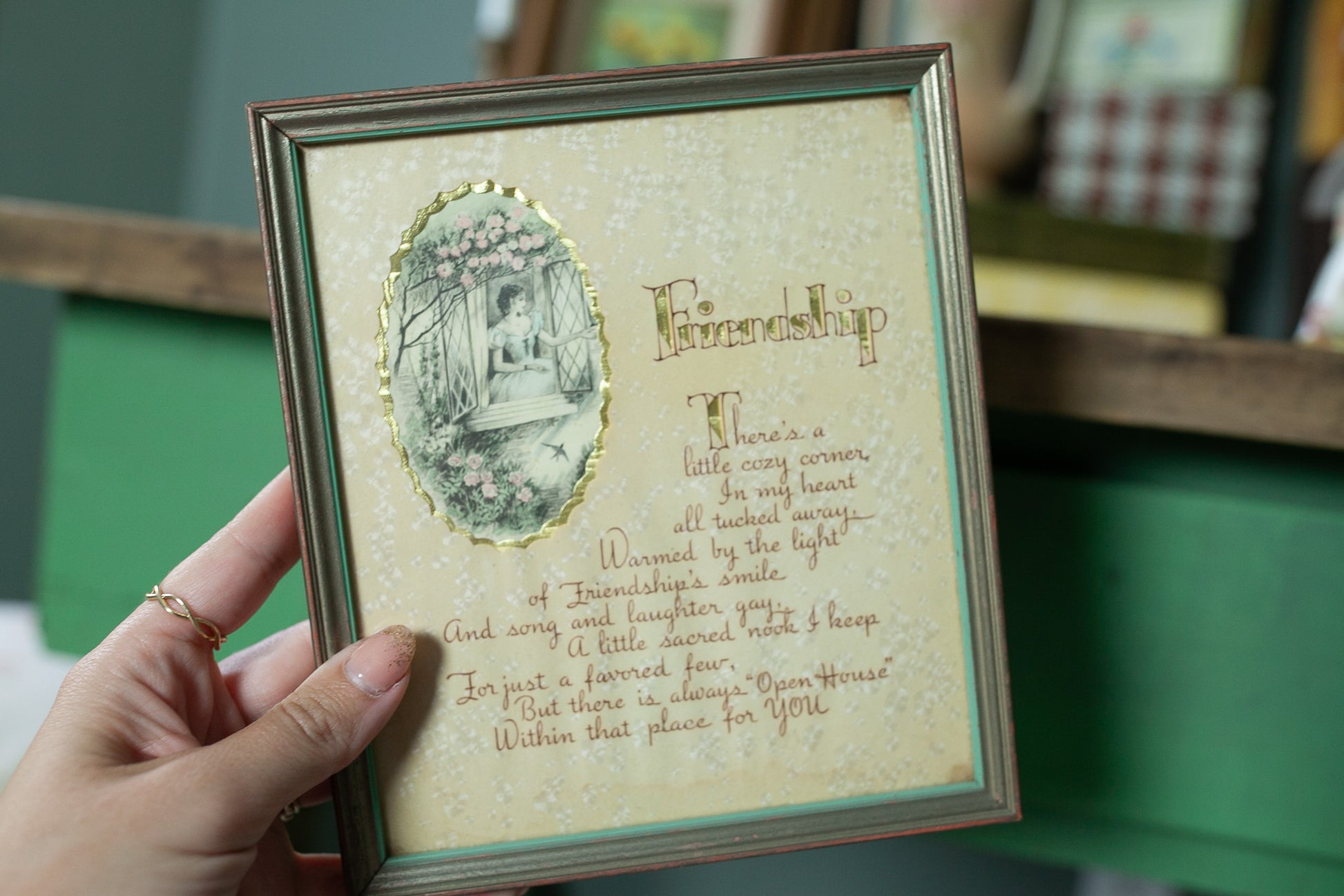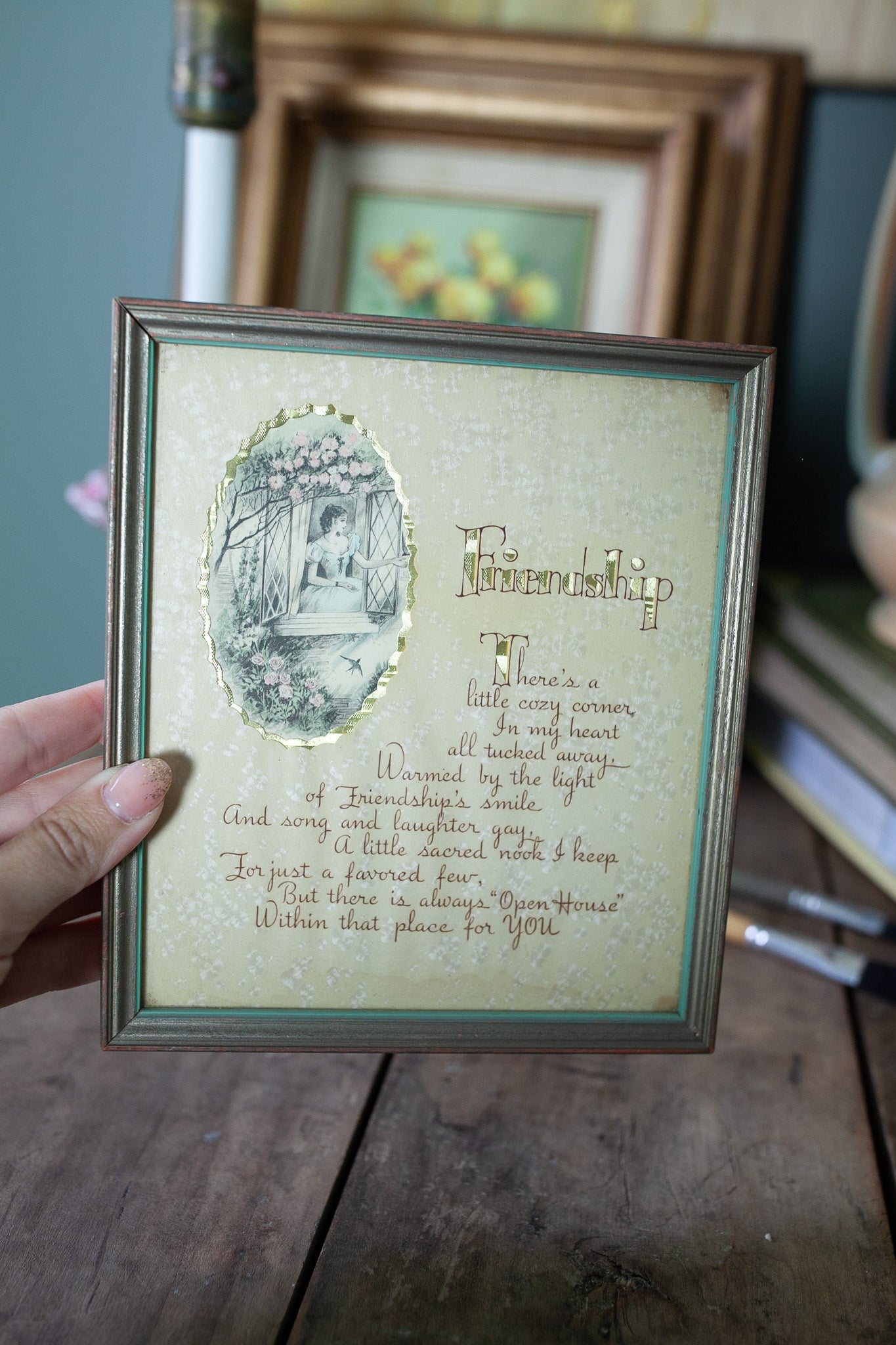 20s Buzza Friendship Framed Poem “There’s a little cozy corner…” 6.5”w x 7.5”h x 1/2”d wooden frame w glass