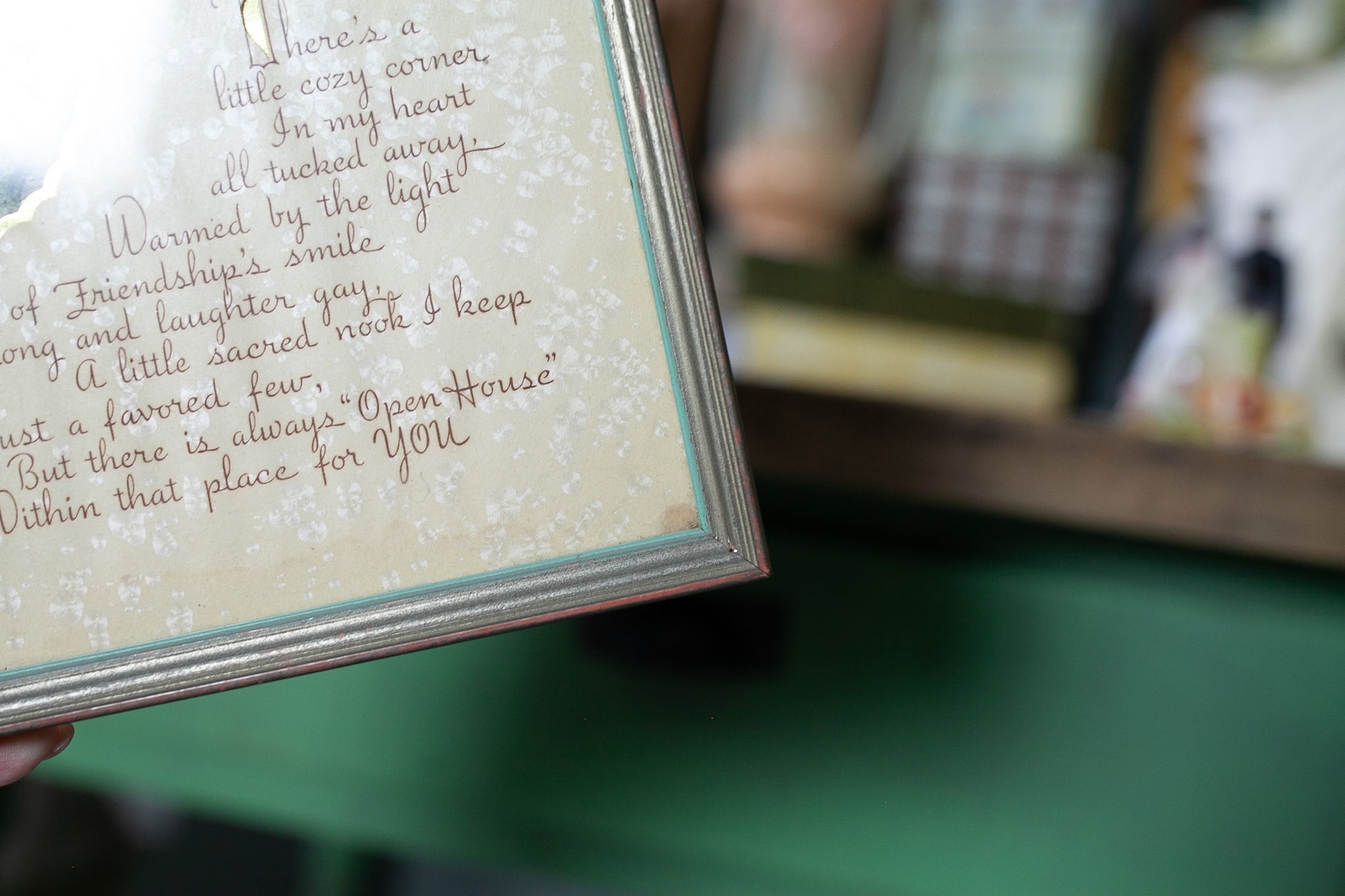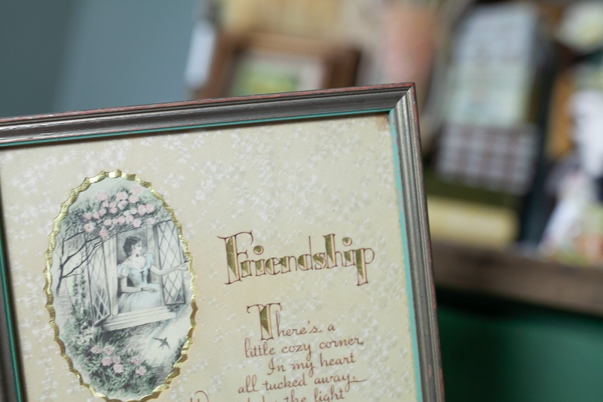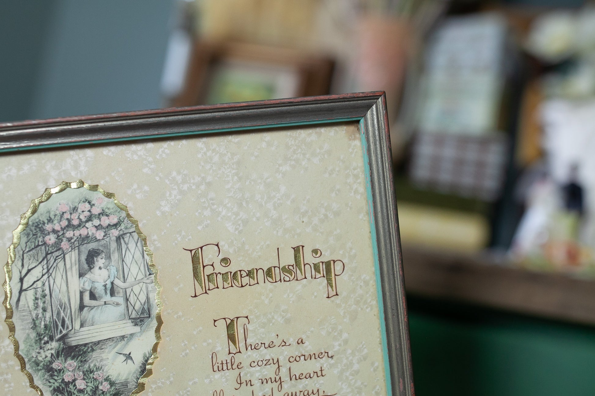 20s Buzza Friendship Framed Poem “There’s a little cozy corner…” 6.5”w x 7.5”h x 1/2”d wooden frame w glass