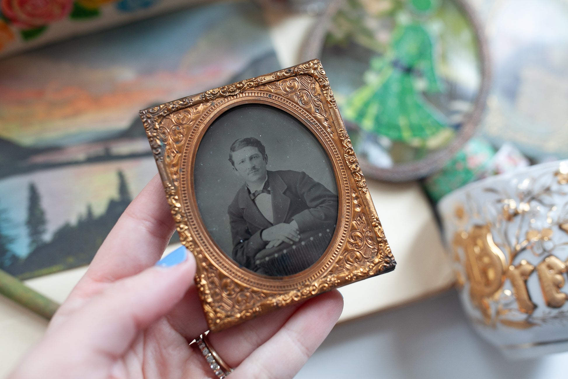 This framed portrait is of a man in a dapper outfit with a mustache and inside of a gold ornate frame that is about 2.75" wide by about 3.25" tall . Wouldn't you love to know his story?!