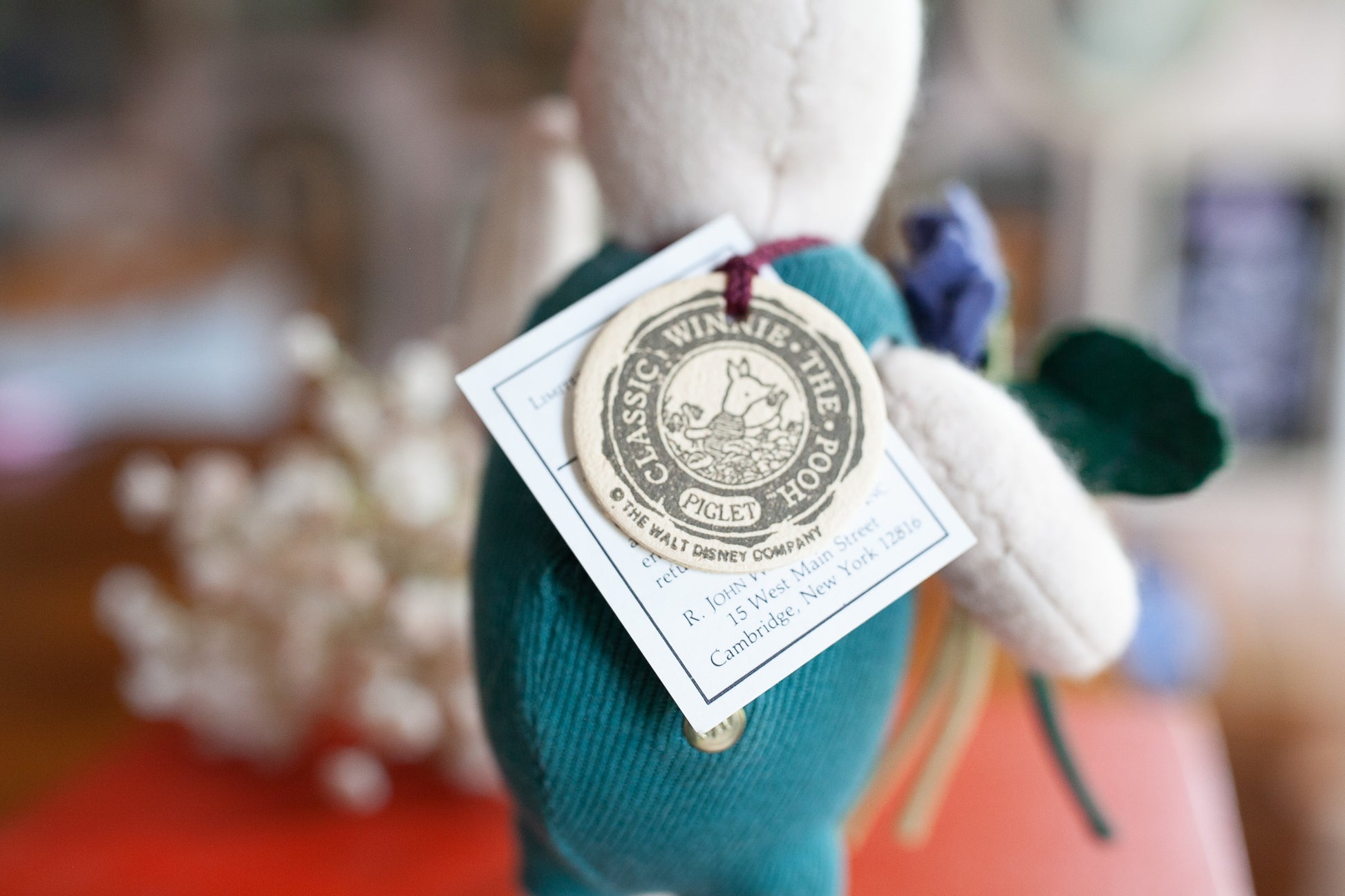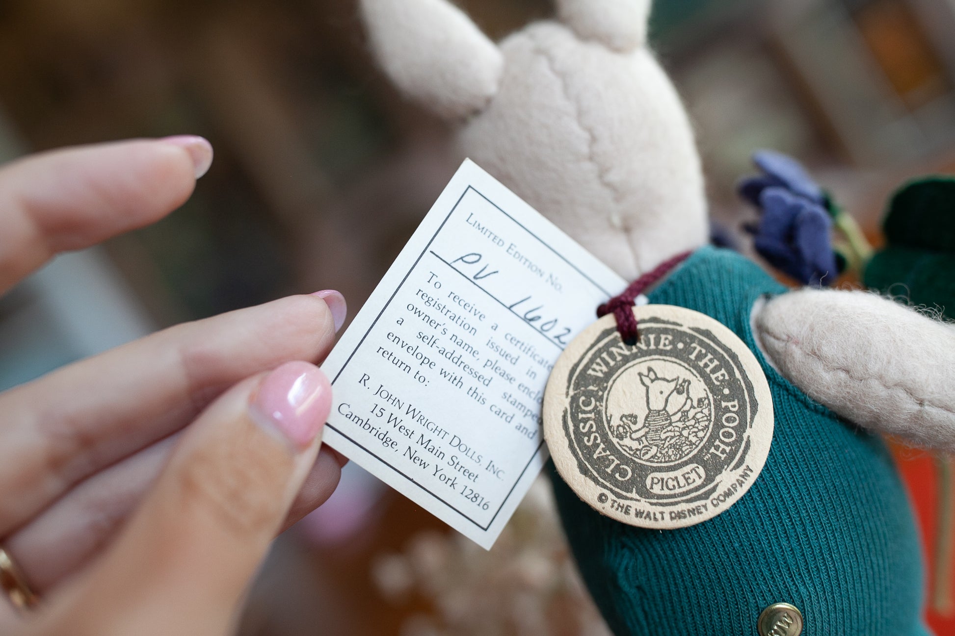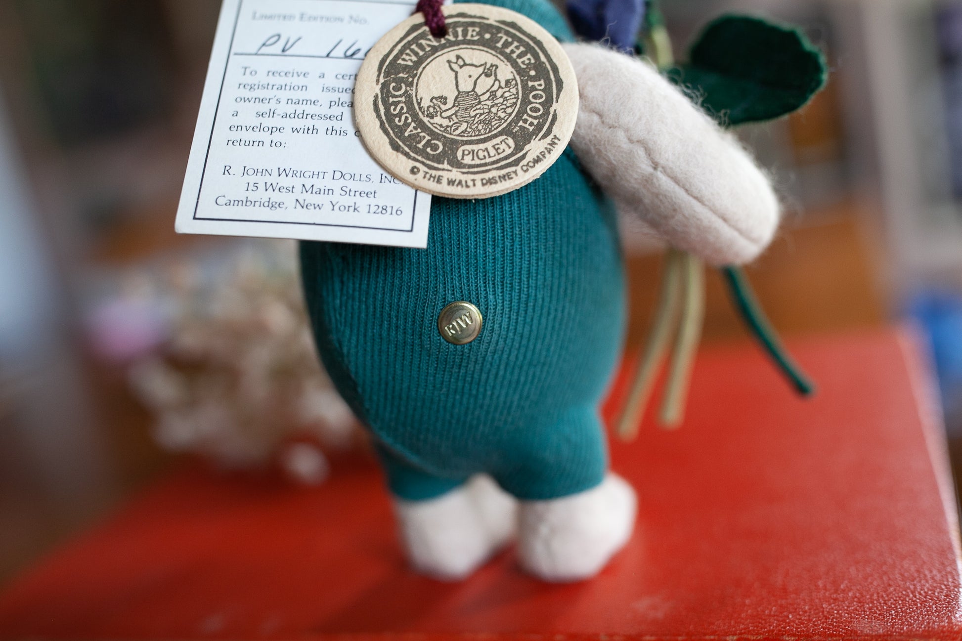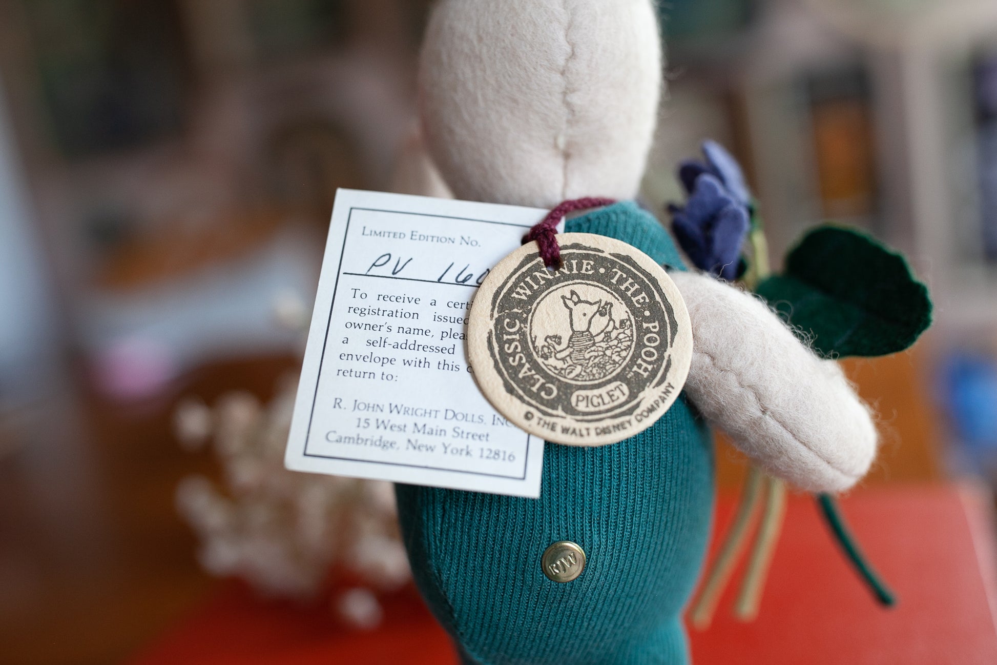 Vintage Piglet is the cutest thing! He is holding some violets and is just as charming as can be! He has a teal jumper on and his RJW brass tag as well as the arm tag, the id tag stating he is a limited edition PV1602 handwritten on the tag and has a Walt Disney round tag. He is about 8.5" tall. Overall great condition.
