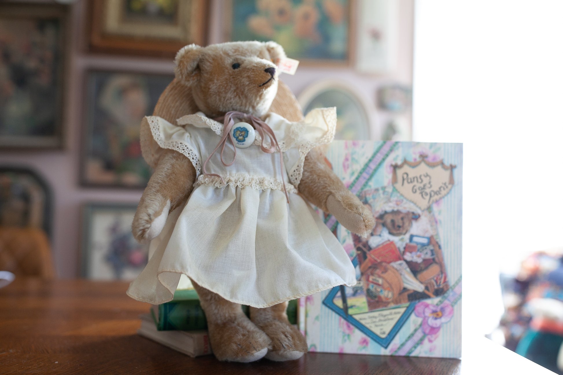 "Pansy Goes To Paris". The Steiff Company reproduced the antique bears to go with the books. "Pansy Goes to Paris", is the third book in the series. First book, was "Safari" and "Journey Up the Nile", by the Steiff Bear Reginald Oliver Smythe, The last book, by Clarence the Bear, "Clarence Goes to "The Chelsea Flower Show". (667992 - Pansy 00195)