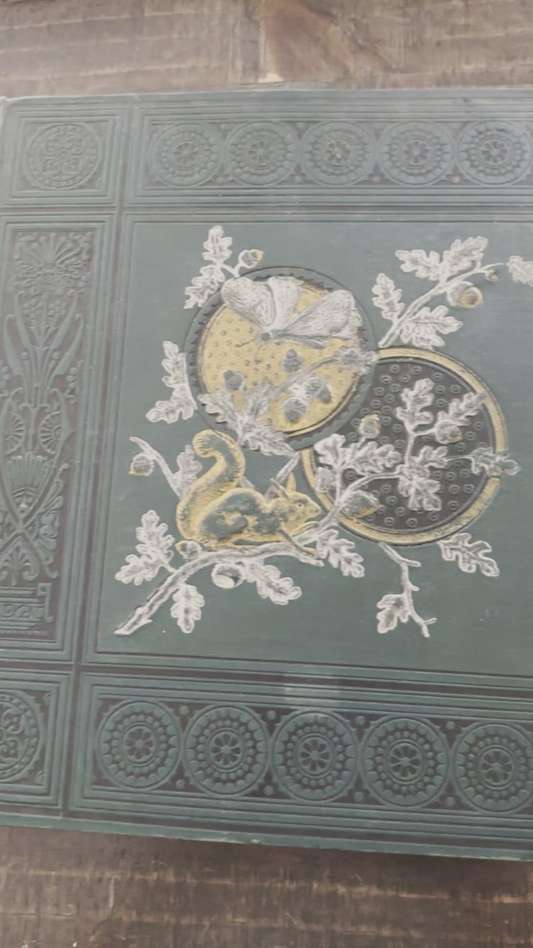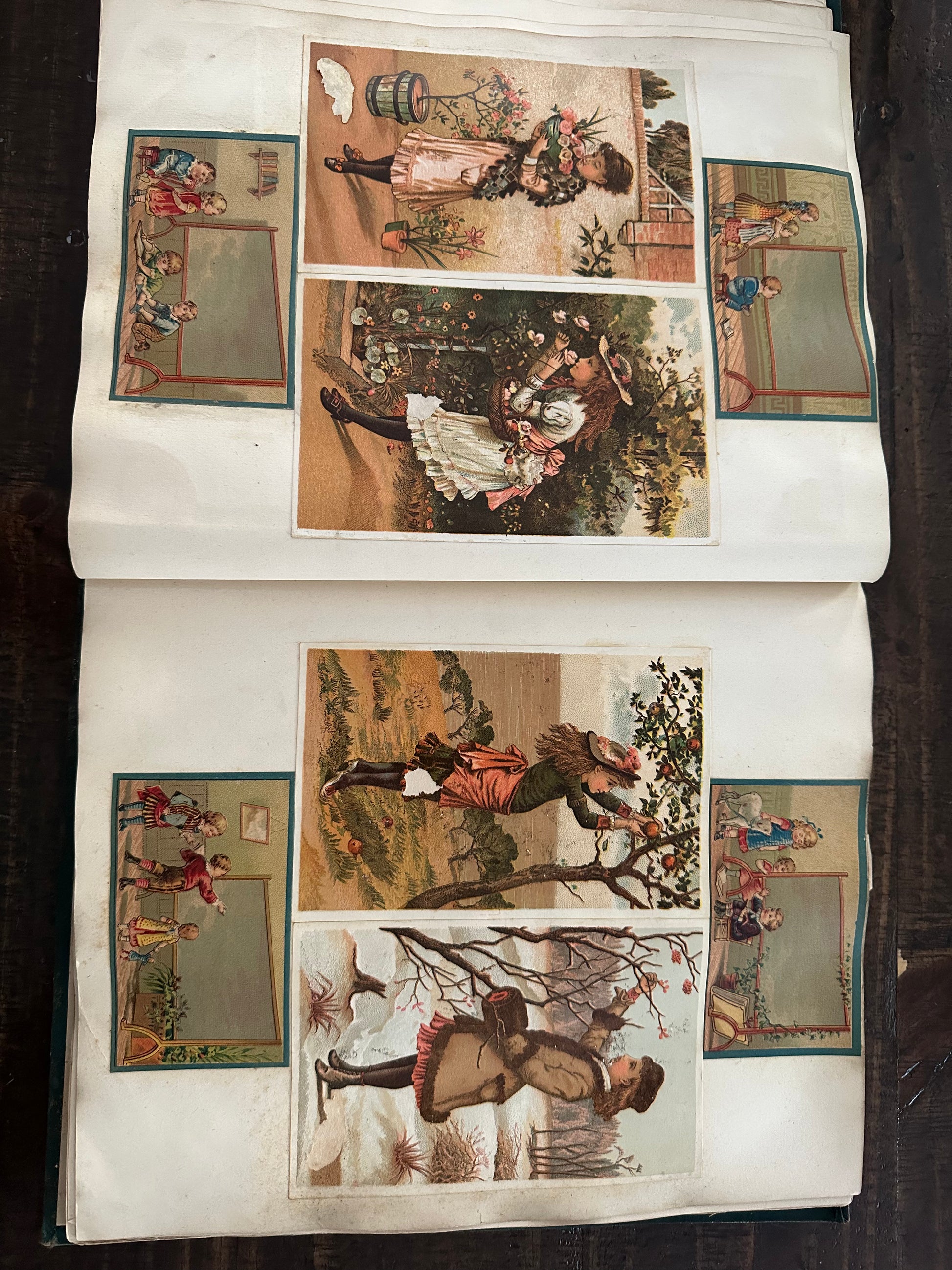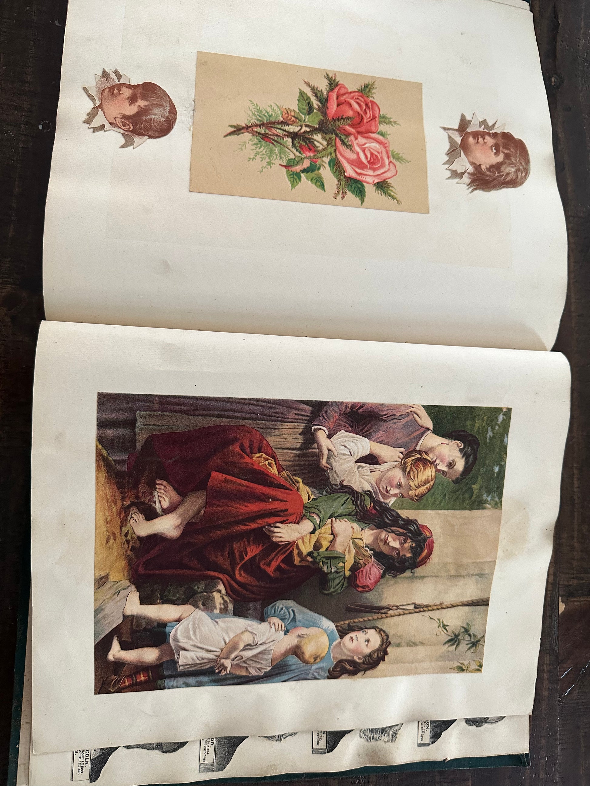 The most amazing antique scrap book! It’s just stunning! It is inside a green leather cover that has a squirrel on it. The book inside is not connected to the cover really anymore, but the pages are still fairly well bound to each other! The book is full of amazing little pictures! They are mostly glued in a few loose pieces. The pages are fragile- there are small bits of paper that will fall off in transit please understand the fragility of the book. It is about 12”x10”x1” thick- it is an amazing piece full of just stunning images and each one is so unique! It is not dated but the person had pasted in each president up to Chester Arthur 1881 and that is the current president at time of that photo- which leads me to assumptions that the book is from around that time as well. 30+pages