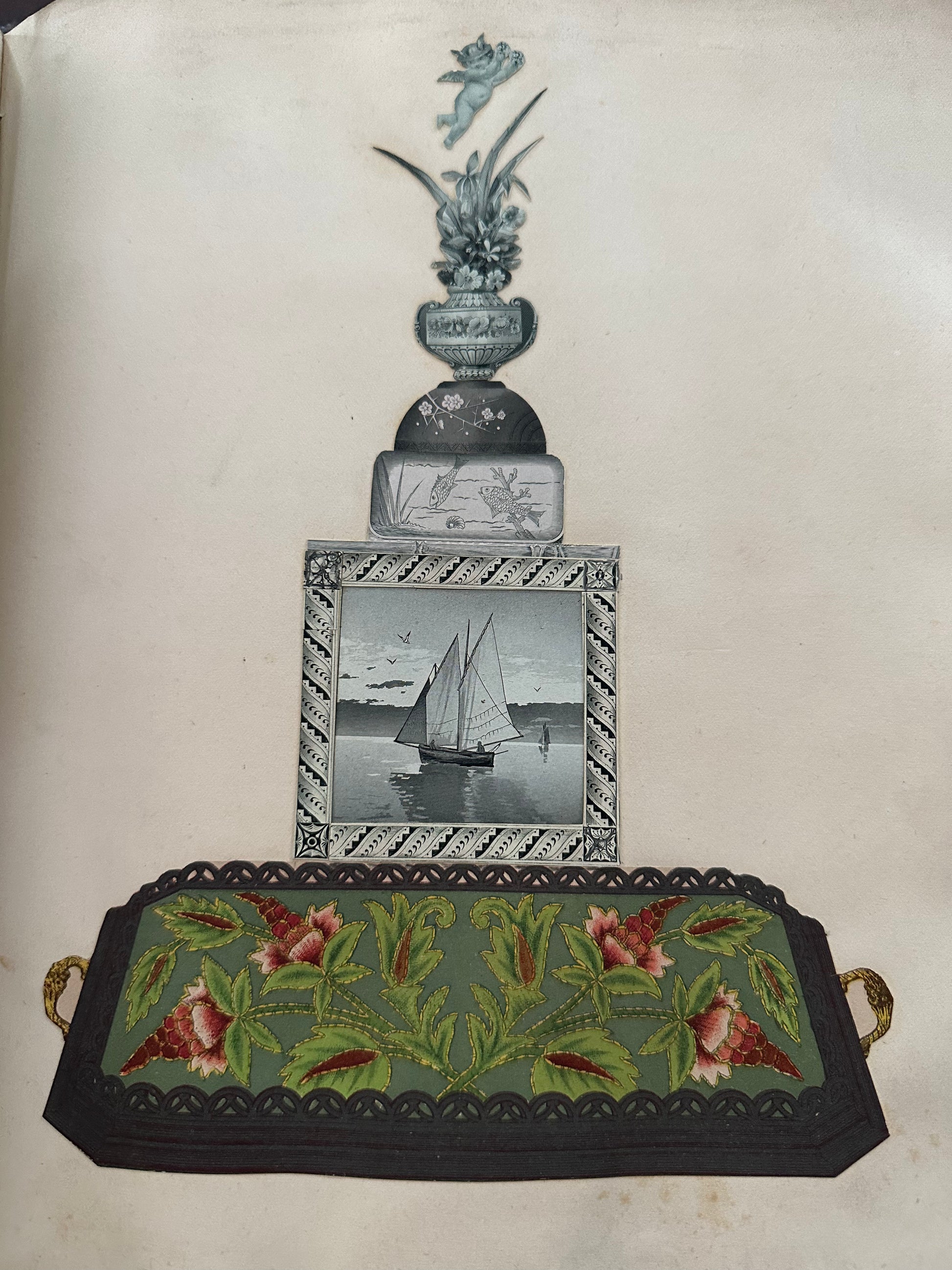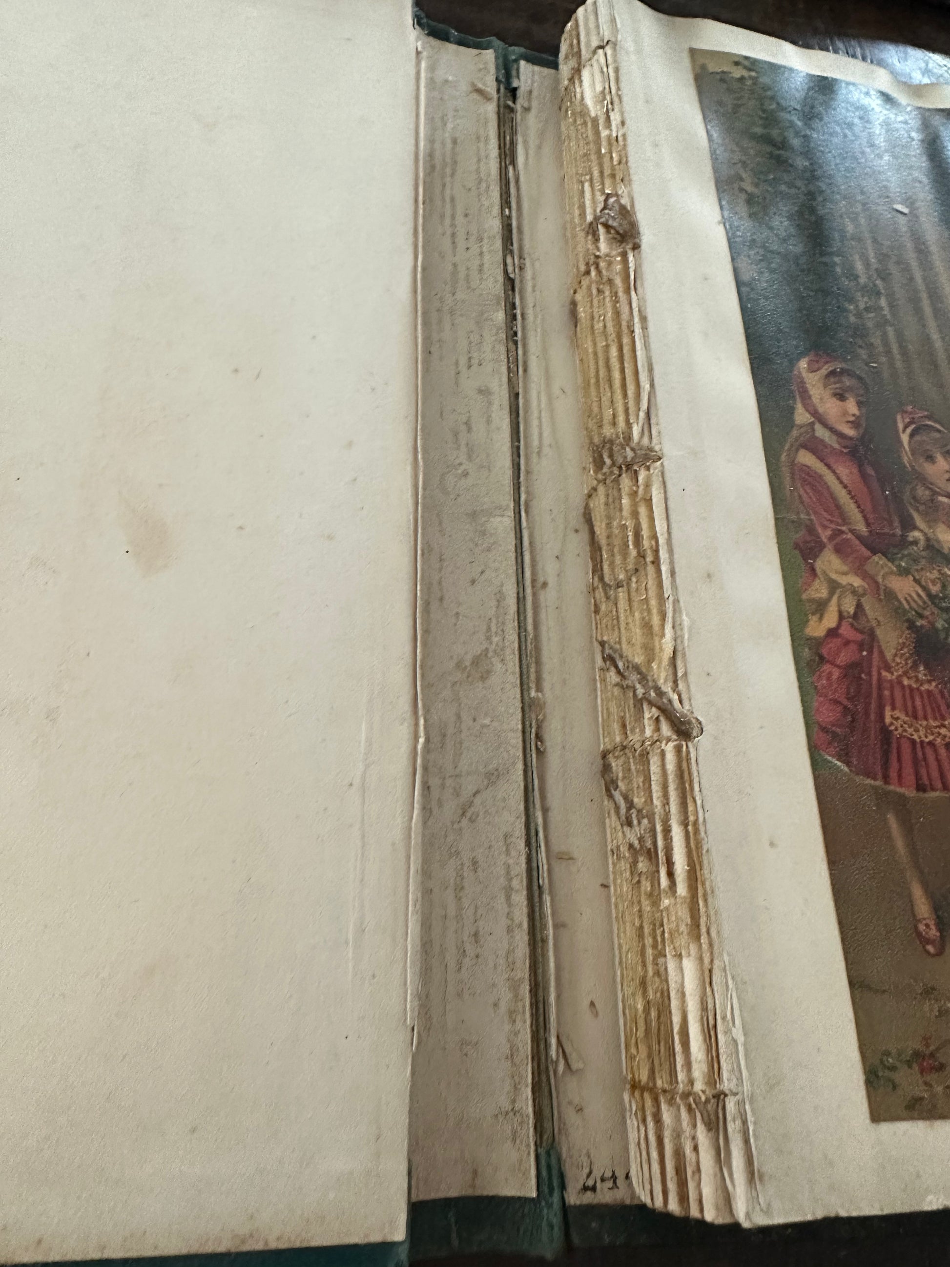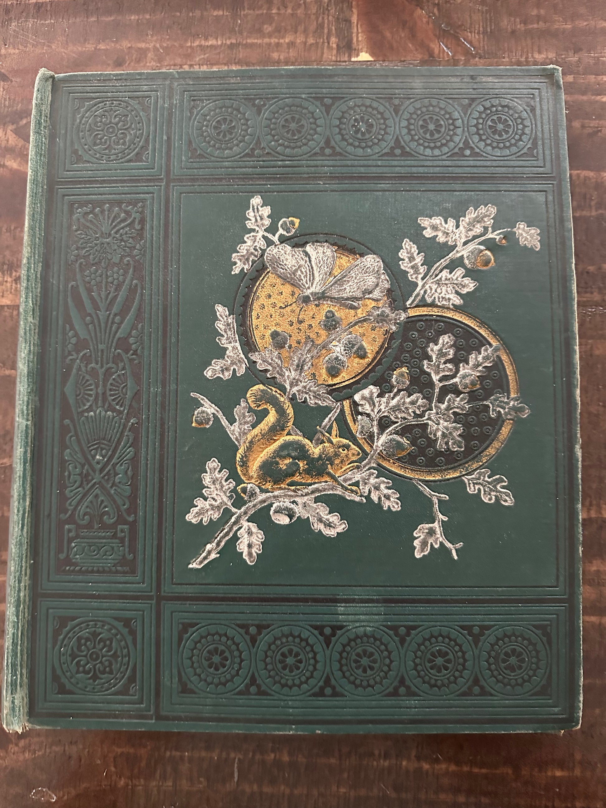 The most amazing antique scrap book! It’s just stunning! It is inside a green leather cover that has a squirrel on it. The book inside is not connected to the cover really anymore, but the pages are still fairly well bound to each other! The book is full of amazing little pictures! They are mostly glued in a few loose pieces. The pages are fragile- there are small bits of paper that will fall off in transit please understand the fragility of the book. It is about 12”x10”x1” thick- it is an amazing piece full of just stunning images and each one is so unique! It is not dated but the person had pasted in each president up to Chester Arthur 1881 and that is the current president at time of that photo- which leads me to assumptions that the book is from around that time as well. 30+pages