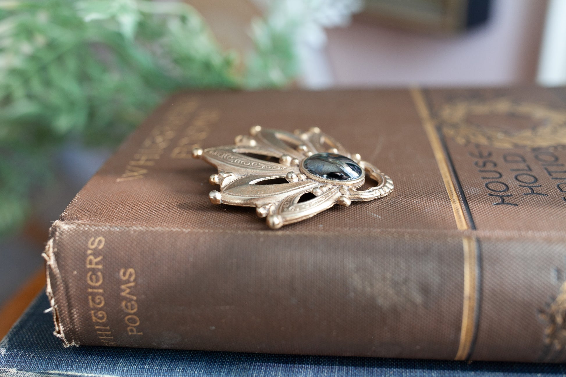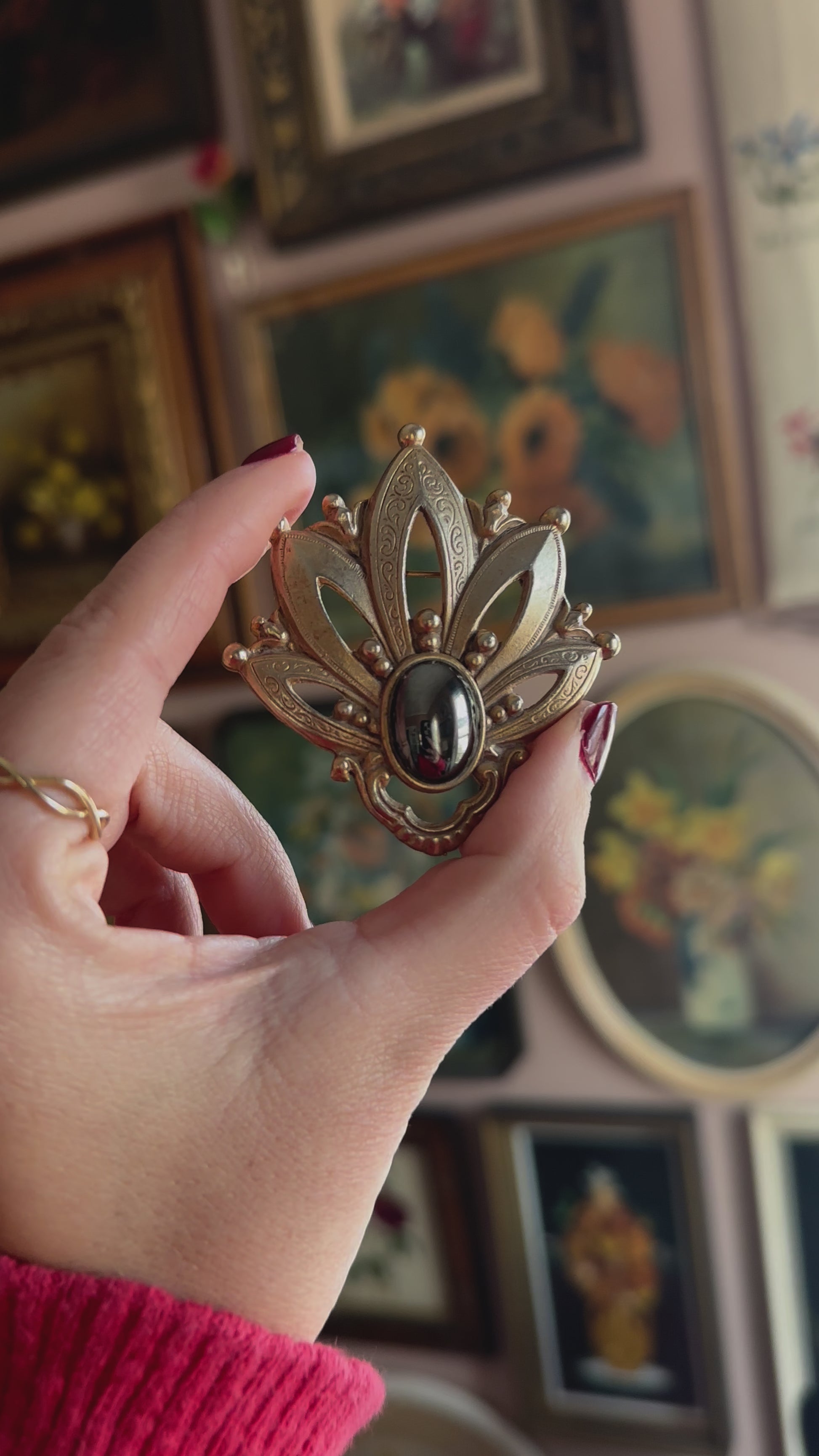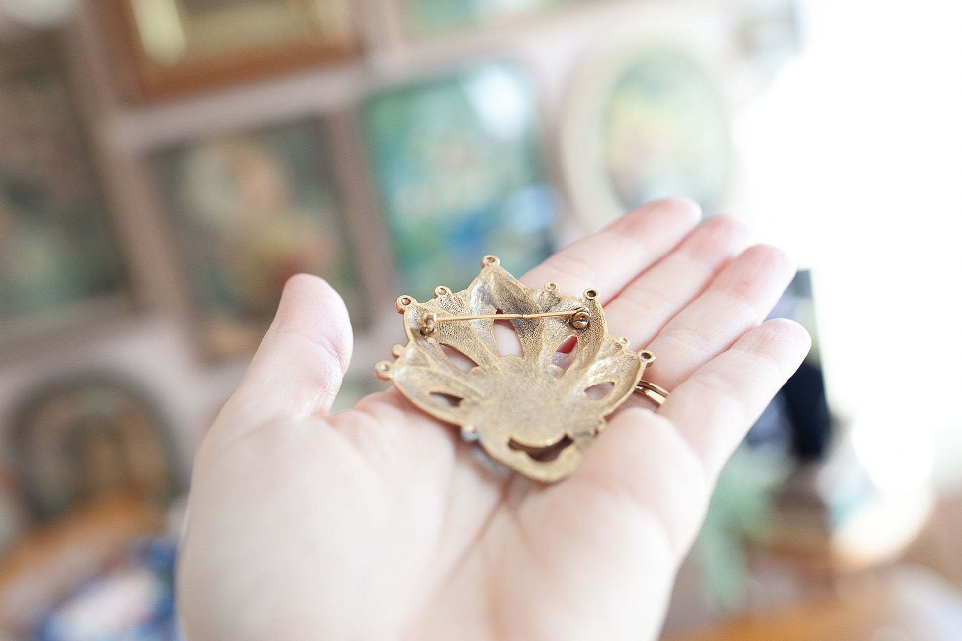 This is such a fun looking vintage brooch. Still in great shape and is about 2.5" tall by about 2.25" wide.