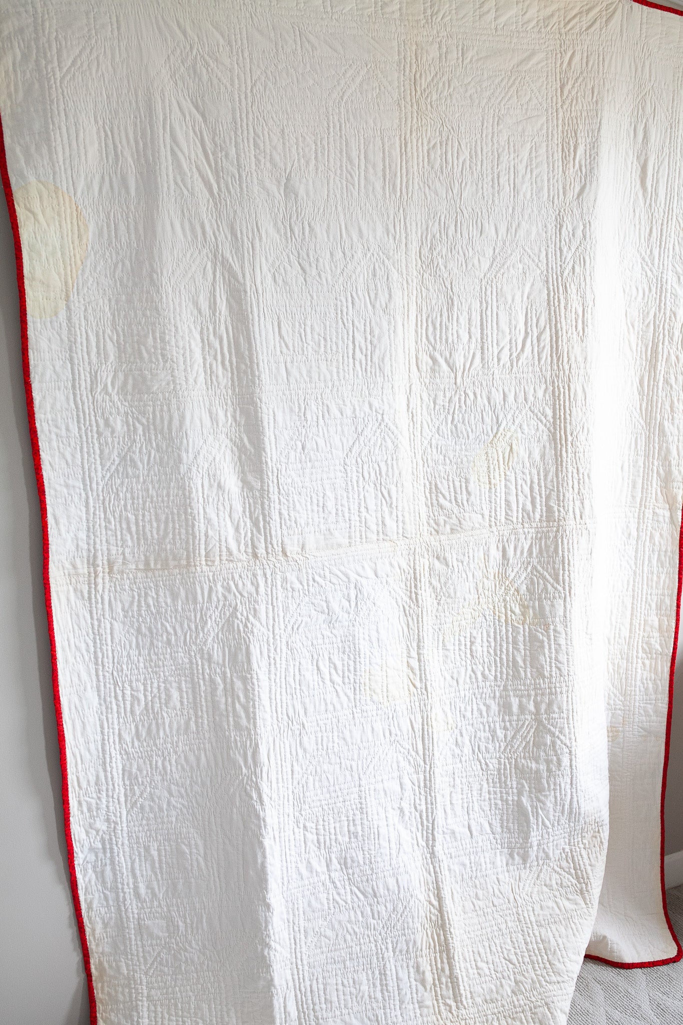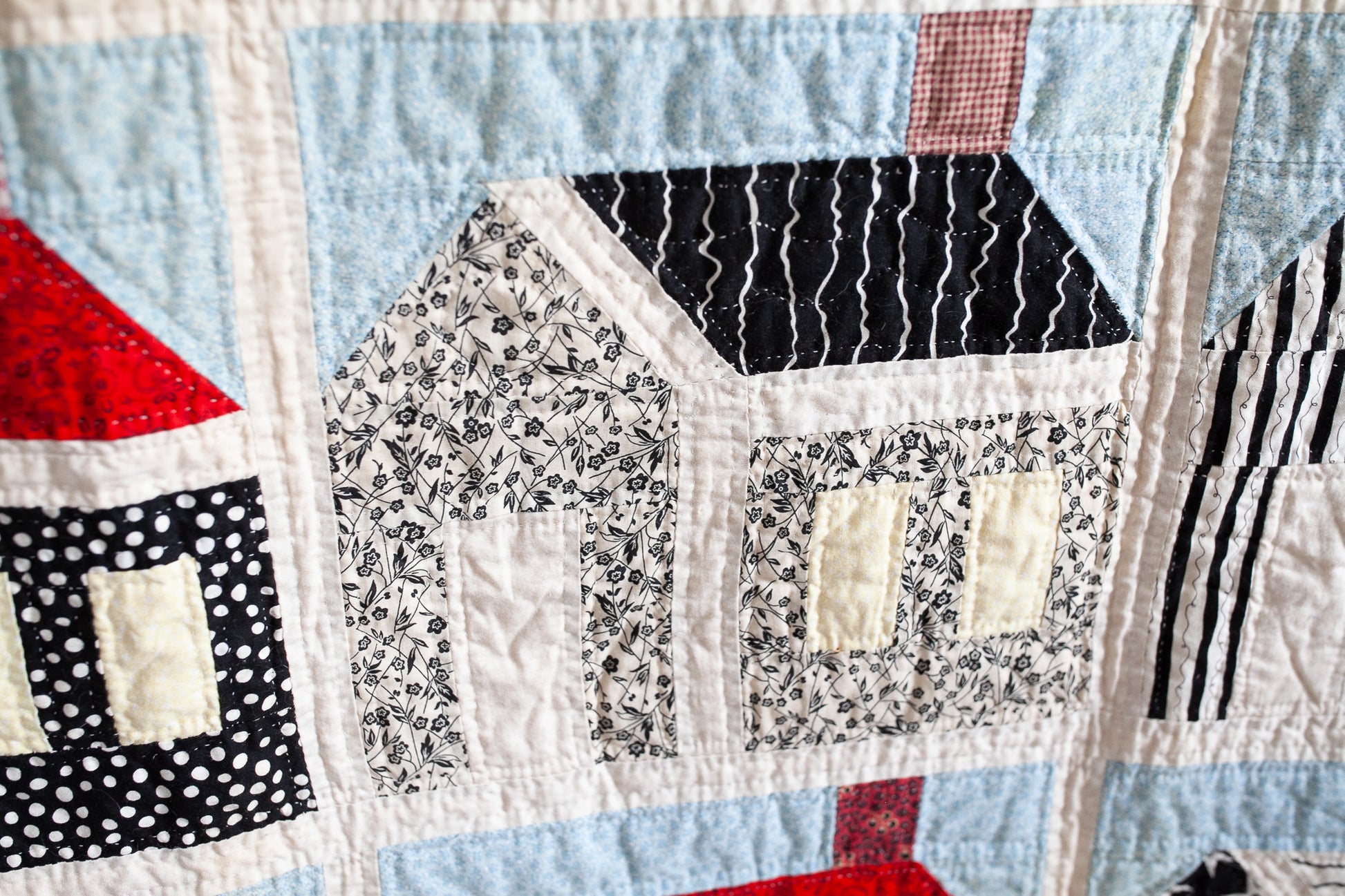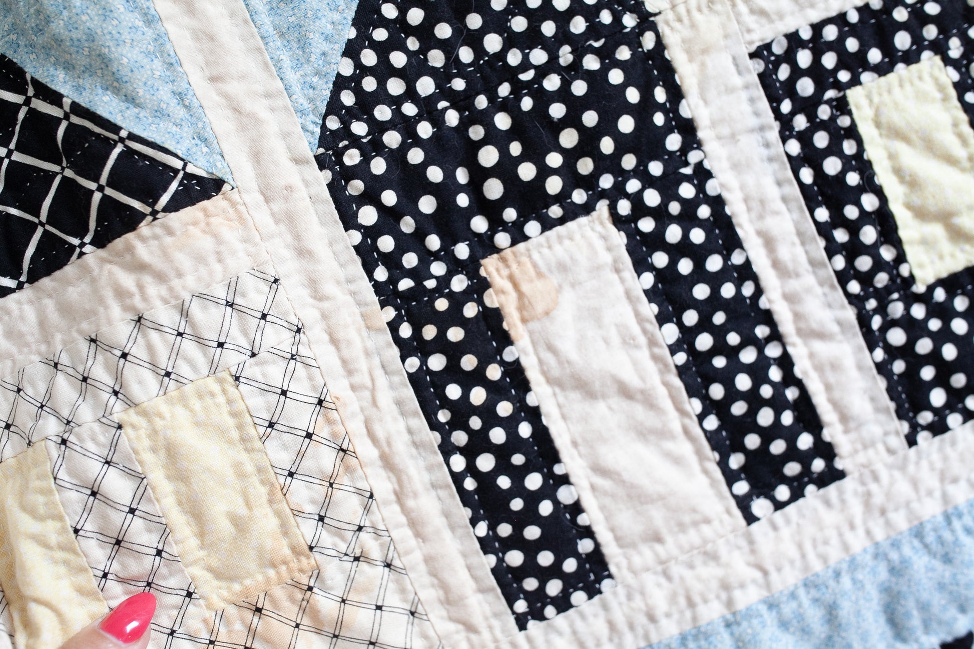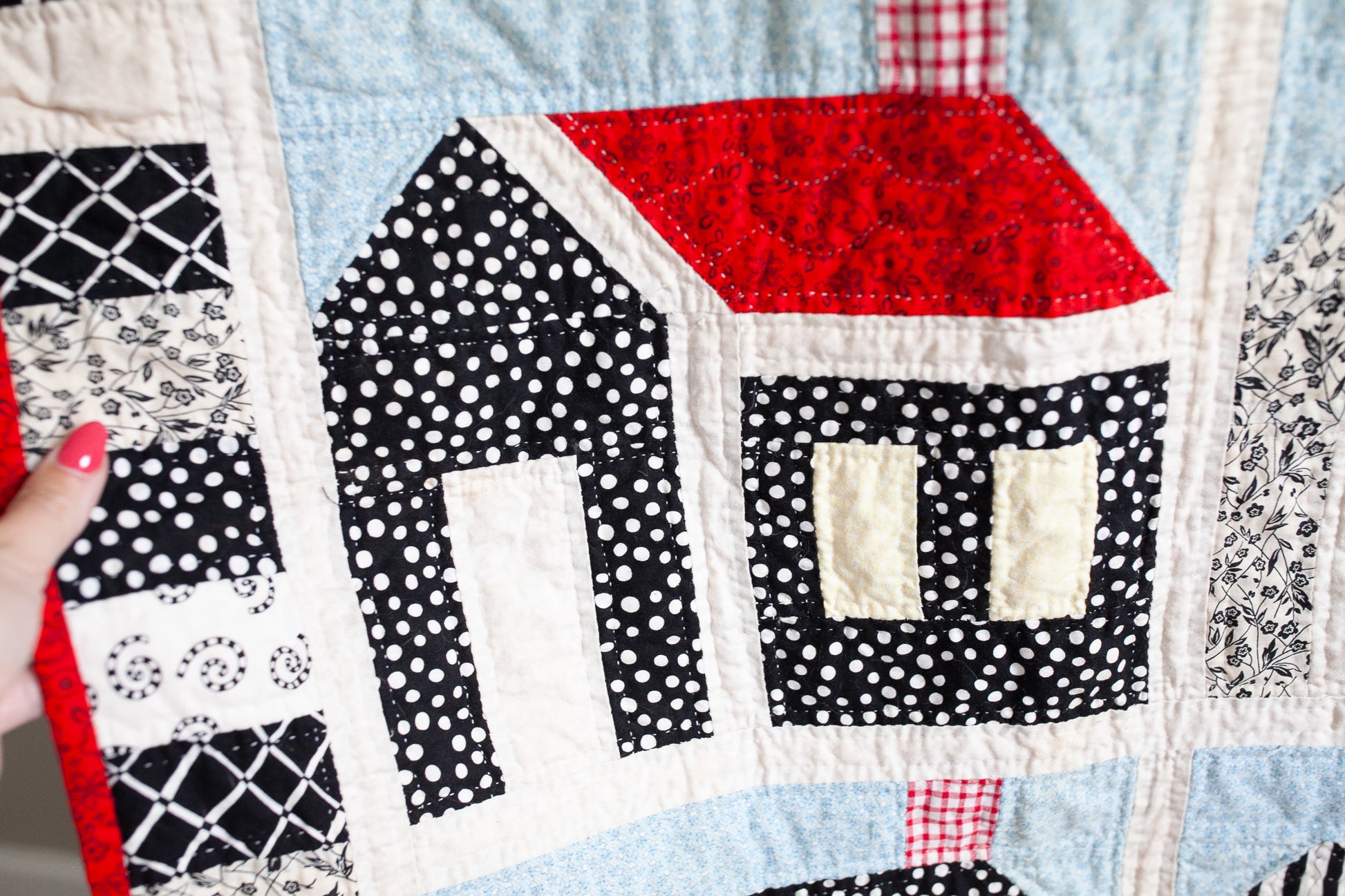 This quilt is adorable and is called a school house quilt! I love houses of any kind so this is one of my favorites! It does have some staining on the quilt, but no holes or worn areas of the fabric! It is about 58"x 84" approx in size. Cream backer with some staining as well.