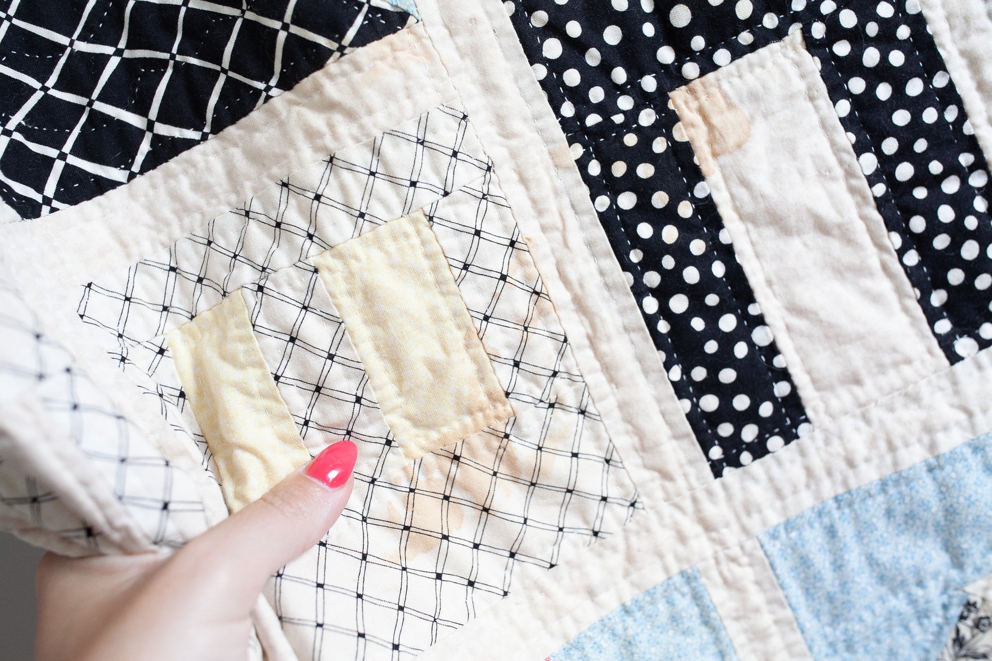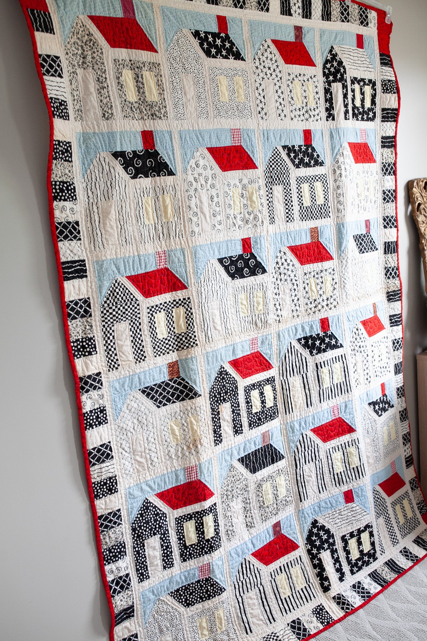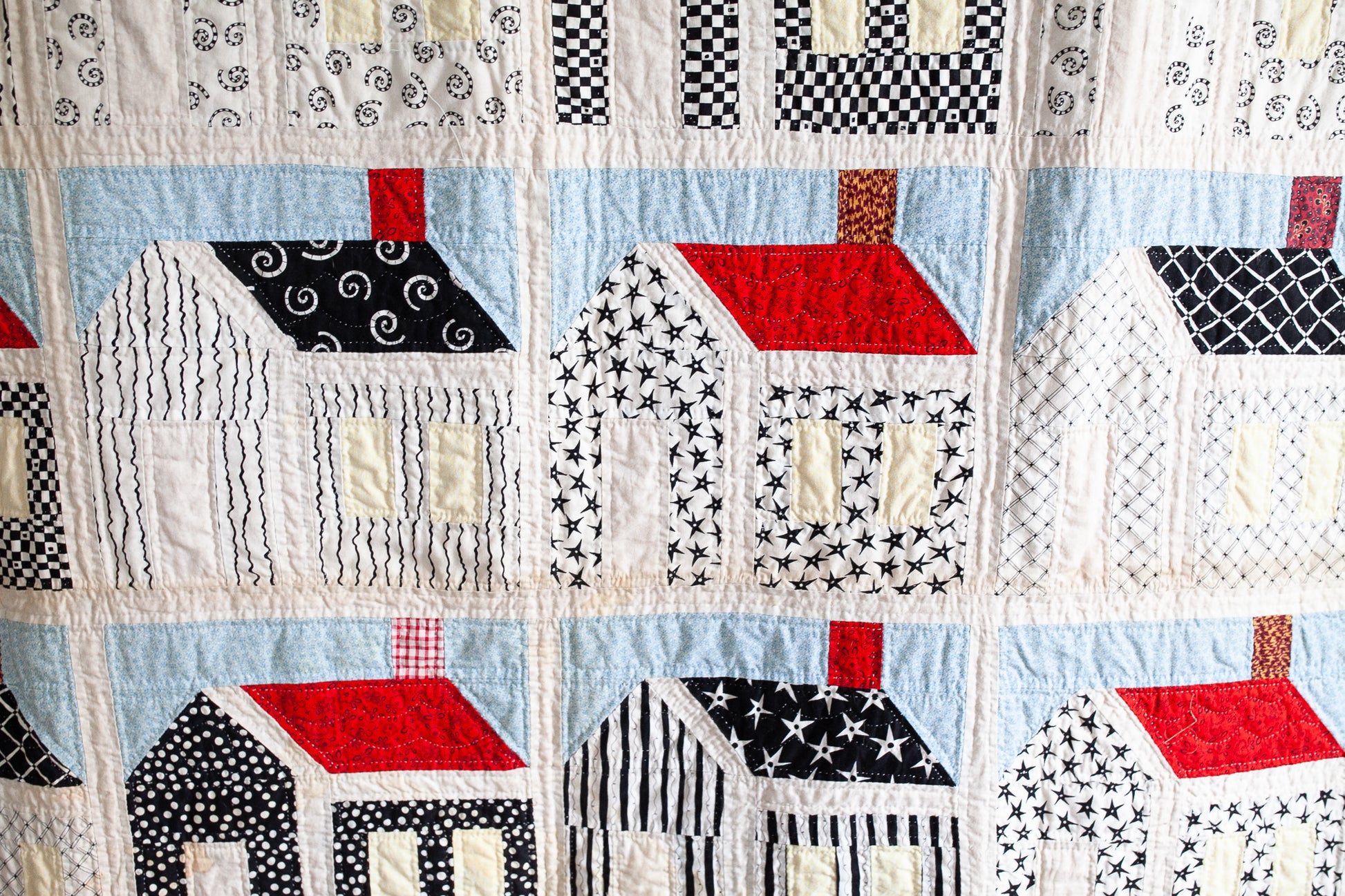This quilt is adorable and is called a school house quilt! I love houses of any kind so this is one of my favorites! It does have some staining on the quilt, but no holes or worn areas of the fabric! It is about 58"x 84" approx in size. Cream backer with some staining as well.
