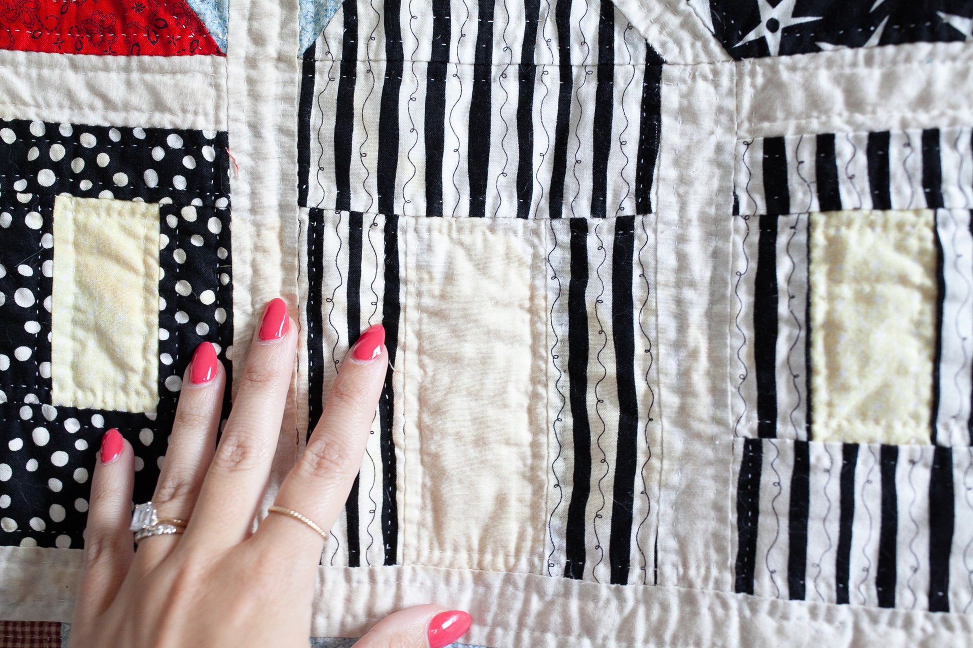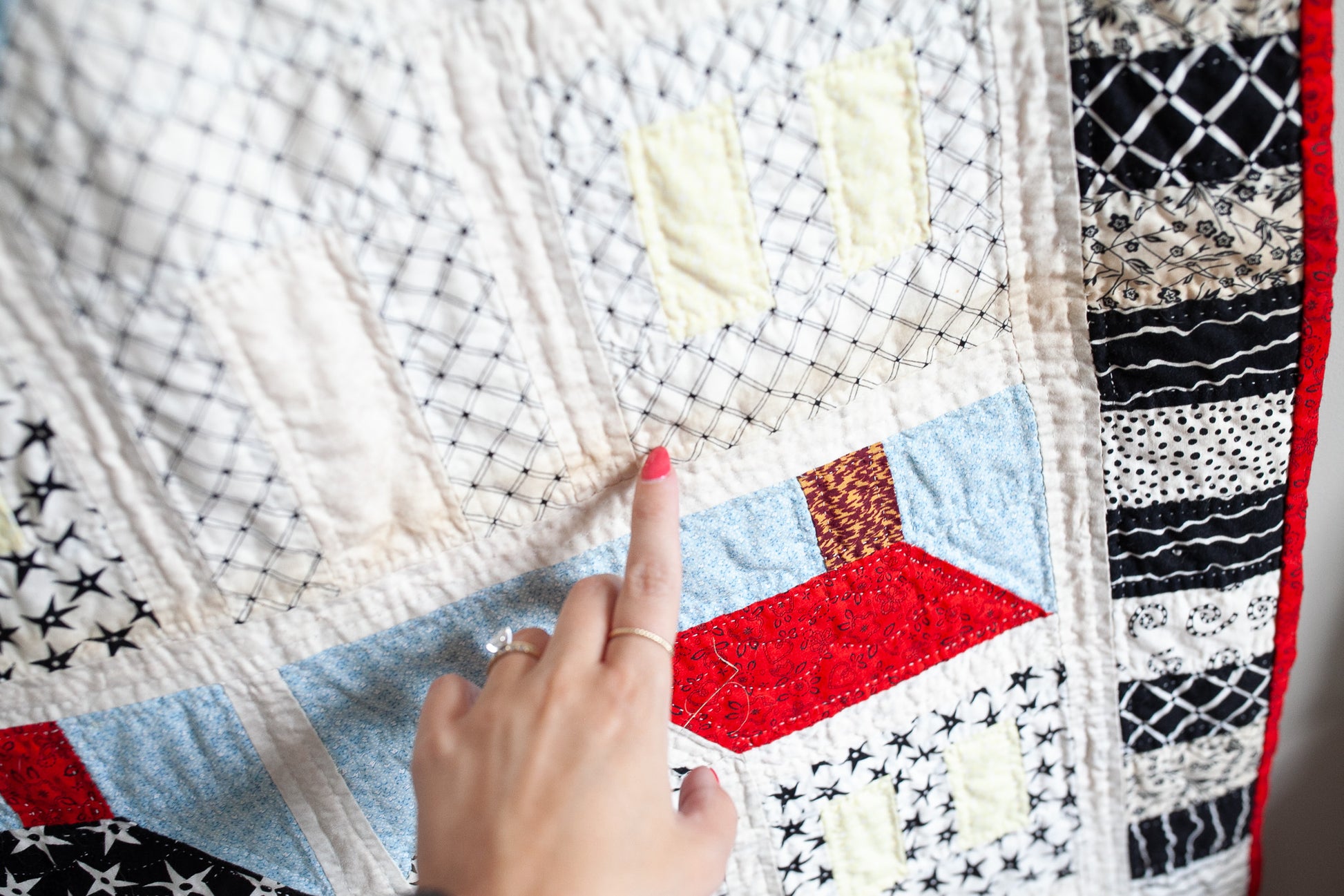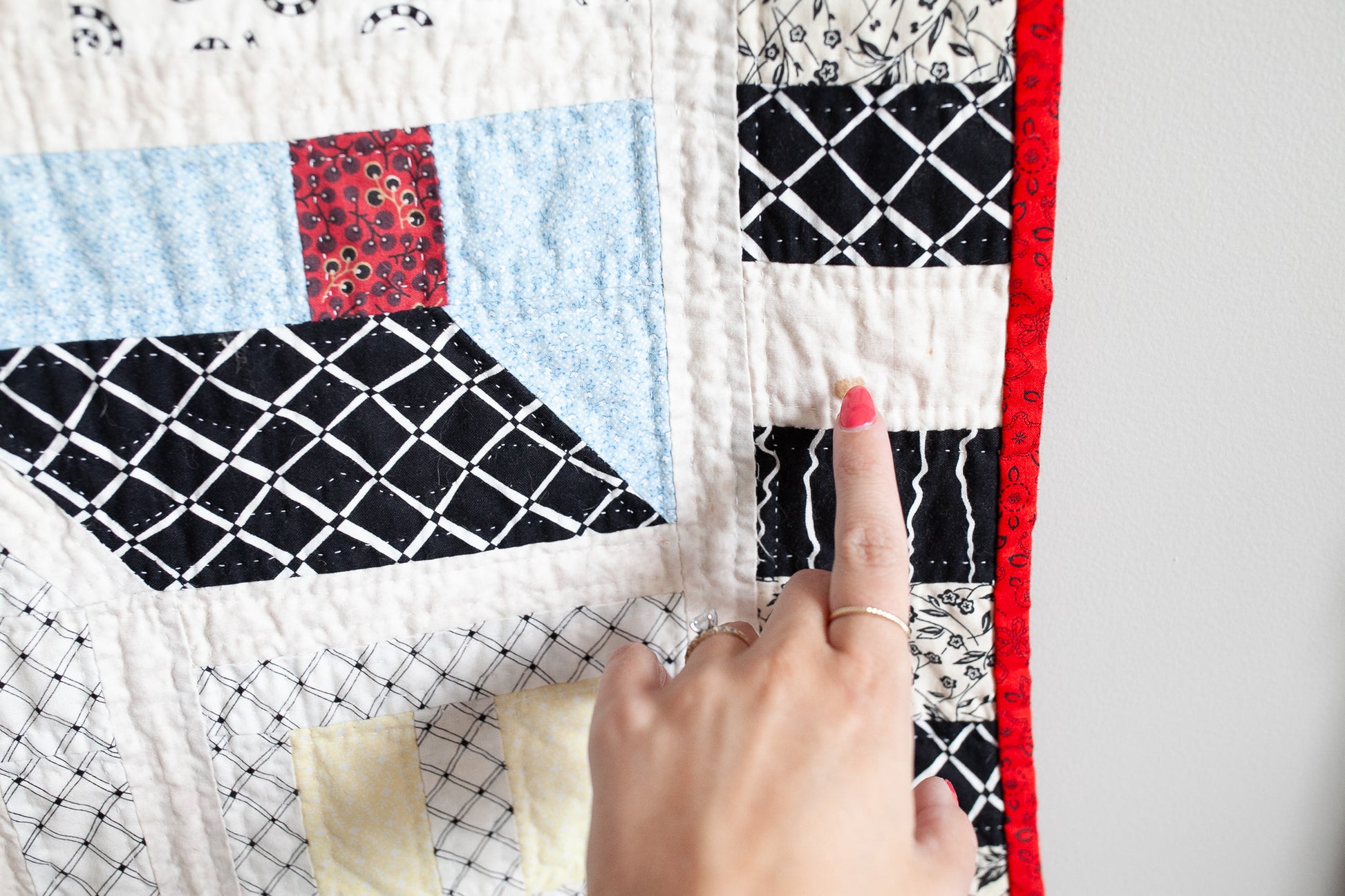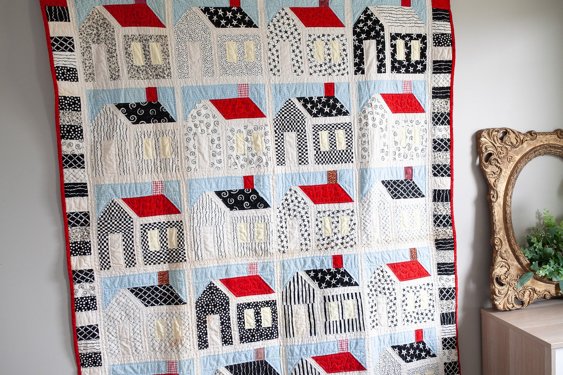 This quilt is adorable and is called a school house quilt! I love houses of any kind so this is one of my favorites! It does have some staining on the quilt, but no holes or worn areas of the fabric! It is about 58"x 84" approx in size. Cream backer with some staining as well.