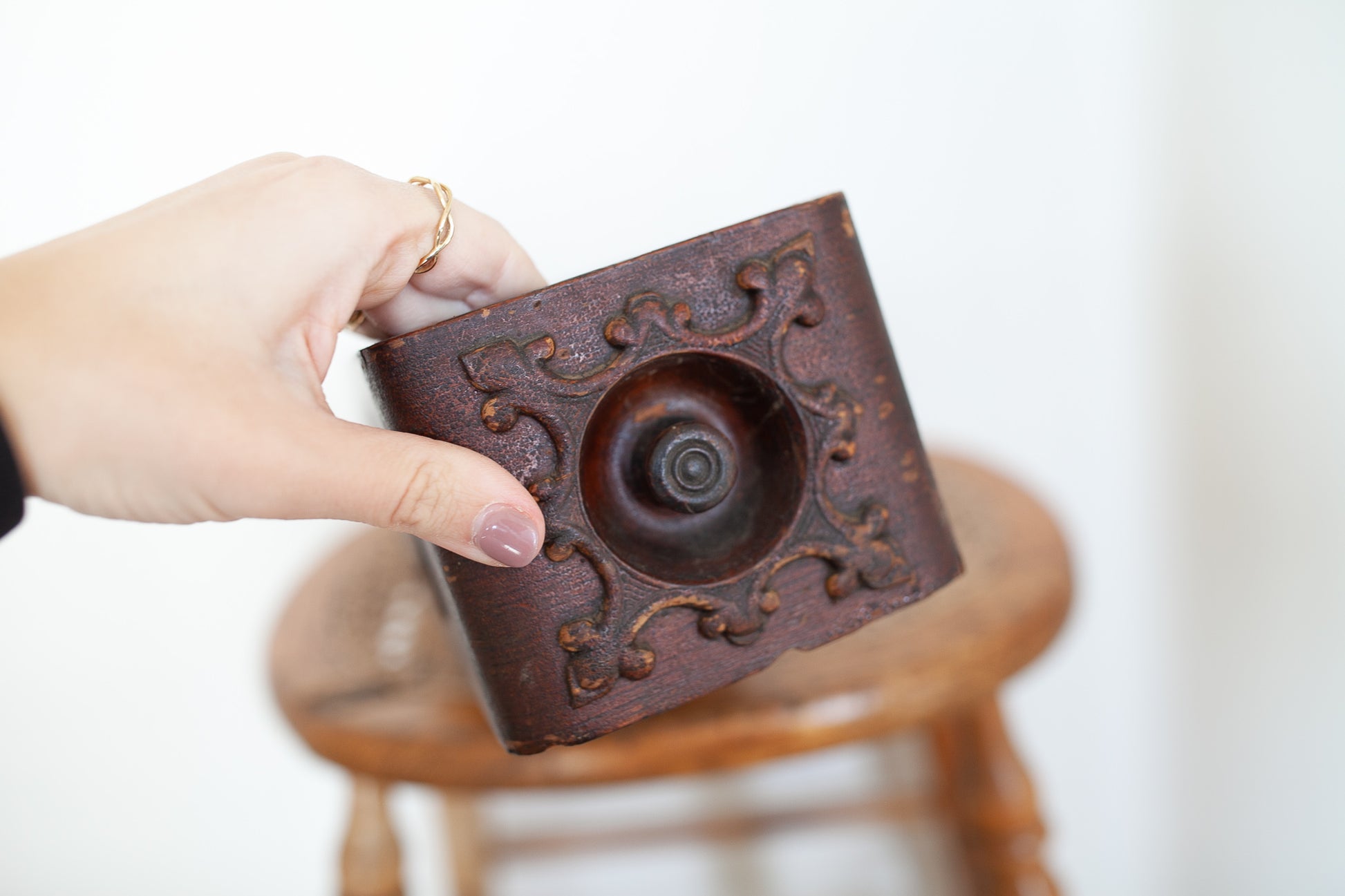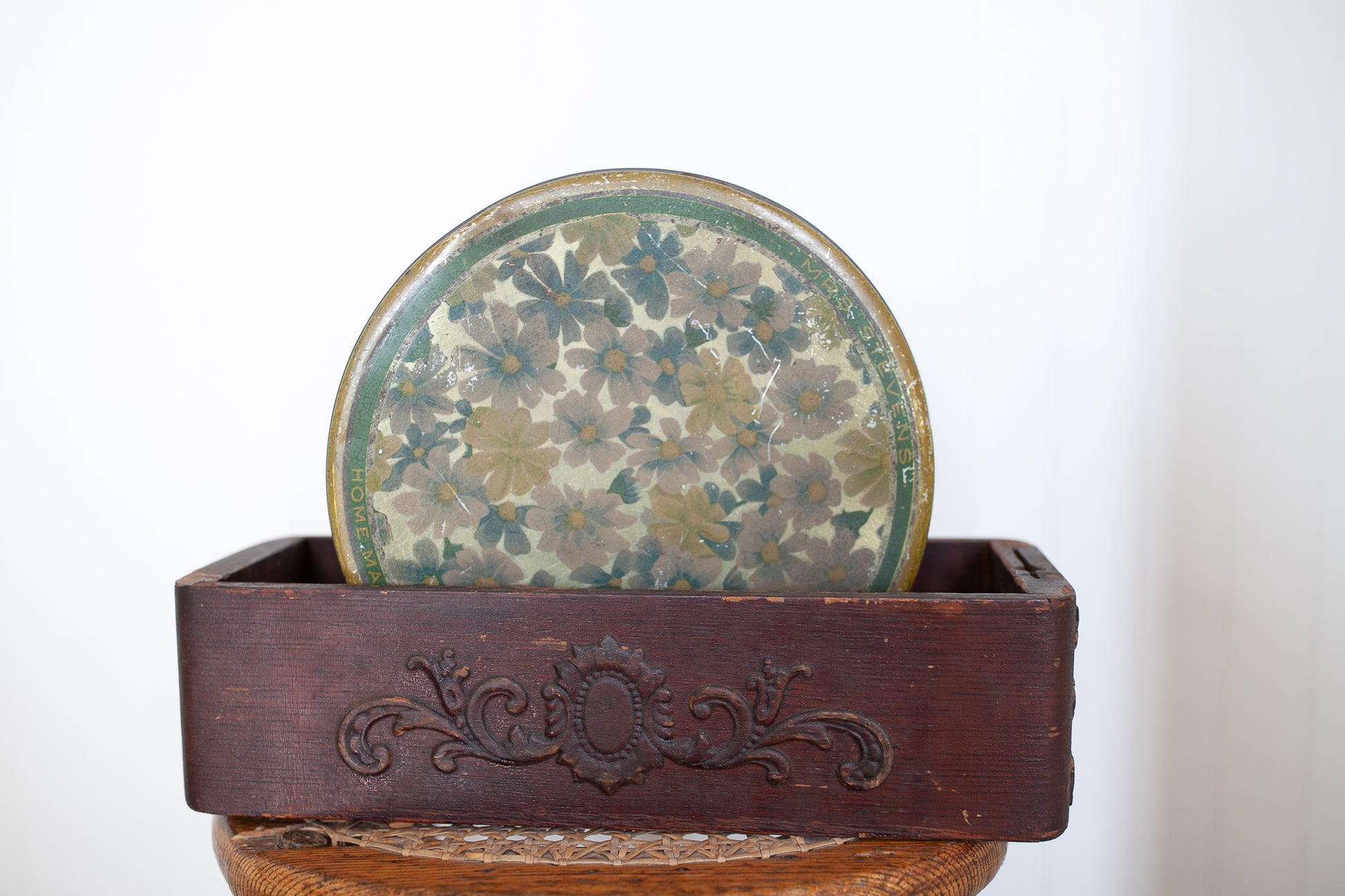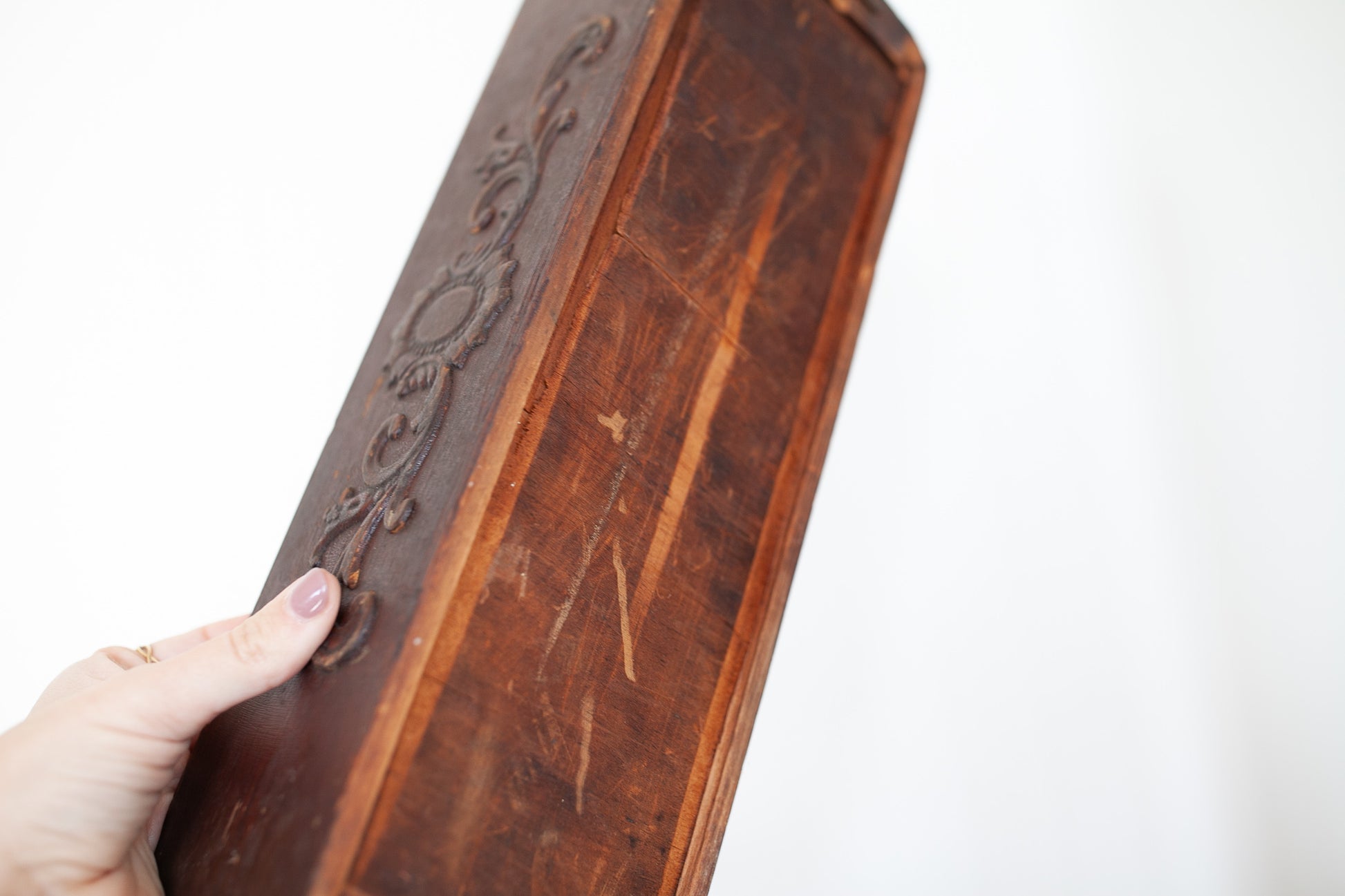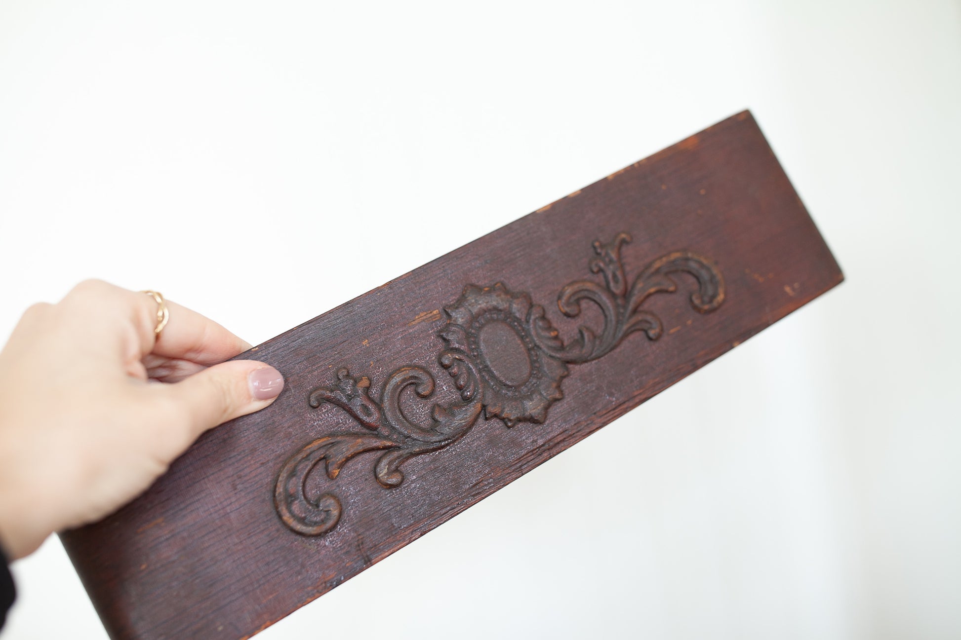 This little drawer is a great one! It was once from a sewing machine and now makes the perfect decor item! Stack it or flip it over and use it as a riser to display something or fill it with some greenery or books! So many options! This drawer 14.5" long and about 4.75" deep. It has the pretty detailing on one length of one side and has a pretty front. The wood has a little light chipping, but overall in good shape.