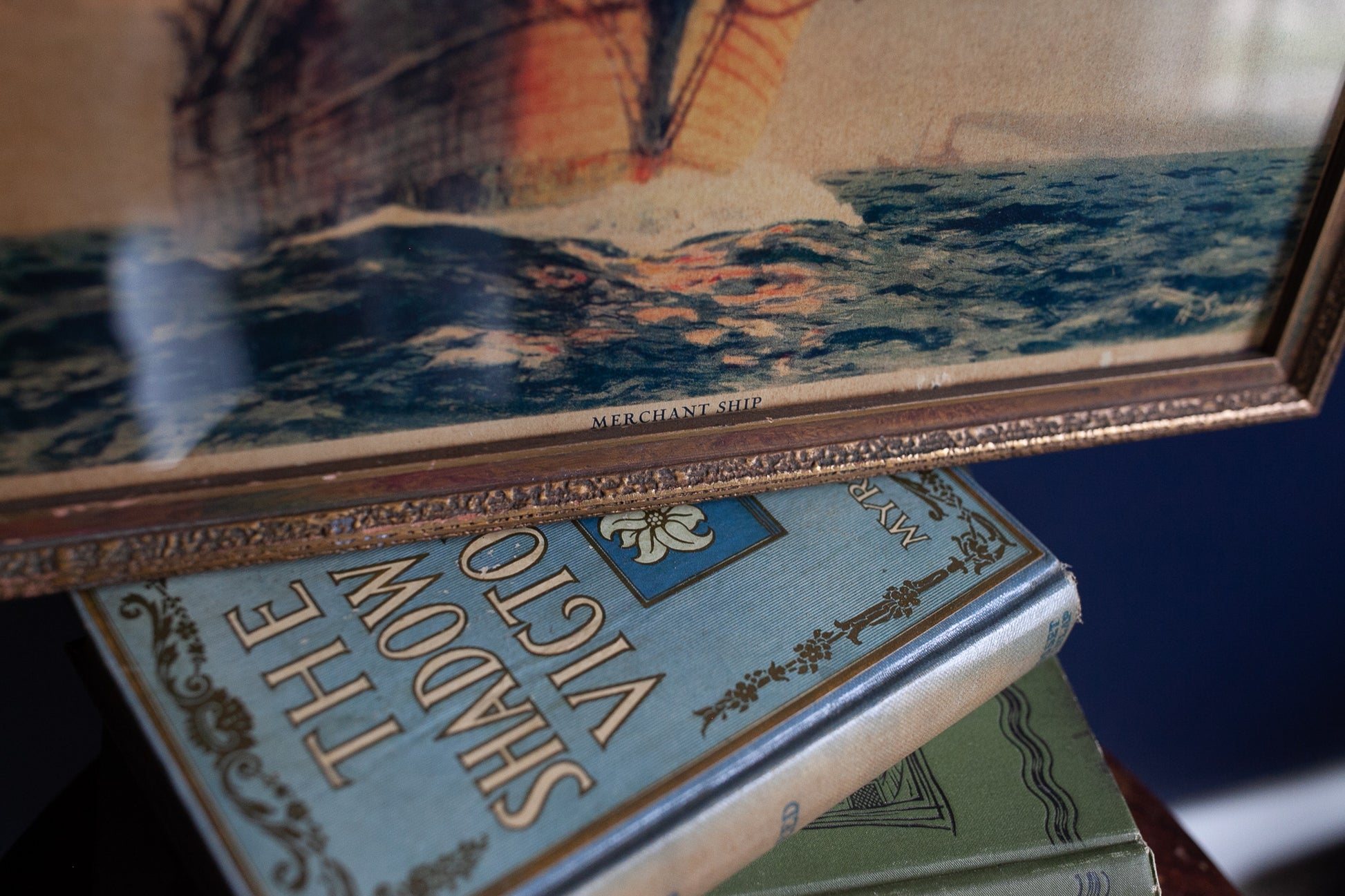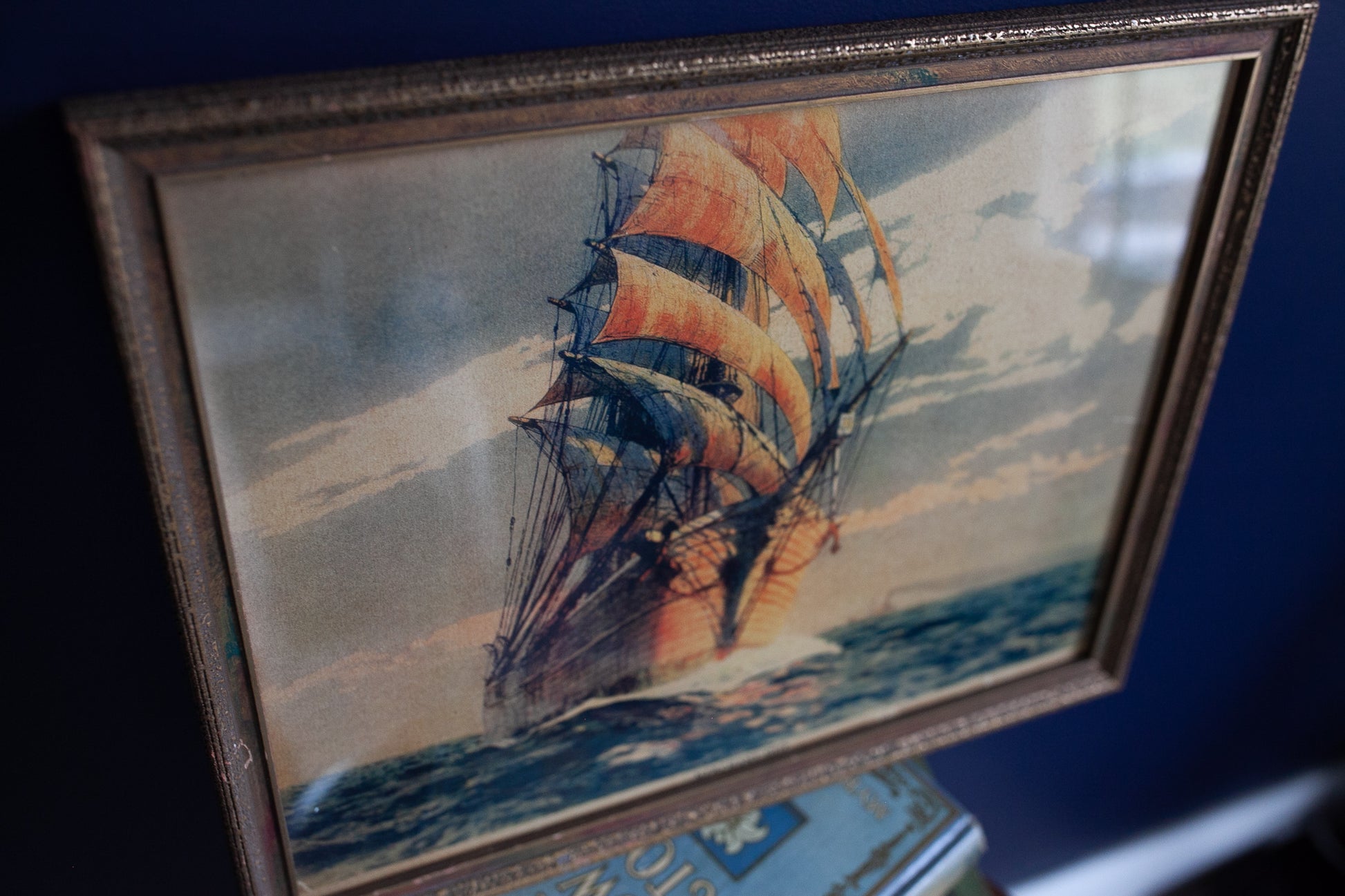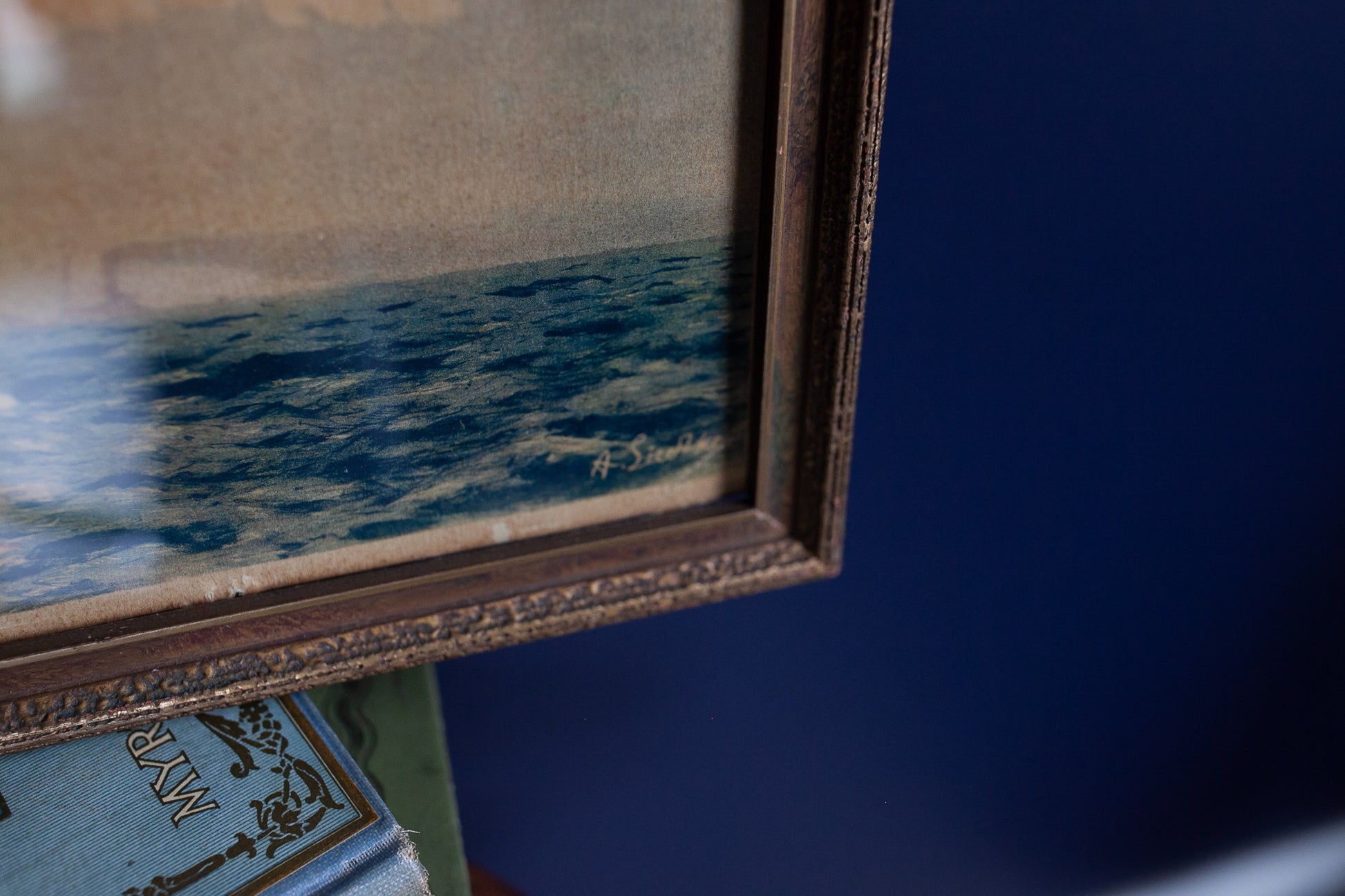 This vintage ship print is framed in an old frame and under glass. It is labeled Merchant Ship. It originally would have had a wood or cardboard backer, but it has been replaced with a cardstock paper. The print is in good shape with some light wear in it. The piece is about 15"x12" framed. It has wire on the back to hang with.