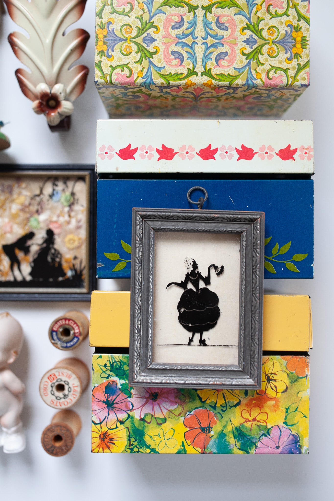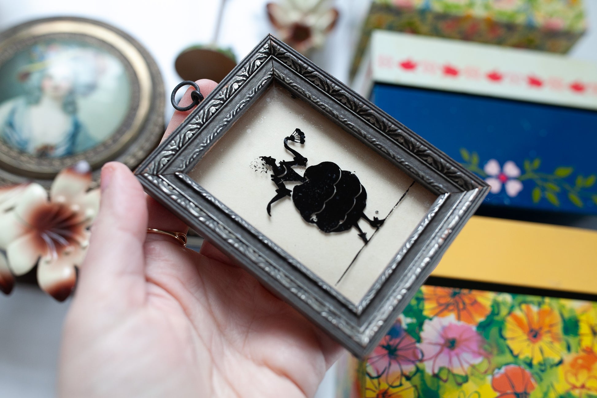 This great little silhouette is framed and only about 4"x3". It is a reverse painting silhouette. The lady is fabulous. The little frame is wood painted a silver color with a small loop at the top to hang with.