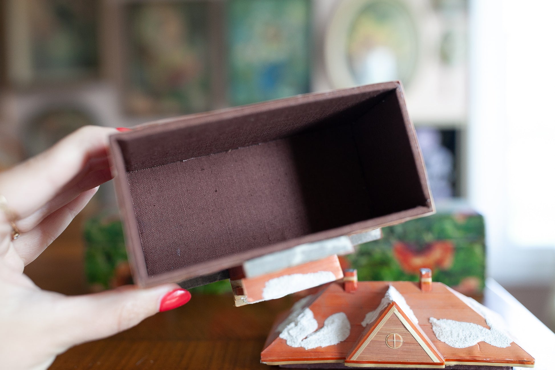 This is a sweet little straw trinket house. The roof comes off of the house and you can put things inside but it also just makes neat decor. I love all the tiny details on it. The house is fragile and while it is in good shape there are a few tiny imperfections and the right two columns by the door have been reglued. It is about 4.5" tall and about 5" wide.