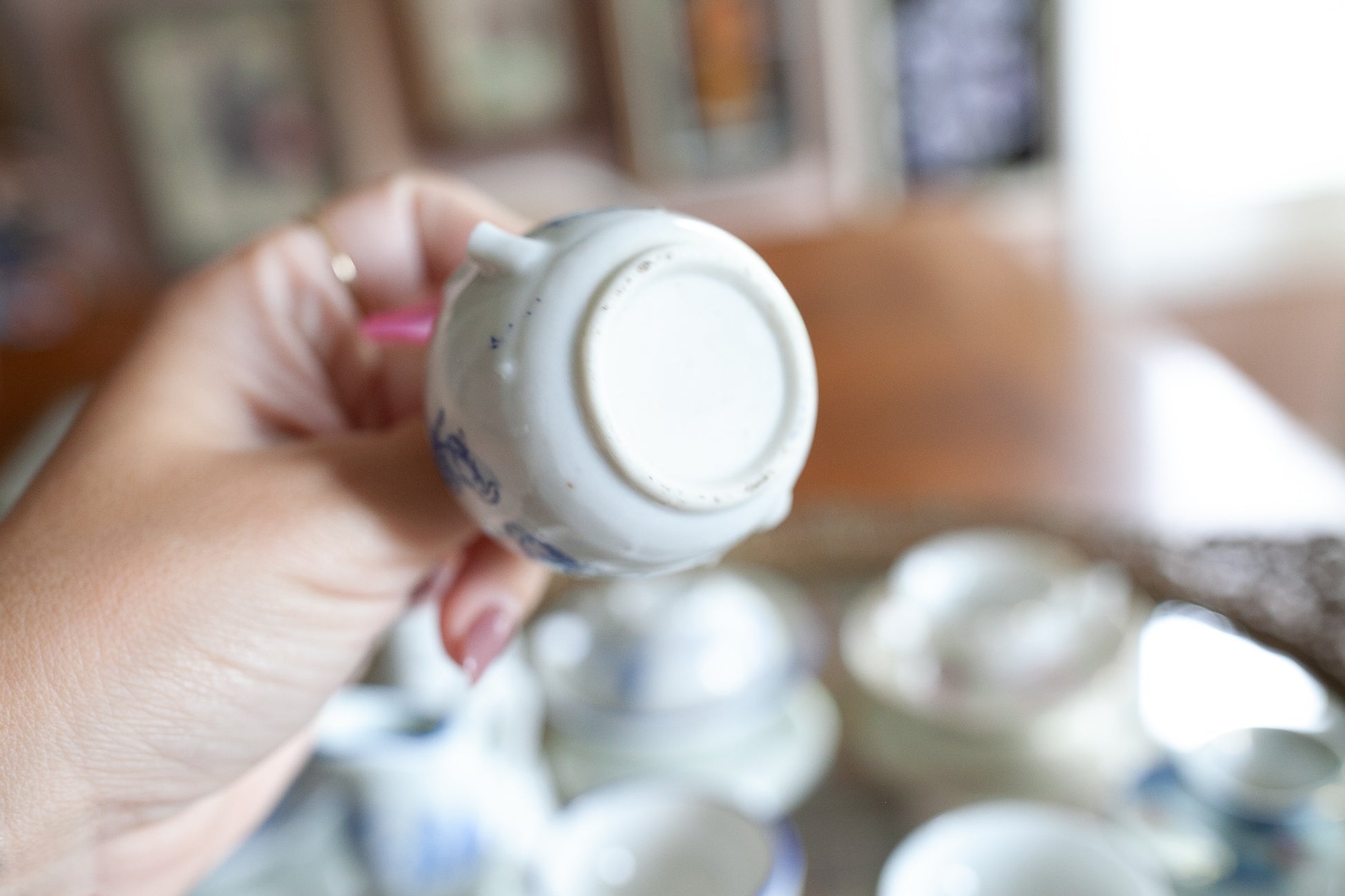 18 Piece china set- this little miniature tea set combines a few different styles. The teapot is broken see handle and spout are both broken, but still does have a lid. There are some small chips in the saucers and the cups. One cup has a broken handle. Some pieces were made in Japan. There is a tiny perfect little teacup and saucer that are blue and gold and theres one little South Dakota labeled tea cup. These pieces are charming!