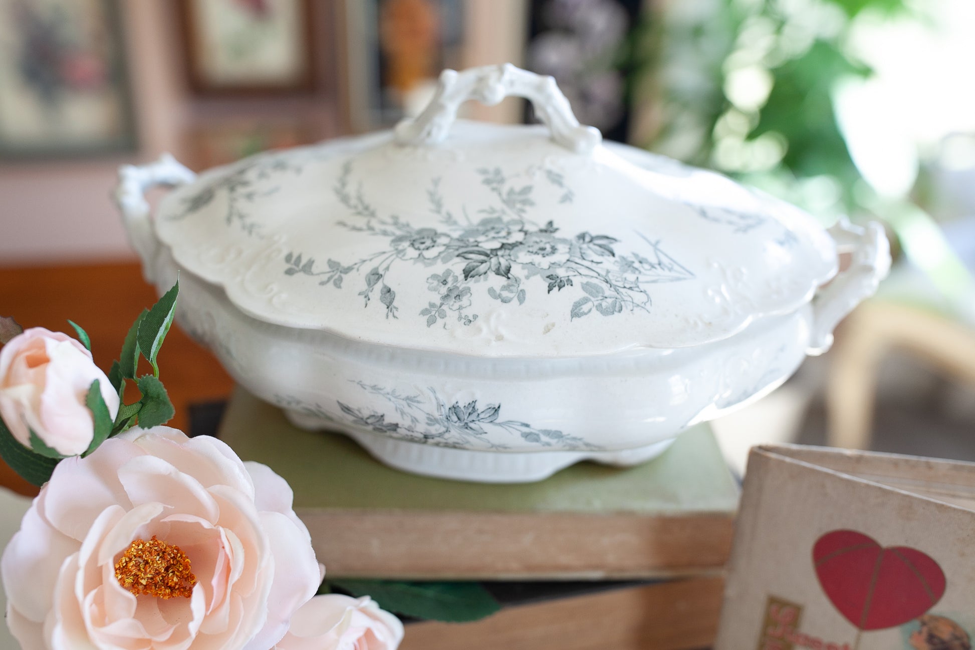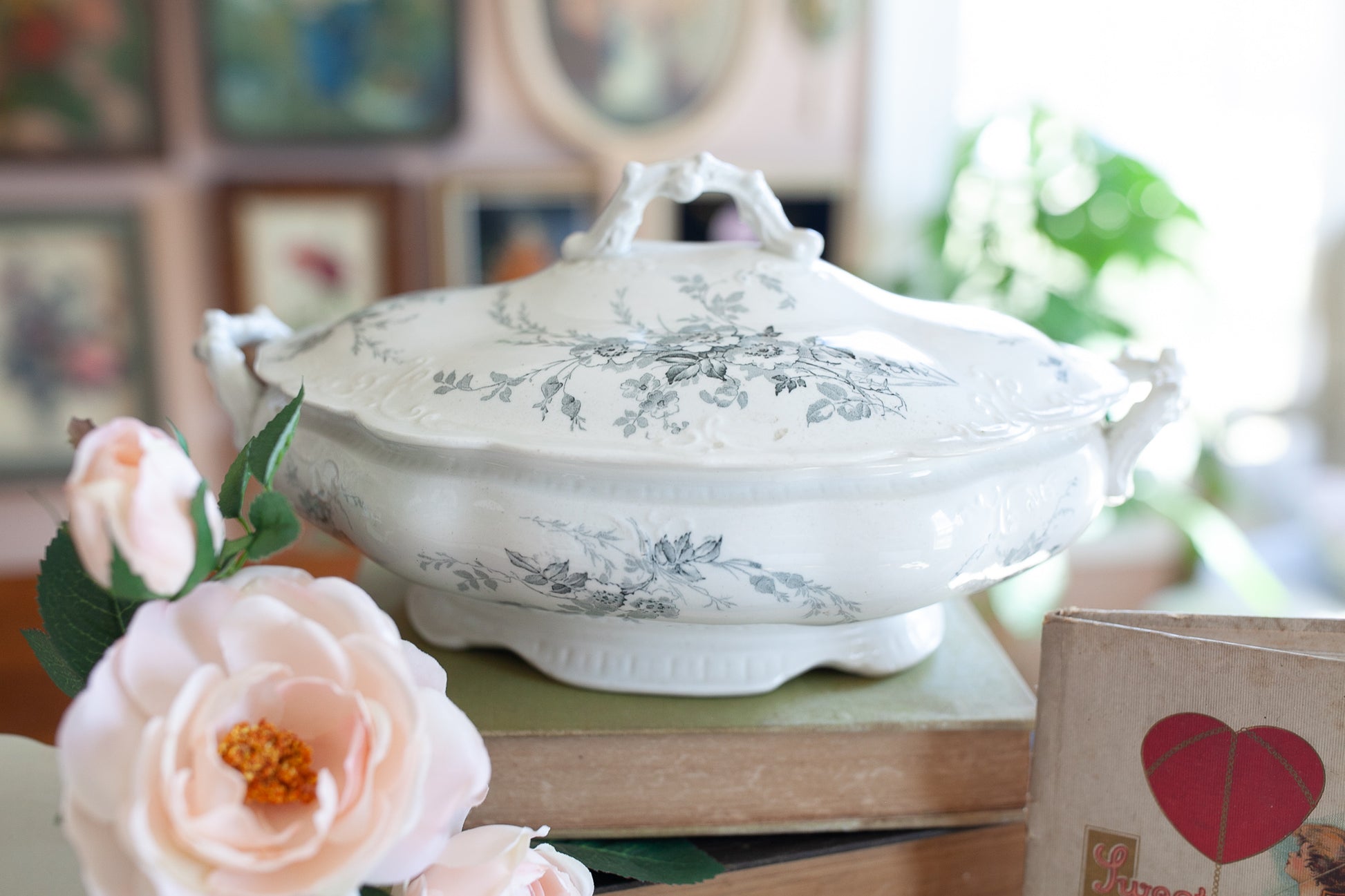 This pretty piece is a covered dish with black/gray transfers of florals all over the dish and lid. The width is about 11" across handle to handle and 6.5" across. The dish is about 3.25" tall without the lid and about 6" tall with the lid. The base says Brier E. Farmiloe England Royal Semi Porcelain - stamped on the base. No chips or cracks, one small fracture line on one side that is hard to notice but about 2".