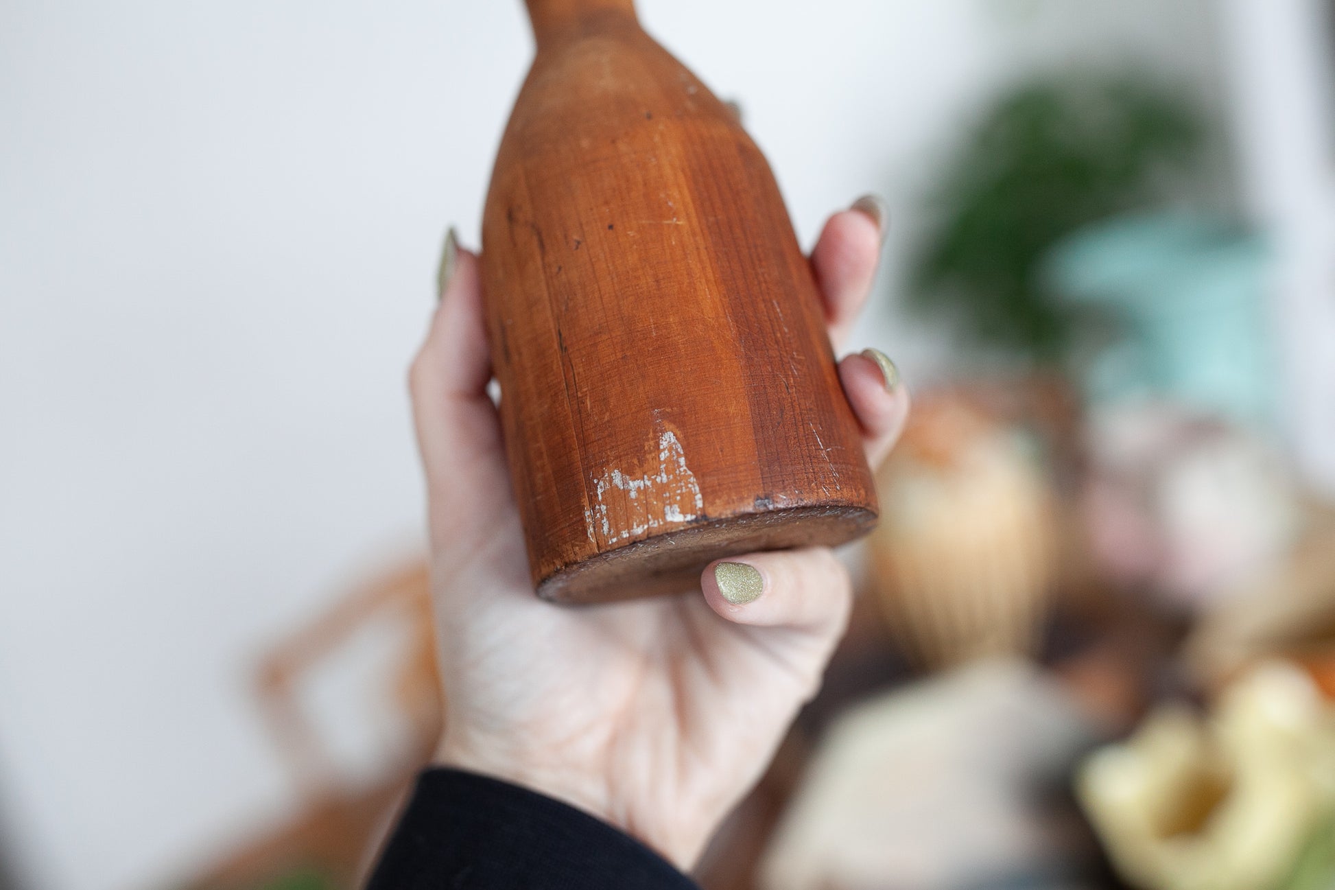 This vintage wood masher is about 9.25" tall. It has some wear to it- a chip in the top of the handle, a crack in the base, and a few spots of wear to the wood.