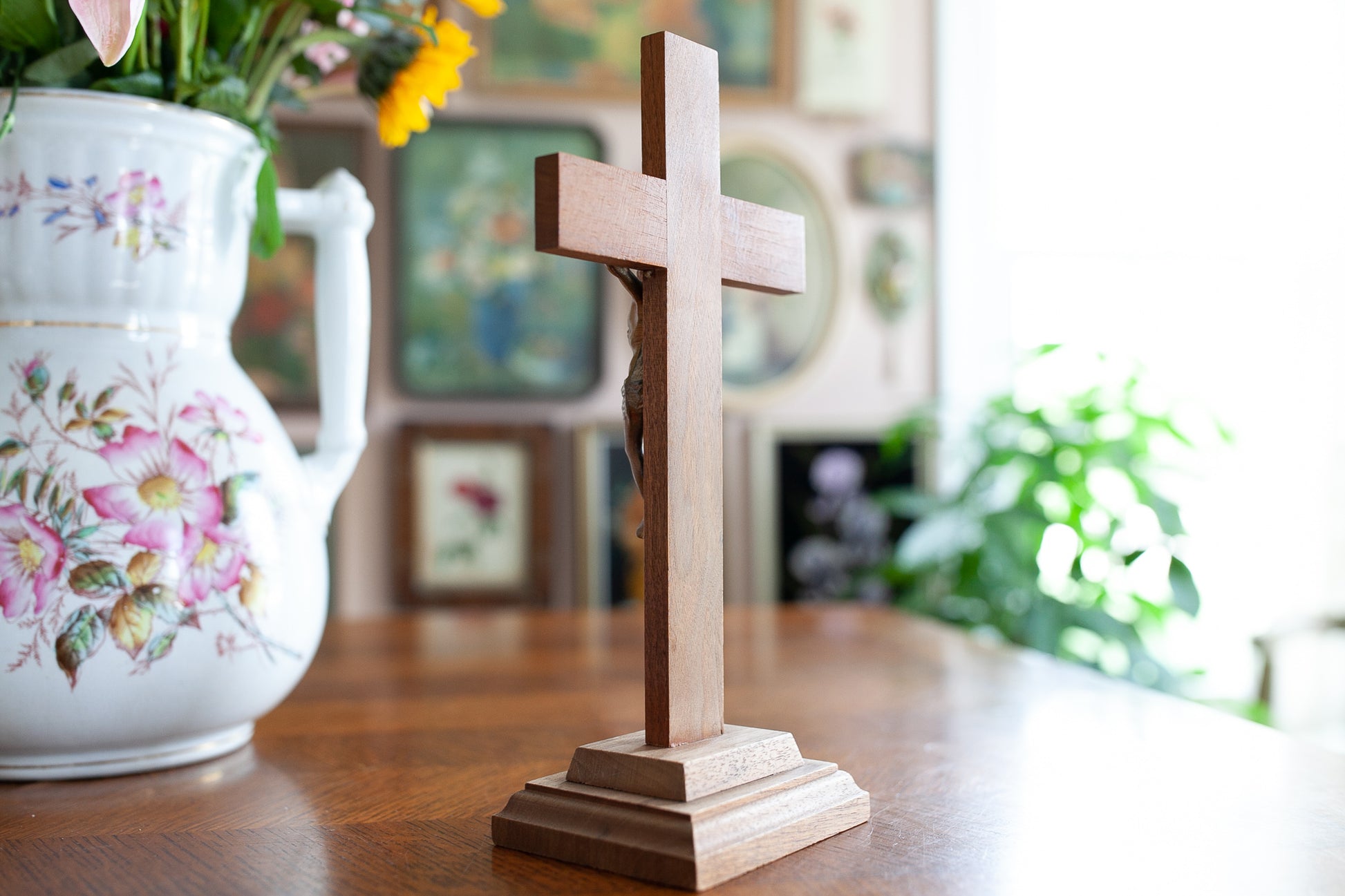 This crucifix is made of wood and Jesus is made of metal. It is in good shape and is about 11" tall and about 5.25" wide.