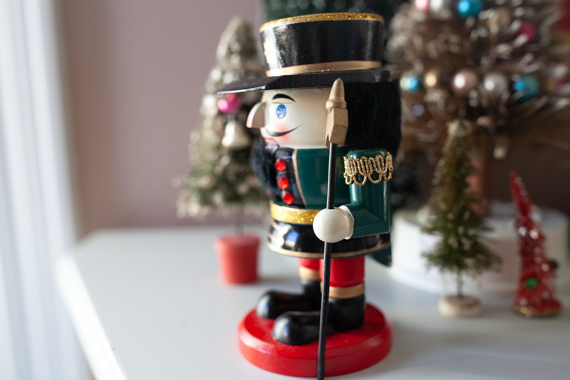 This guy is darling with all of his gold and red details! He stands about 6" tall and is in good condition and still works. He has minor paint wear.
