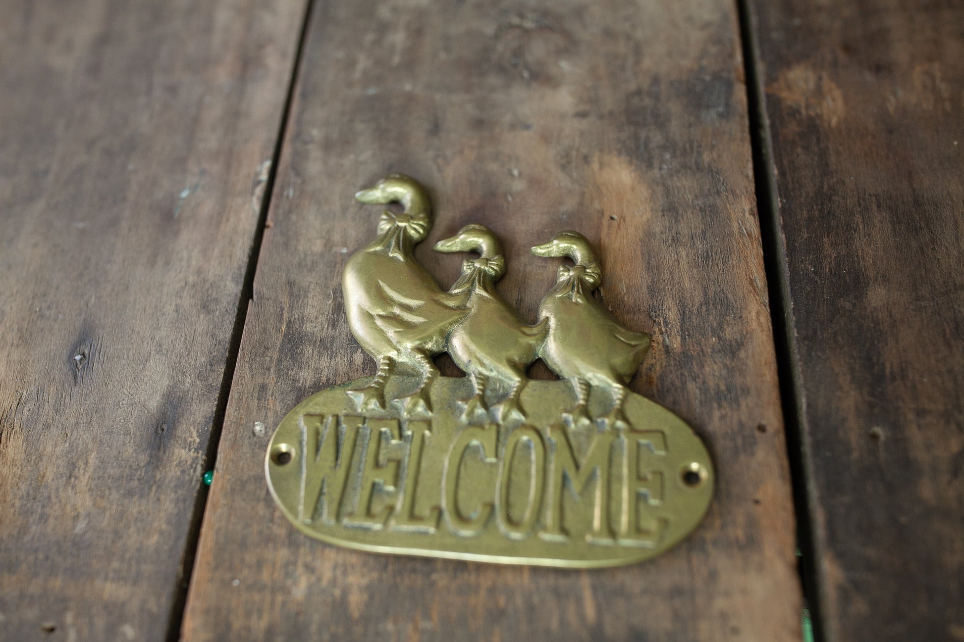 Welcome Sign - Brass Welcome- Geese -Vintage Solid Brass Welcome Sign with Country Goose Pair Vintage 1980s Garden Gate Sign Welcome Sign Country Geese Brass Sign