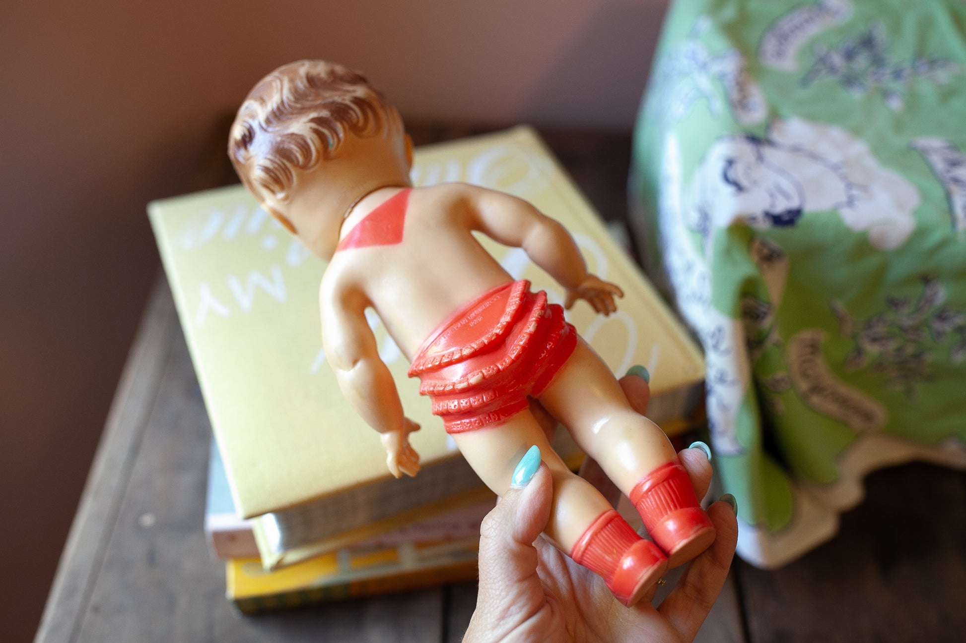 10 inch Tod-L-Dee Sun Rubber Co Girl Squeaker Doll in Red, Vintage
