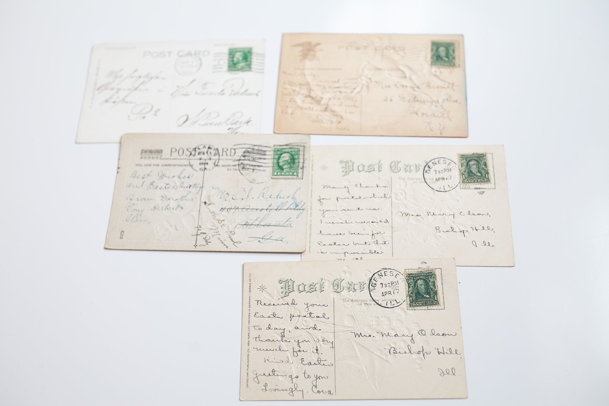 A set of 5 pretty antique Easter Postcards! These are so pretty and detailed! They are all written on. There is some wear on each- little bends in the corners and the red and blue textured egg one has a small paper rip along the top where some of the paper peeled away (not actually torn but paper missing in that spot).
