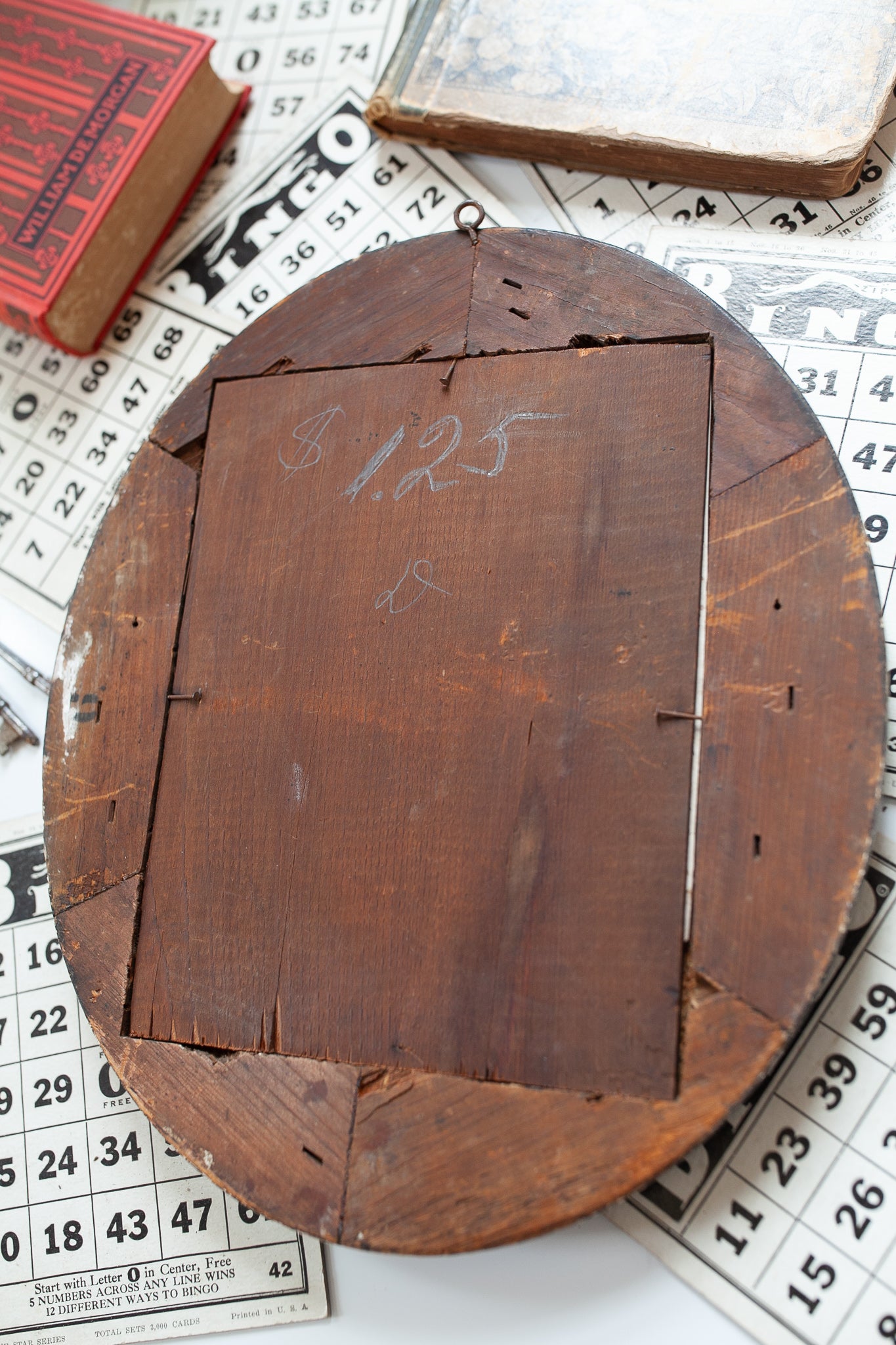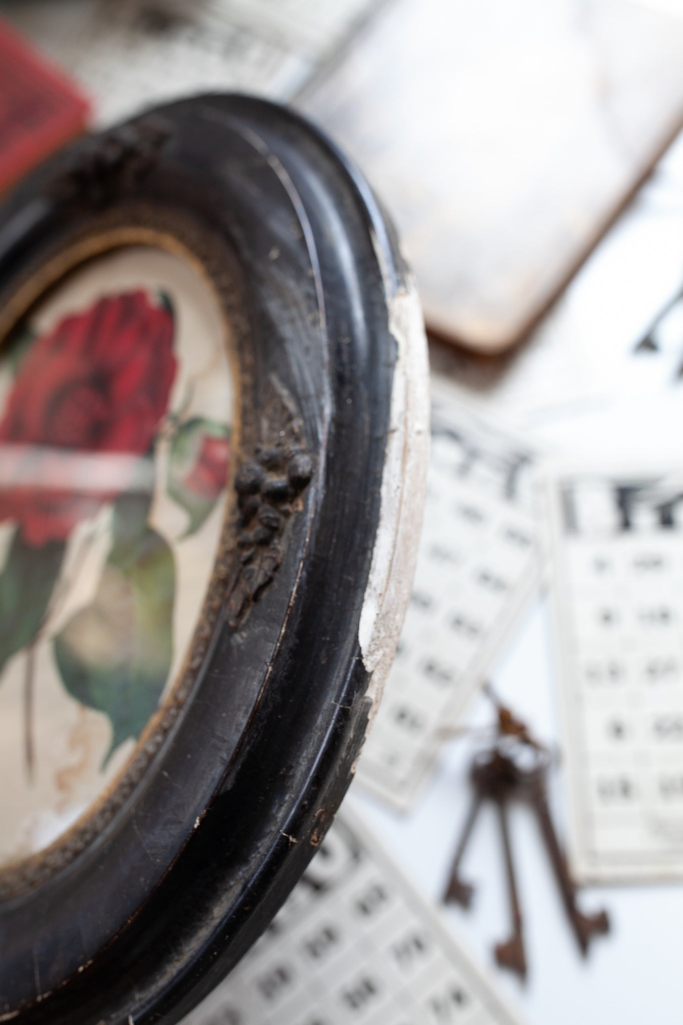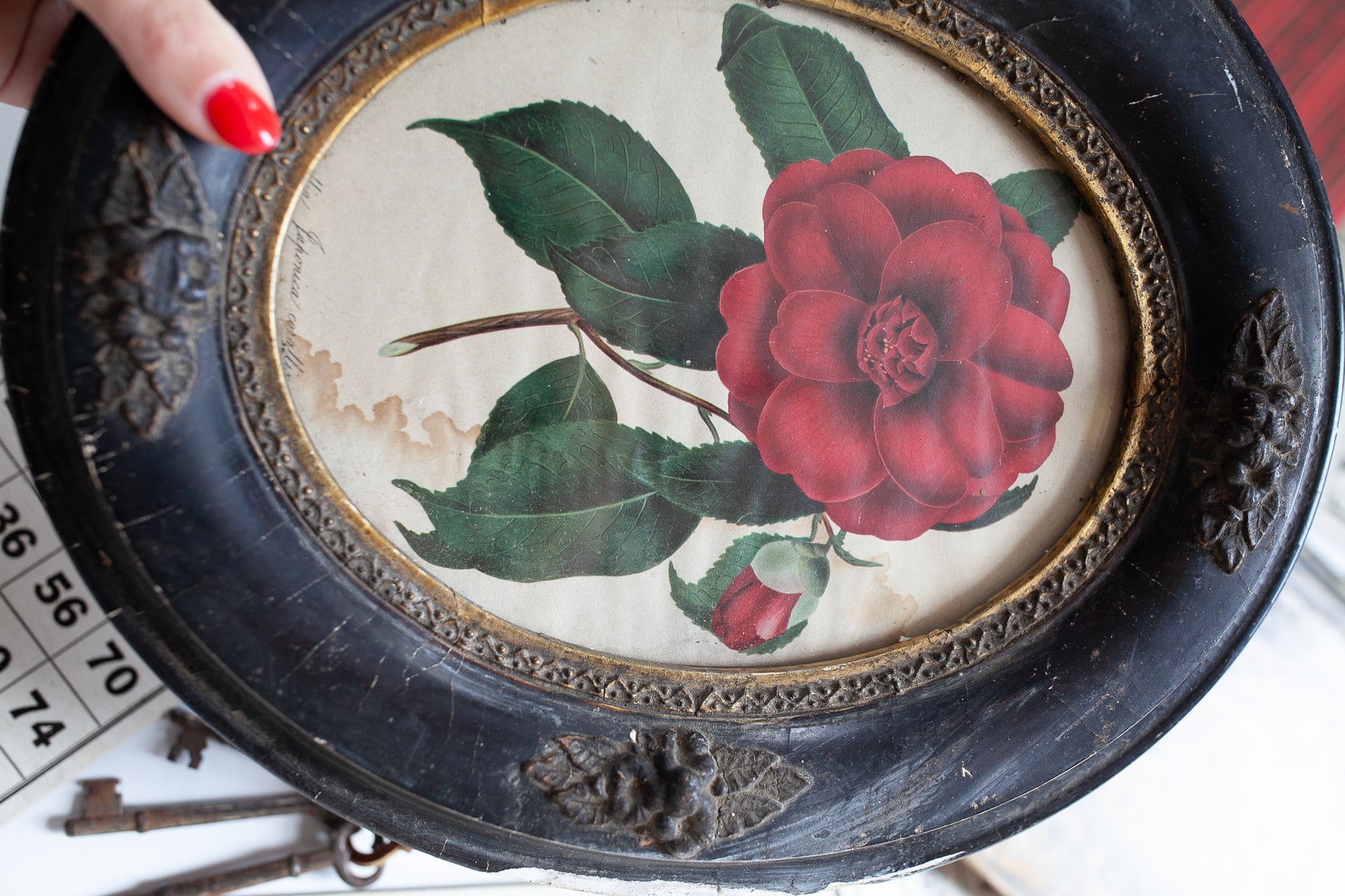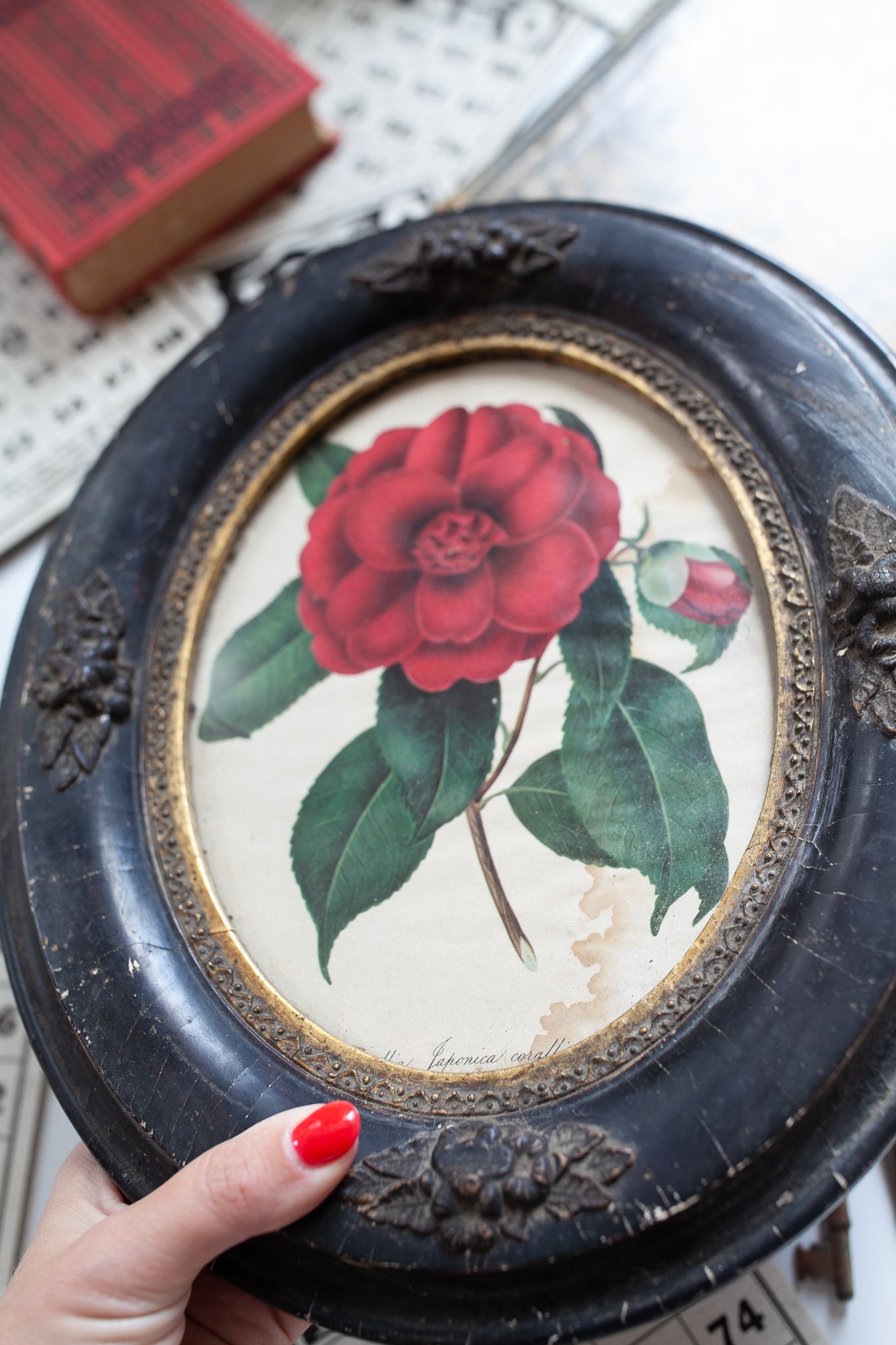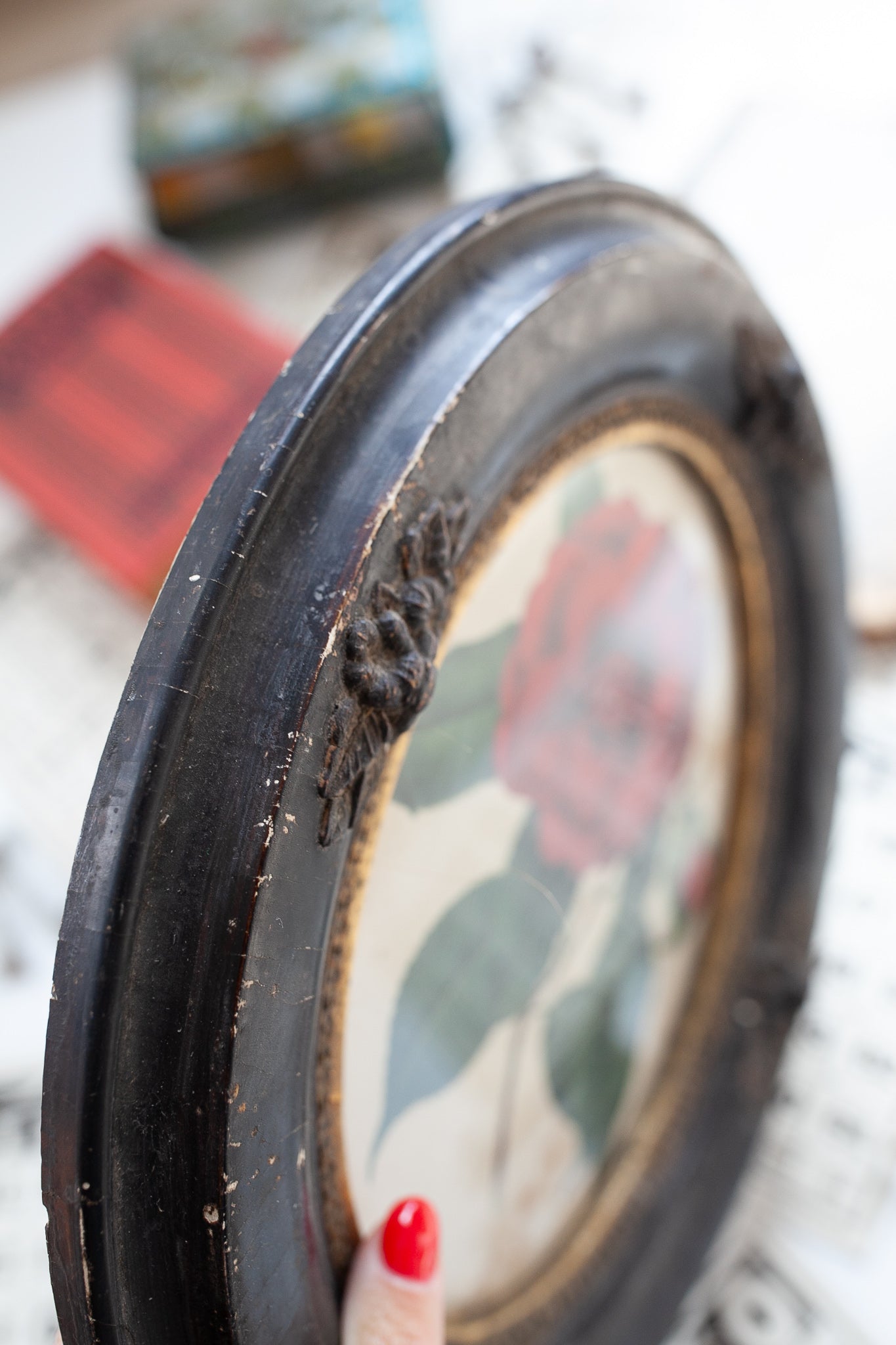 This antique framed rose print is a beauty! It is an old gorgeous black frame with a print inside. The frame has the old wooden back nailed on to it that really shows how old this one is! Such a cool piece to display- it is not in perfect condition as the side of the frame has some chipping, but is still sturdy. The rose print has some water staining it looks like. It is about 13" by 11" and has a little loop at the top of the frame.
