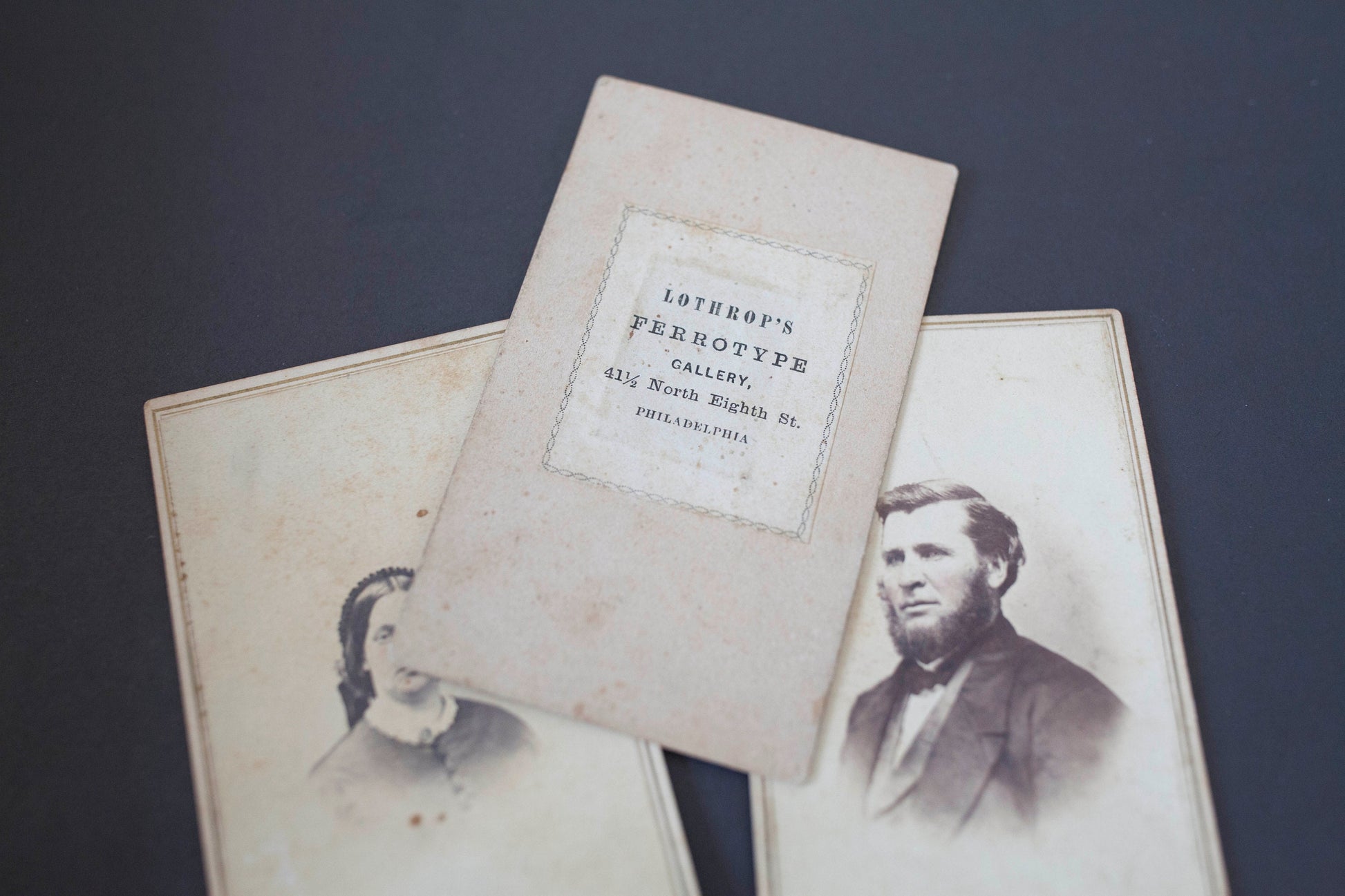 These are great antique photographs! The two portraits I assume to be a husband and wife as they were taken at the same studio in Peoria, IL. They are both 4x 2 3/8". They are really great portraits and are in good condition but the woman has some damage to the photo -see photos. The third is a ferrotype photo- a tin type that is a positive photograph made by a collodion process on a thin iron plate having a darkened surface. It is a size of about 4x2 1/4". The tin type photo was taken at Lathrop's in Philadelphia and has a fantastic paper border with a gorgeous design on it. Lathrop's was open between 1860-1870.