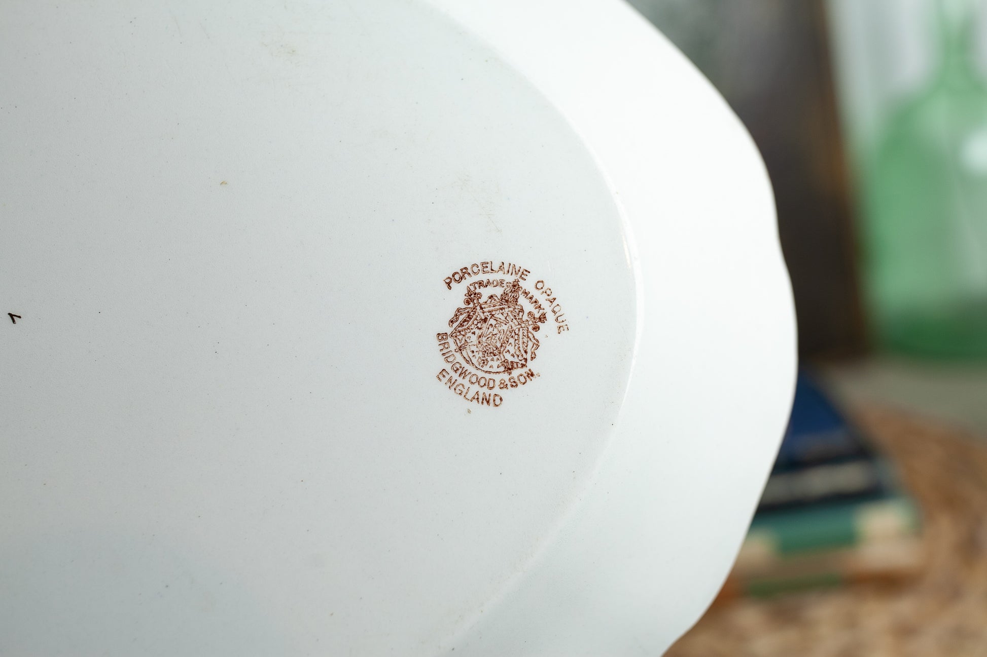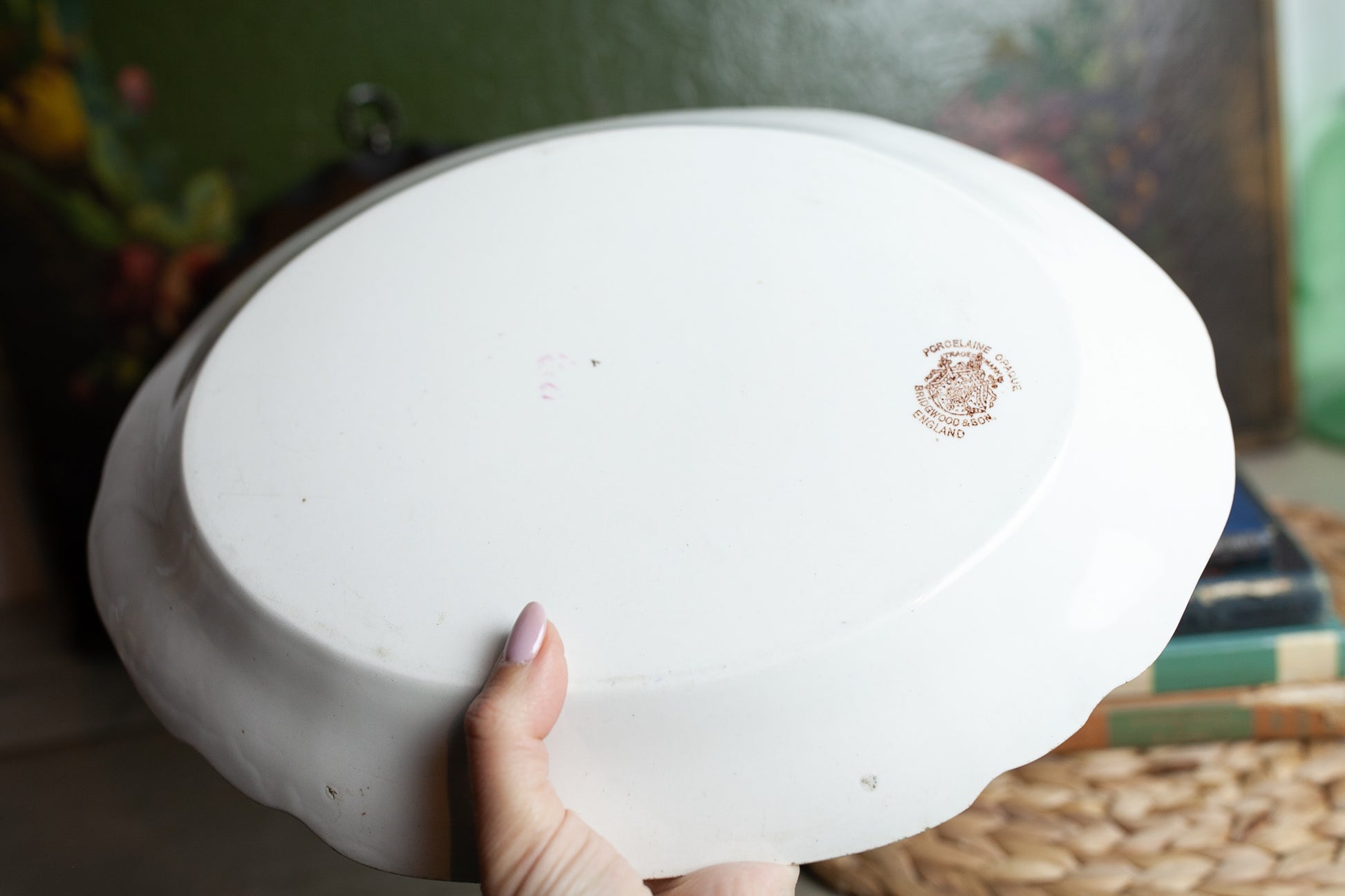This platter is an oval shape and is about 13.75" long and about 10.5" wide. There is crazing in the glaze and some marks from past use. There is some fading to the transfer print on the piece especially around the edge. It is stamped on the base with Bridgwood &sons England. No chips or cracks.
