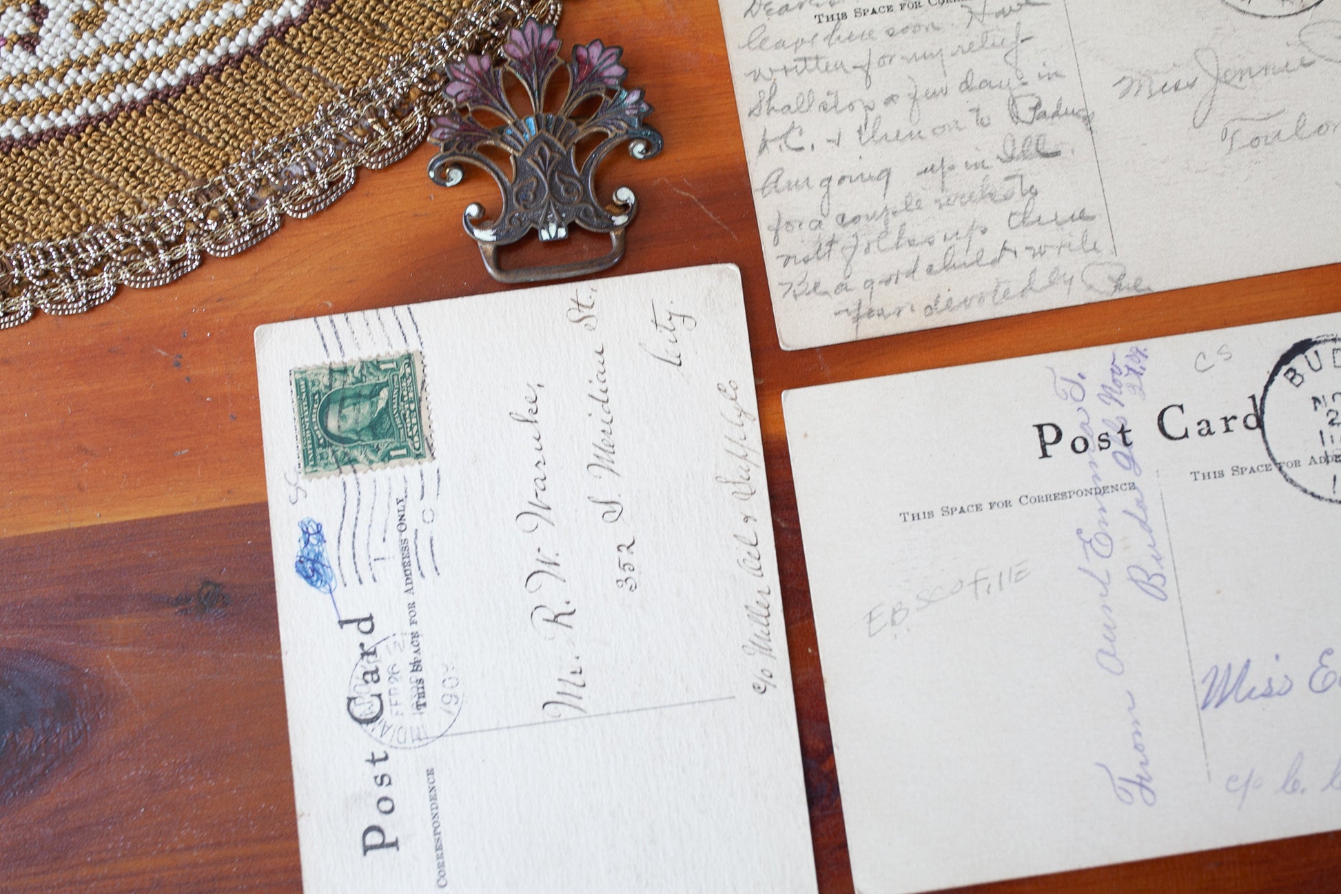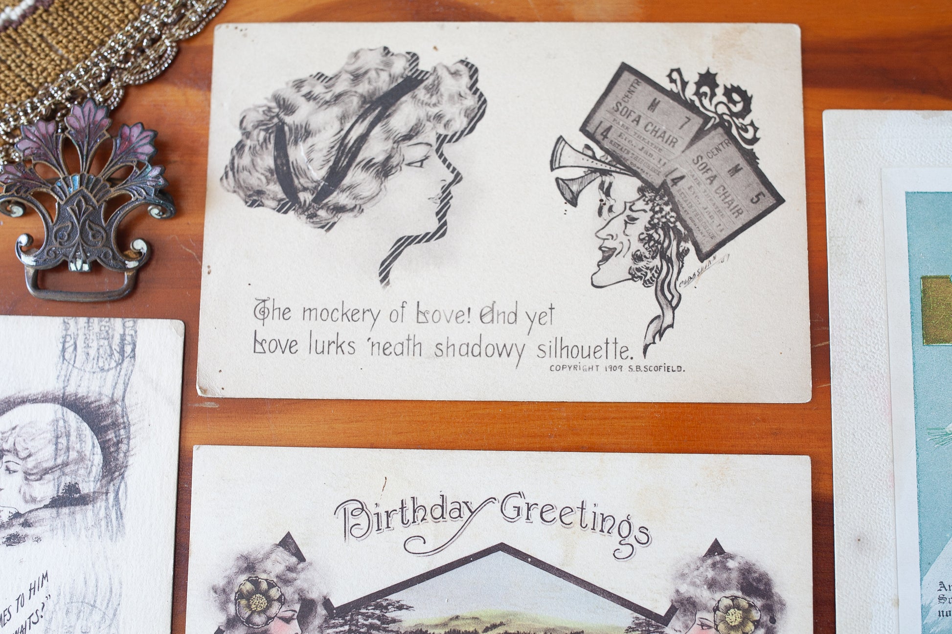 Shop:The Silhouette Set- This antique grouping of postcards are unique and lovely! They were all sent between 1909-1910-3 are stamped, and all 4 are written on. One says "Birthday Greetings" with silhouettes and two of the others are very similar style with silhouettes as well! The 4th