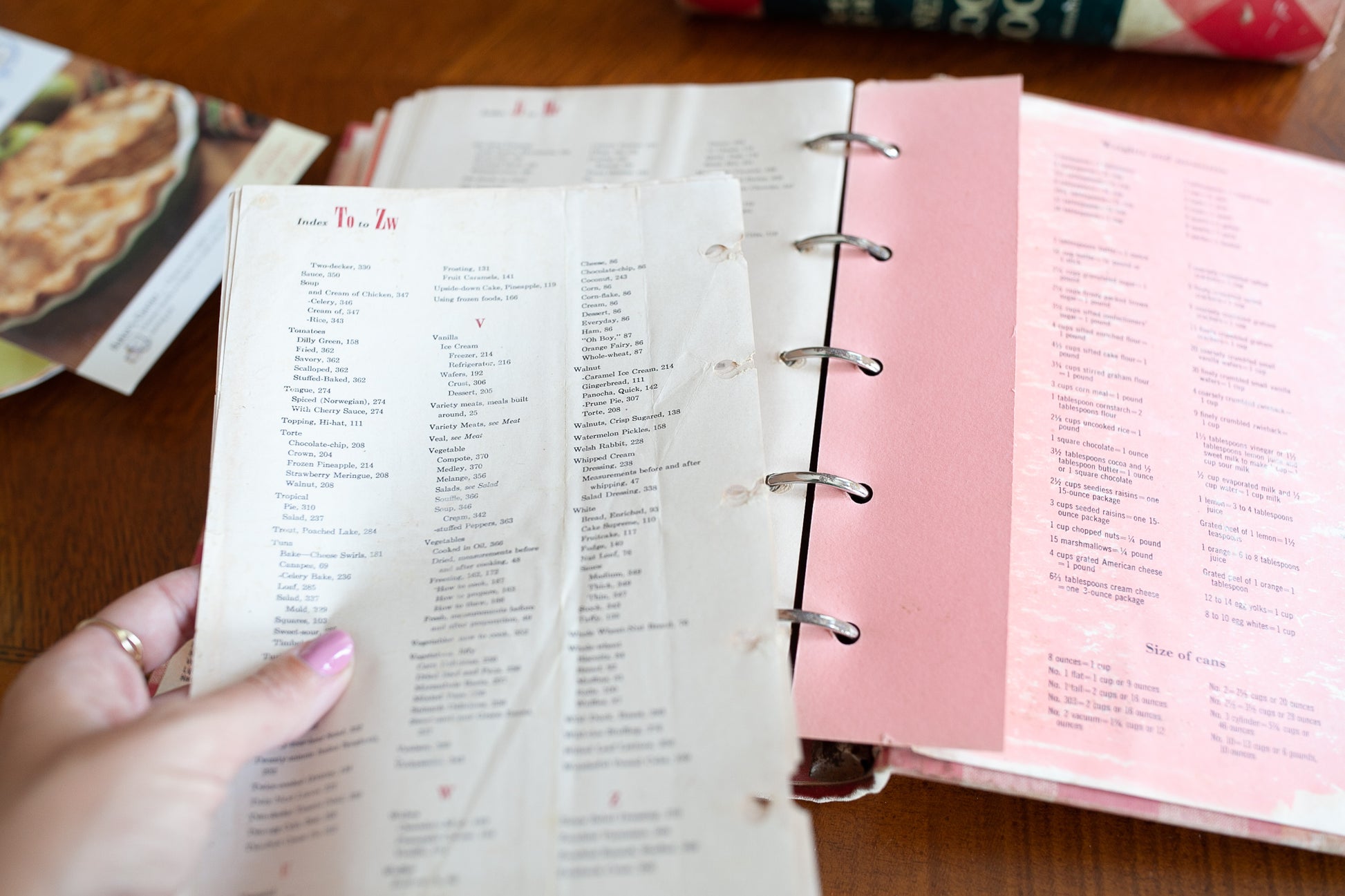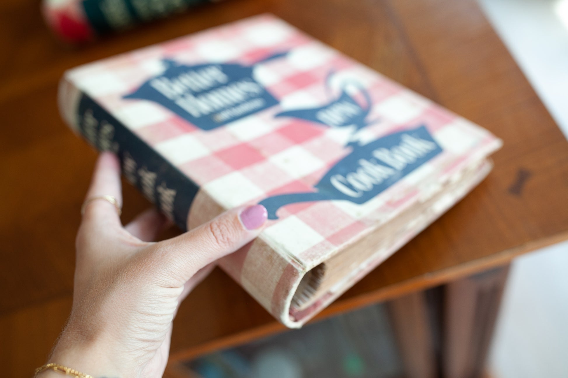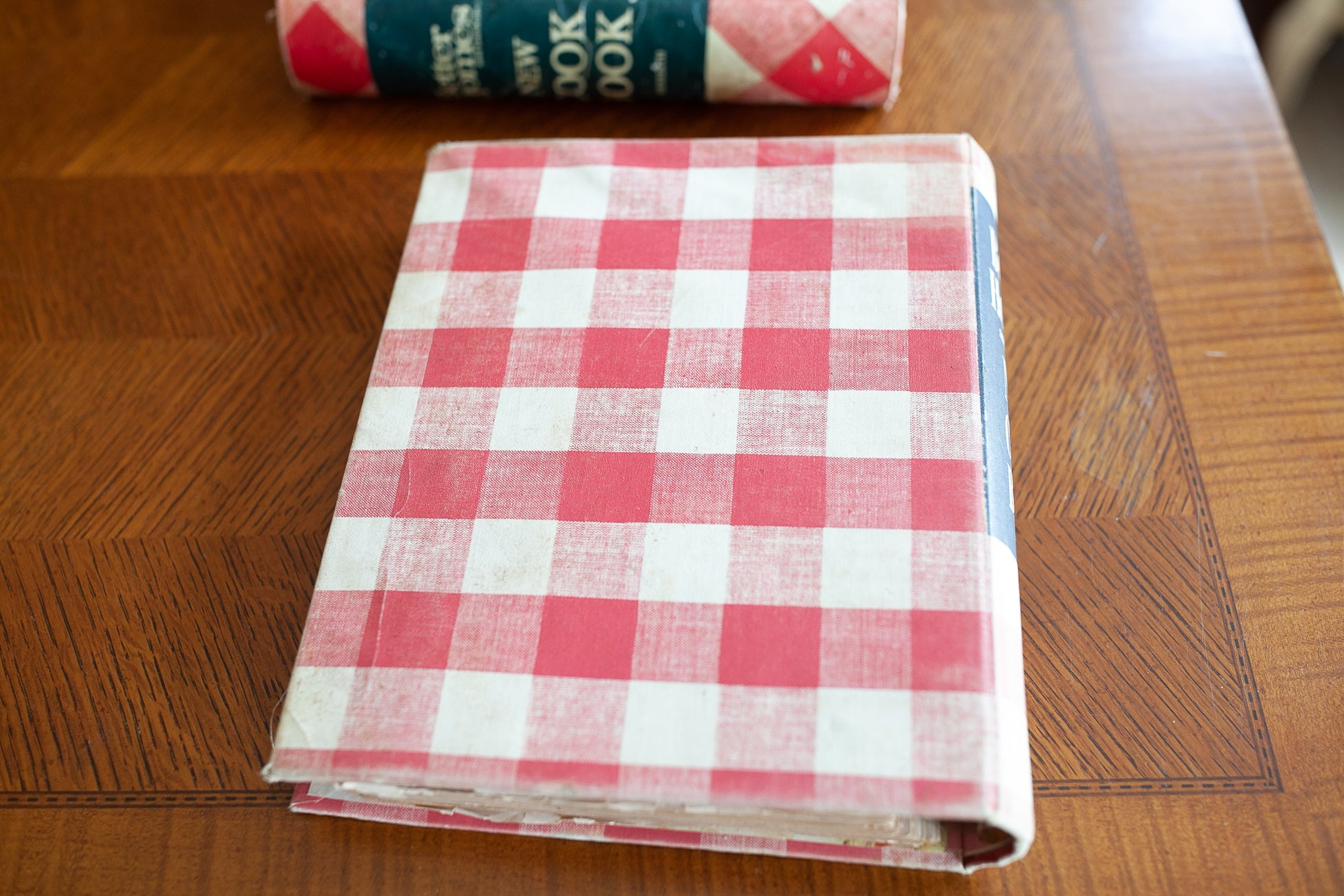 This cookbook is 71 years old and olds lots of great recipes. It is worn and has some pages that are no longer attached in the 3 rings- but seems to have all pages still inside- just some have their holes ripped. The checked red and white is faded, but still fun for kitchen decor too! About 10"x8"