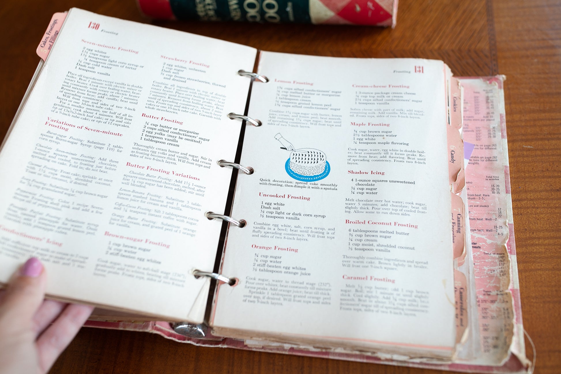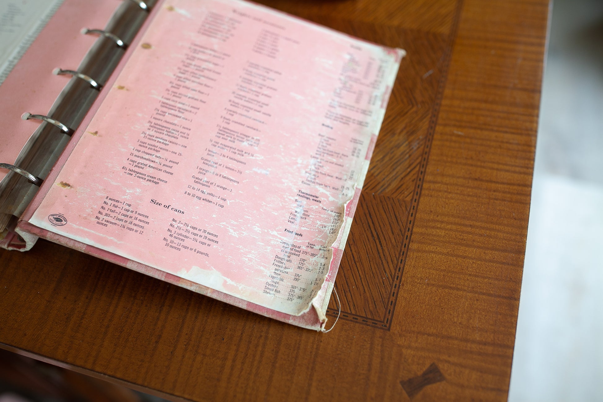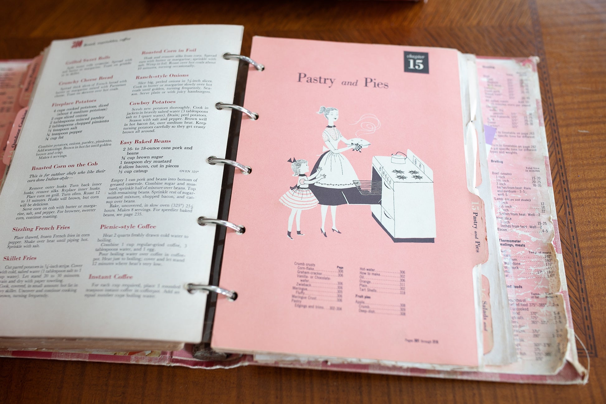 This cookbook is 71 years old and olds lots of great recipes. It is worn and has some pages that are no longer attached in the 3 rings- but seems to have all pages still inside- just some have their holes ripped. The checked red and white is faded, but still fun for kitchen decor too! About 10"x8"