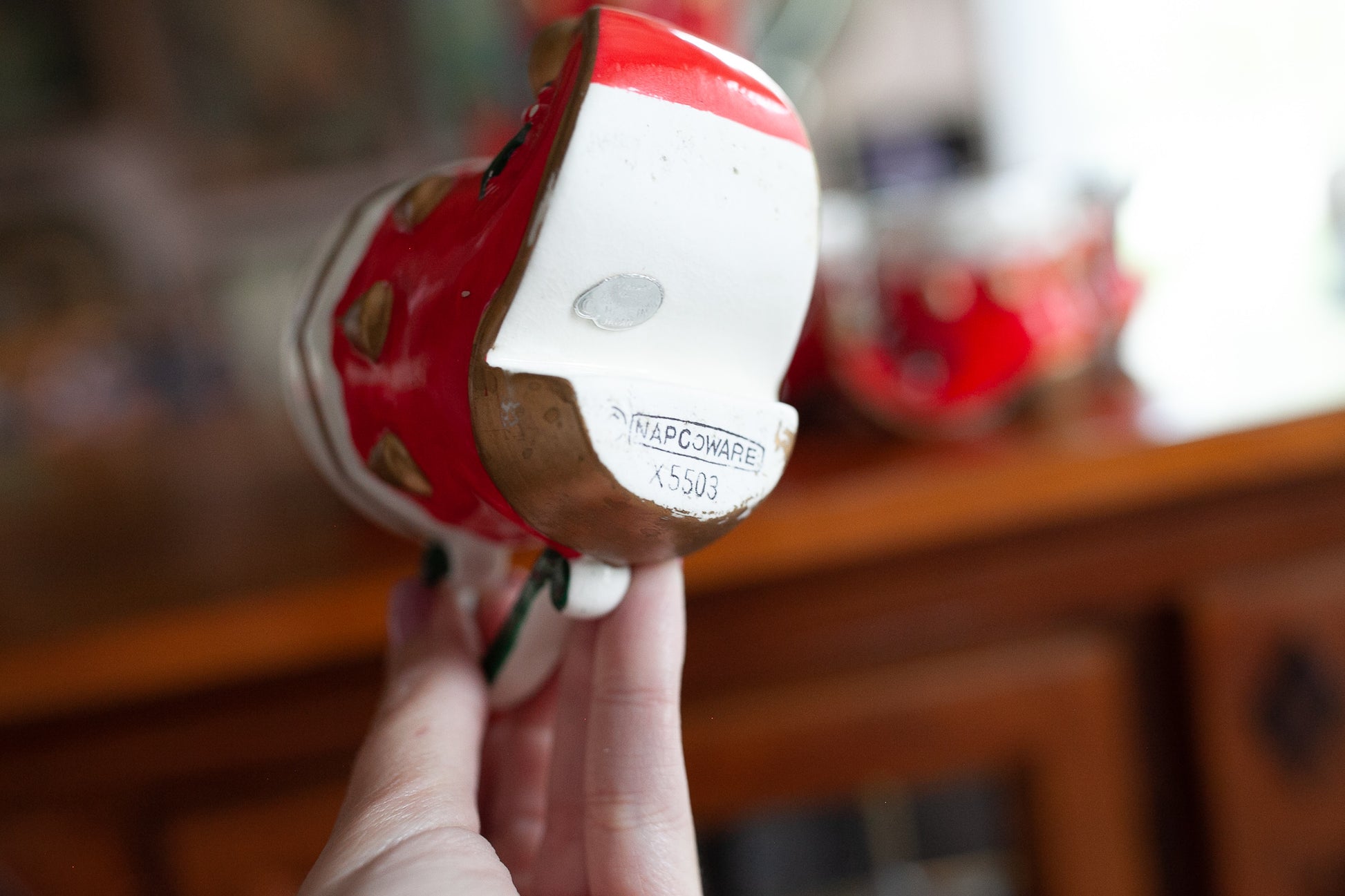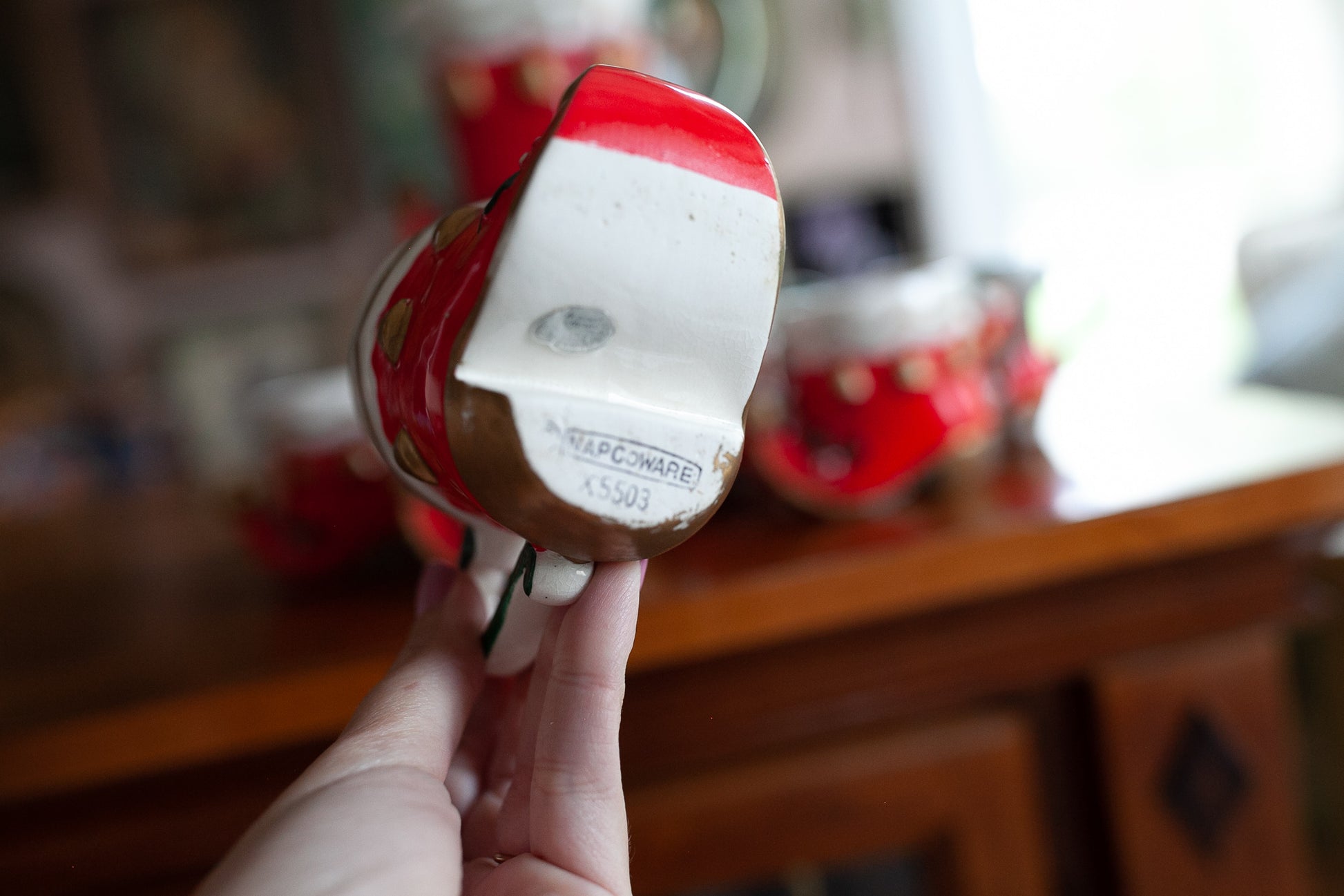 This is an amazing set! I LOVE these little elf shoe mugs and the big elf shoe pitcher! How fun are they?! They were made by Napcoware. There are 6 little mugs that are about 3" tall and 2.5" wide diameter top opening. They are all in good shape, but some have some paint wear especially on the gold base of the shoes see photos please. They have some crazing but no chips or cracks. The pitcher is about 6.5" tall and about 3.5" across opening at the top.