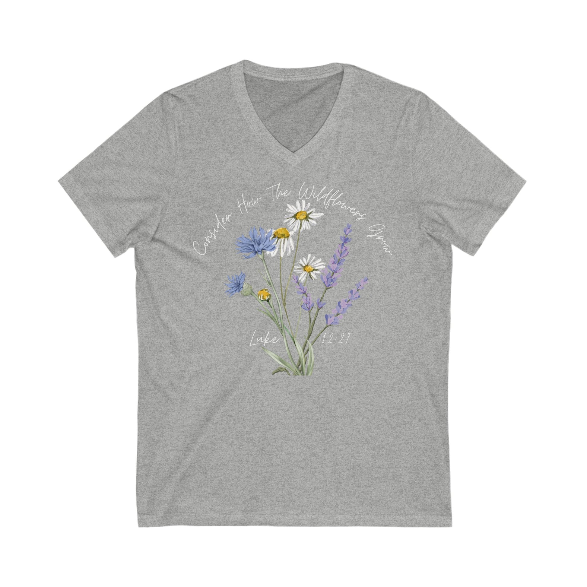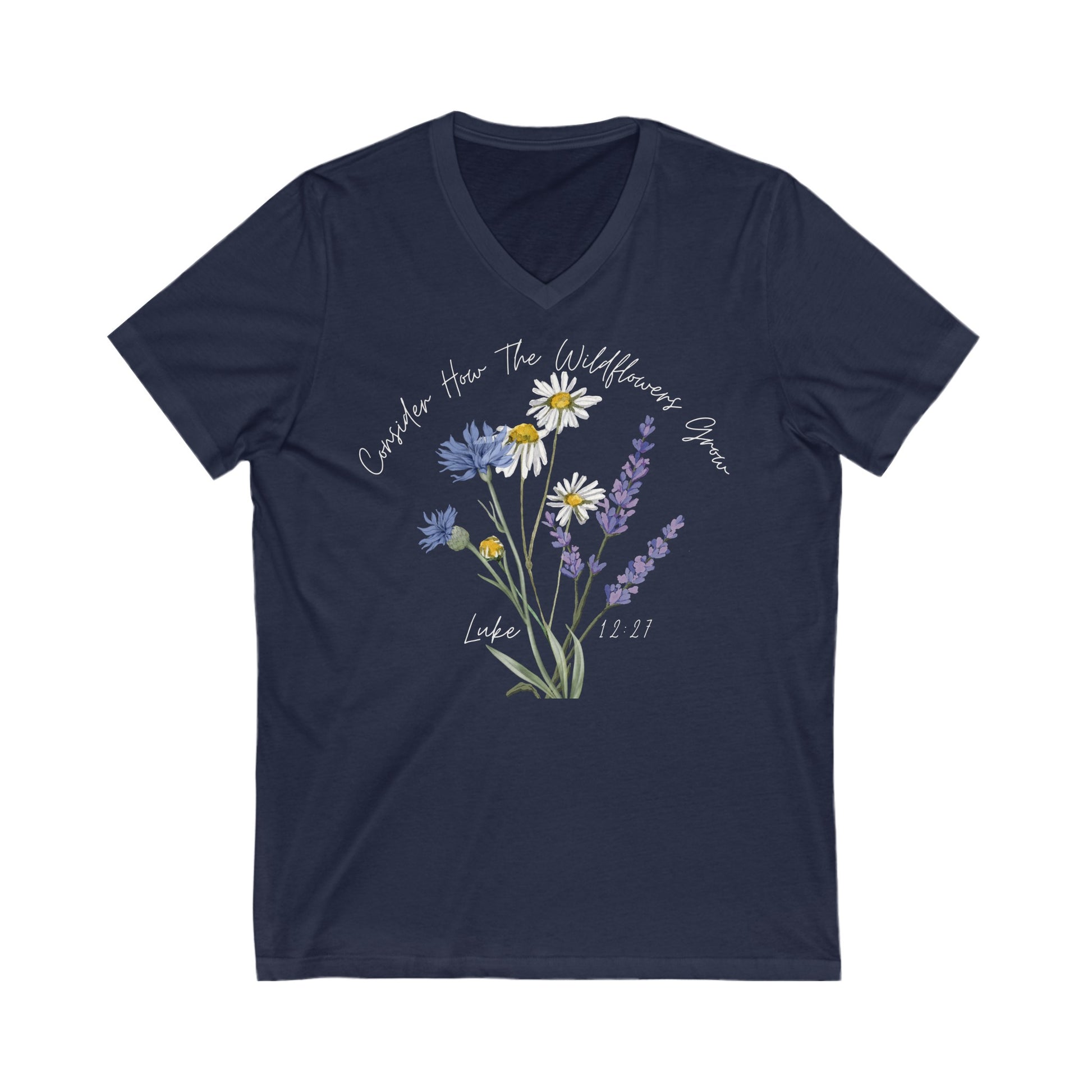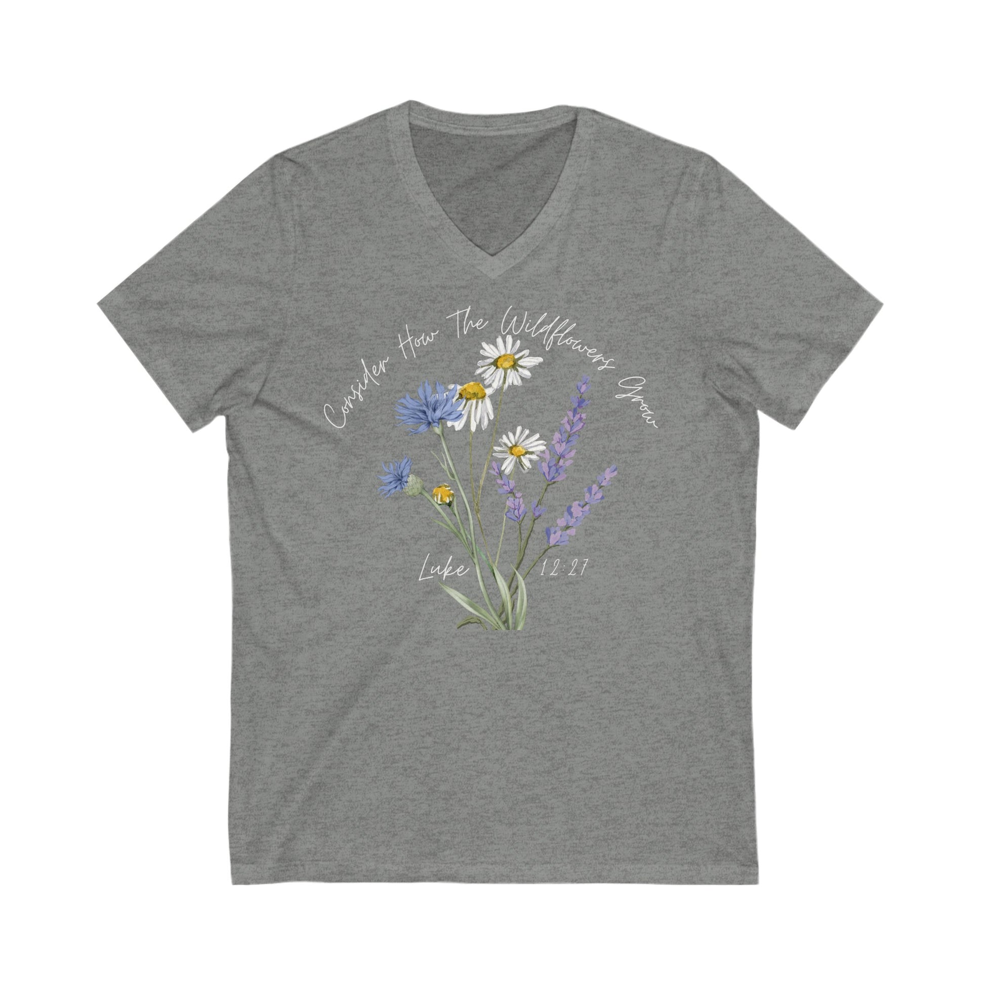 Consider How The WildFlowers Grow Luke 12:27-Unisex Jersey Short Sleeve V-Neck Tee