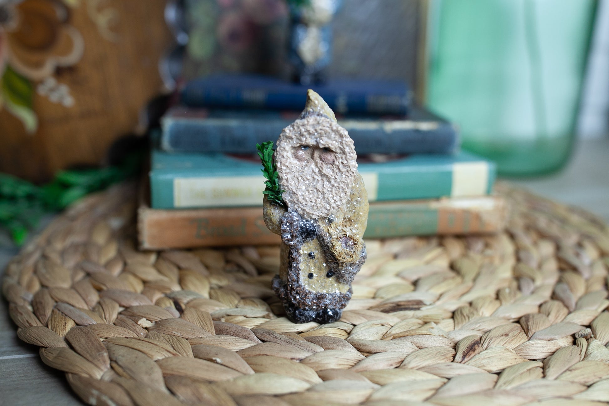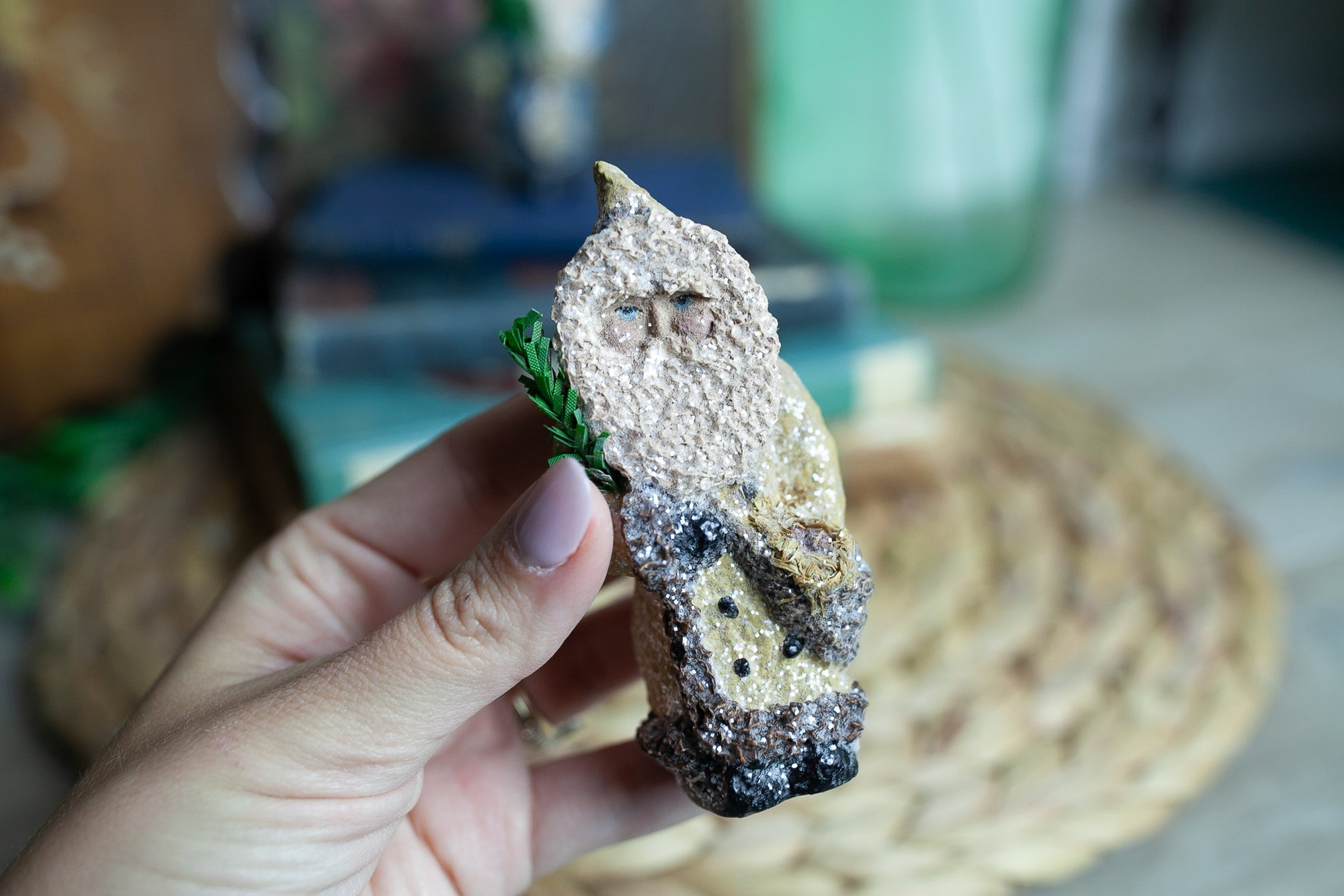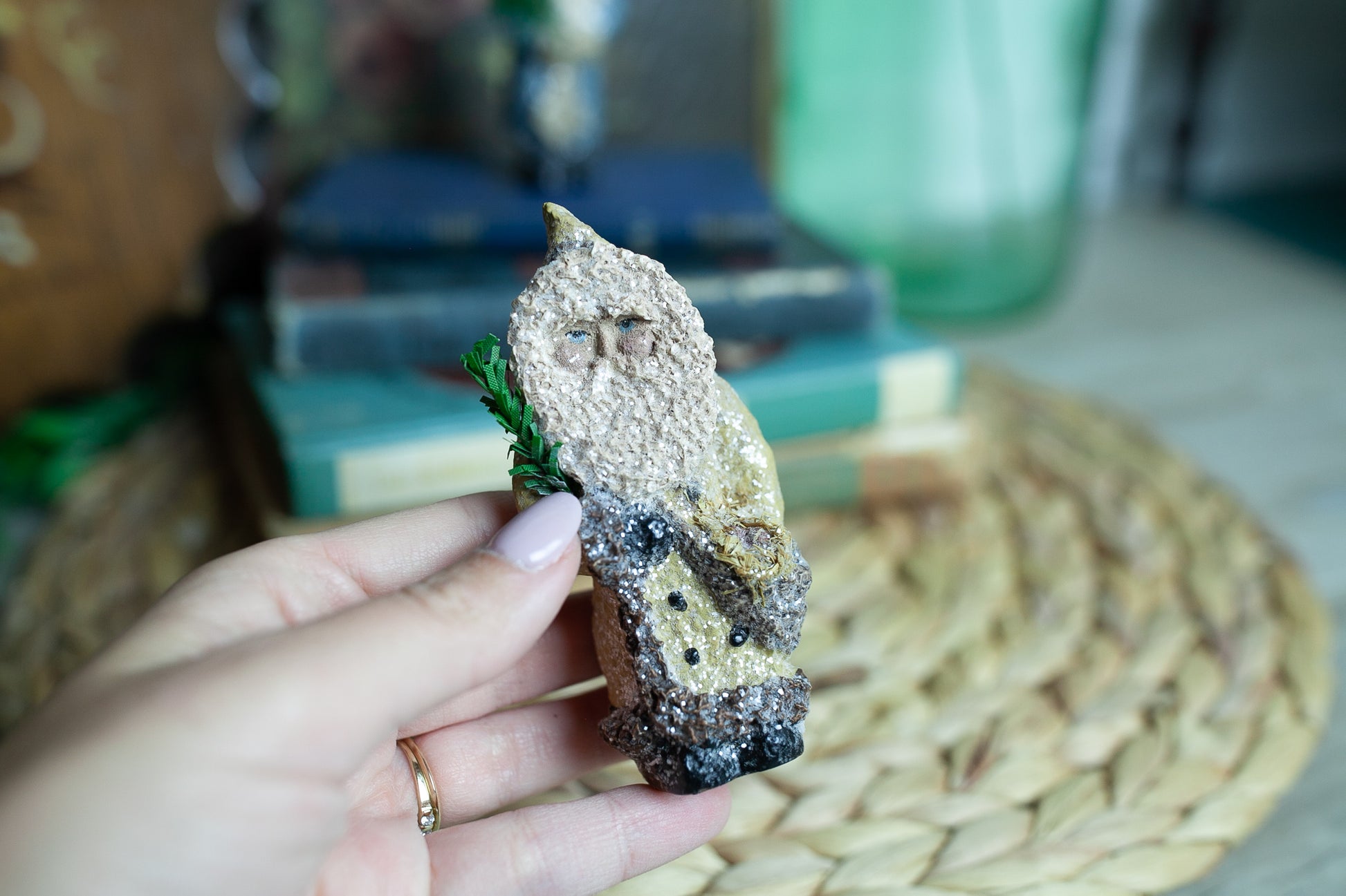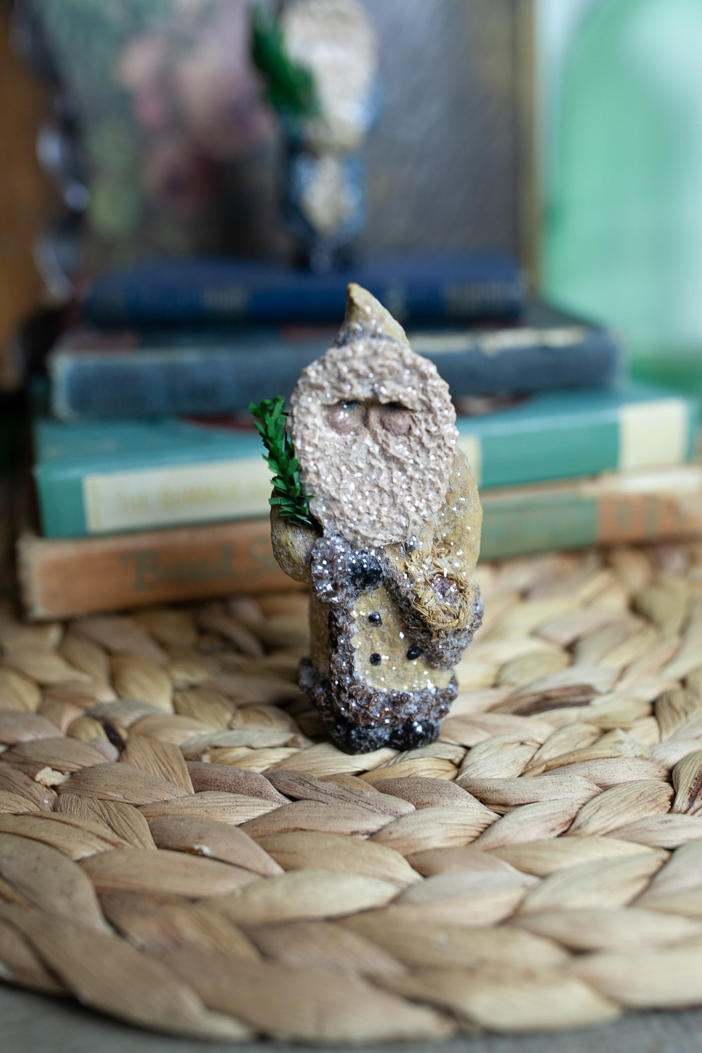This santa has a yellow coat lined in fur and has a bag slung around his shoulders. He stands about 4" tall. He is in great condition and is so glittery and sweet!