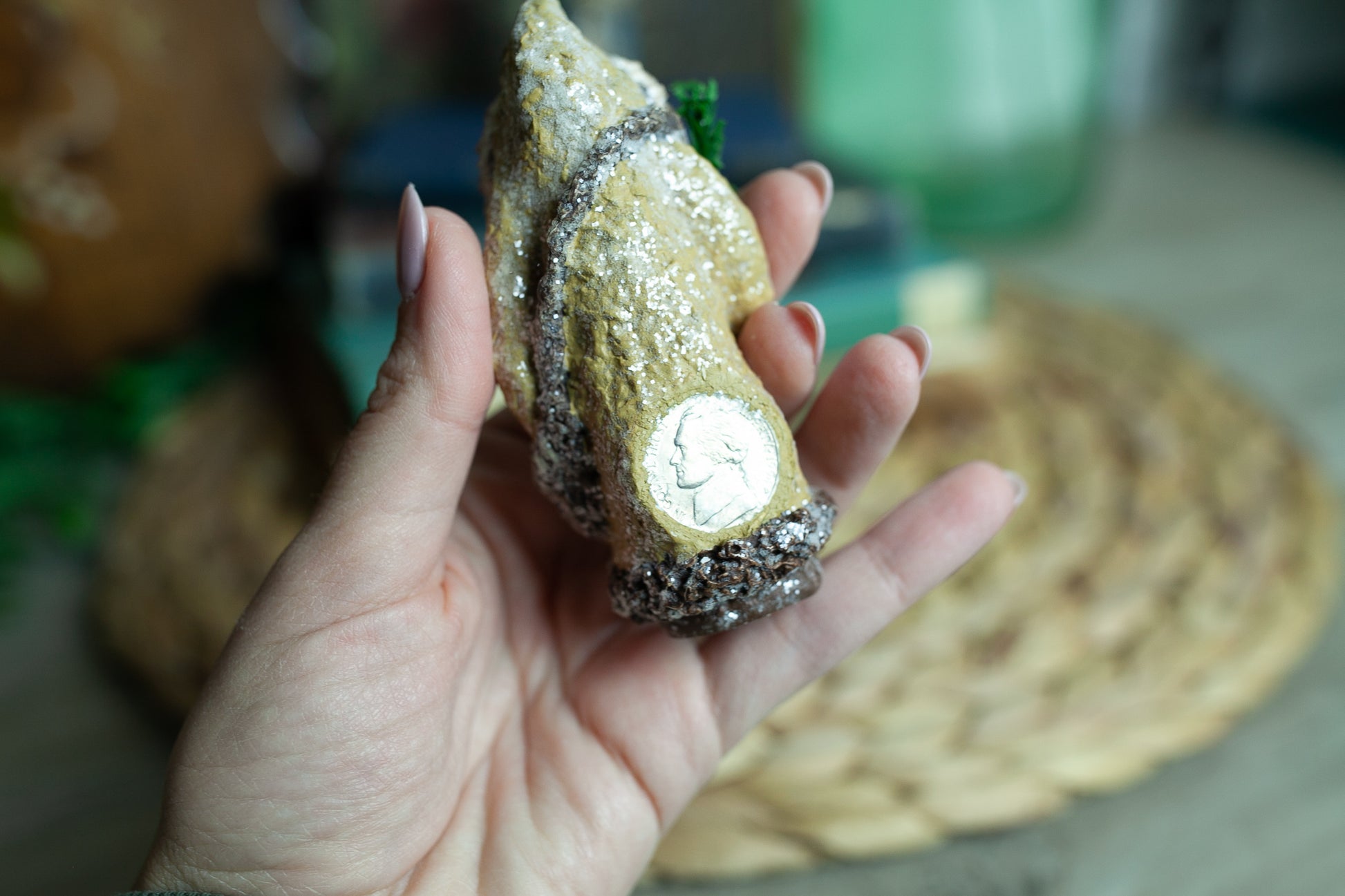 "For a nickle in 1986 Linda Lindquist Baldwin bought an old antique santa colletions book at a garage sale." She then made her own collection and they all have a nickle on them!