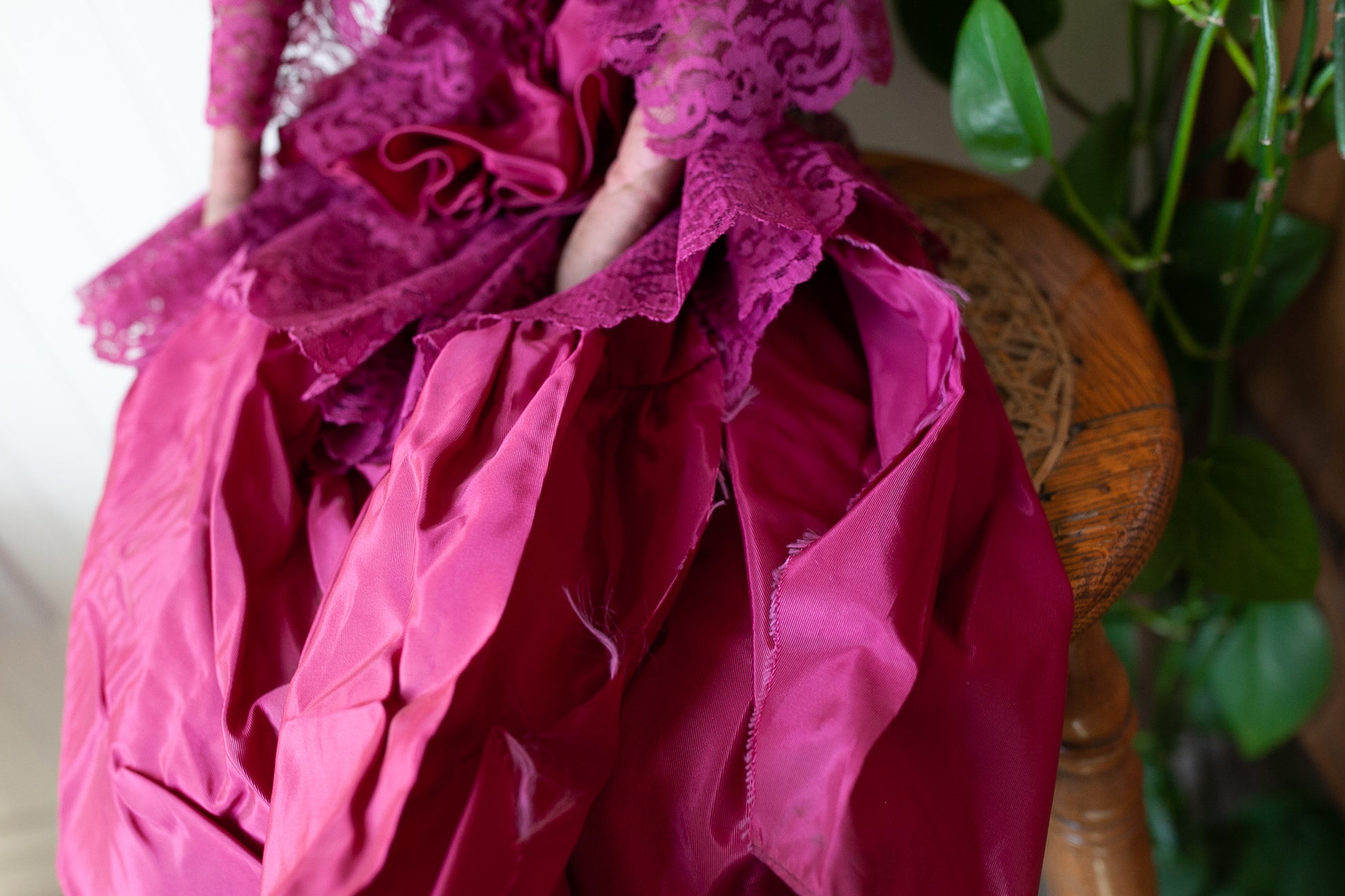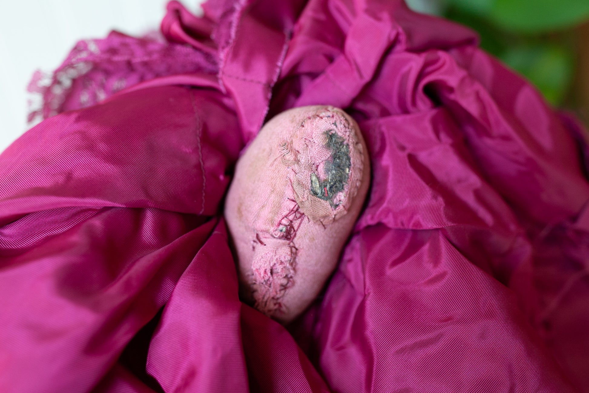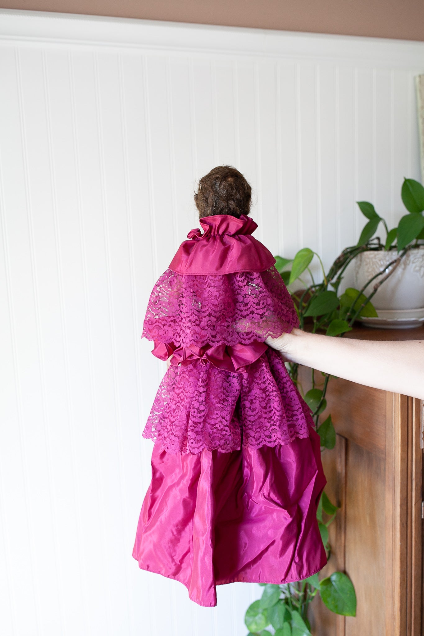 I decided she was "the grumpy sister" because I pictured her with a happy doll! She is lovely with a painted face. She has a brunette wig. She has a composition head and fabric arms and body. She has some chipping and cracking in the composition but is still in fairly good condition for this type of doll! She no longer has her long skinny legs. Still sits fine and her long pretty magenta dress makes a statement. Her fabric body portions are stained and have a few little holes. She is about 12" tall of body and about 26" long to the dress edge. Her head is on a  slight swivel and can still turn.