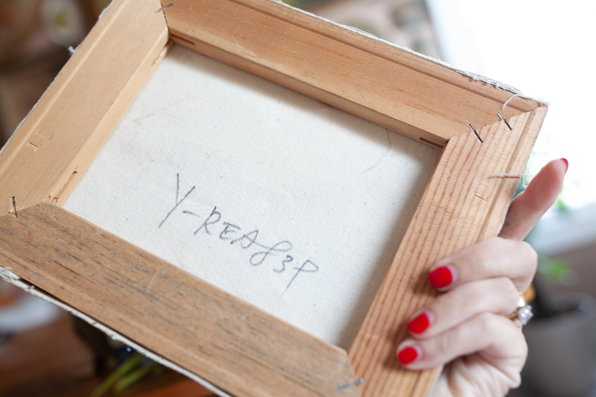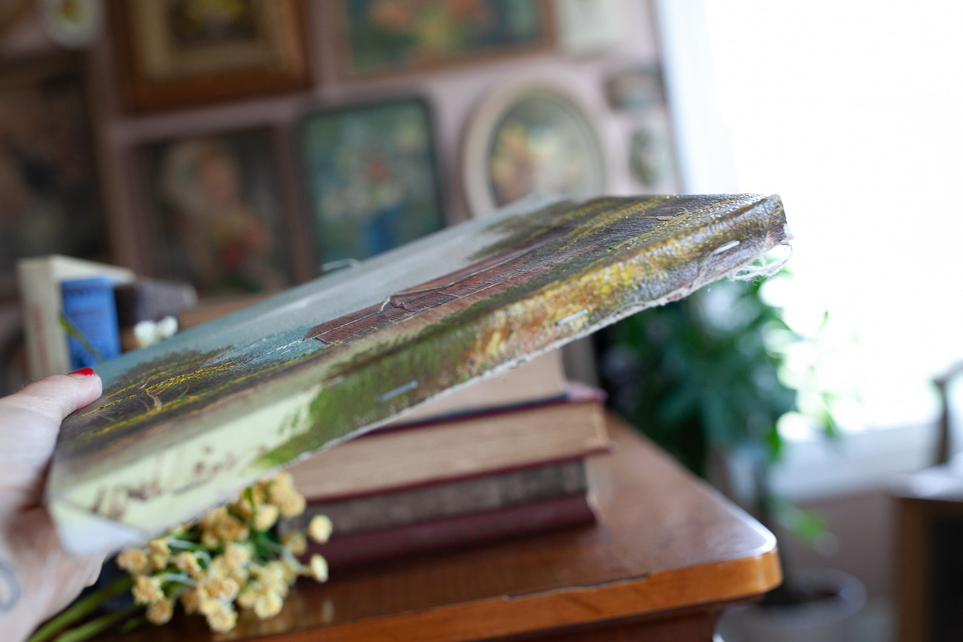 8"x10" canvas painting of a barn and farm scene. This piece of art is very nicely painted and signed in the lower left- but the signature was folded over the edge and stapled down to the wood frame. There is a impression around the center rectangle where the canvas has creased from pressing against the wood frame on the back. One small puncture in the center under the wood frame as pictured.