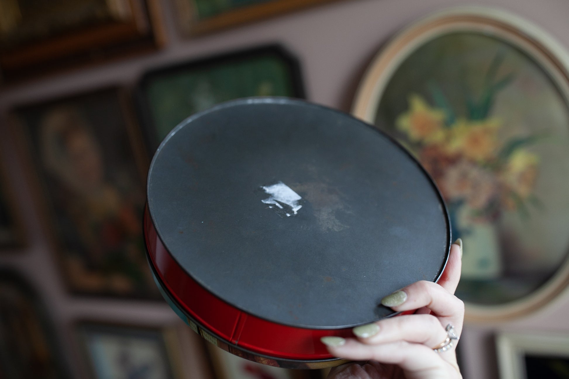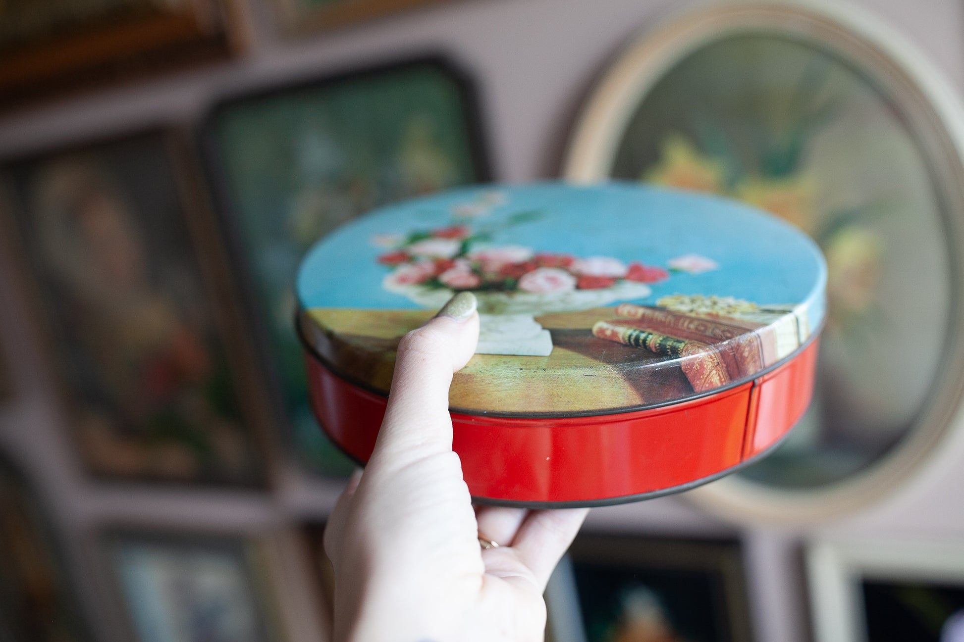 This gorgeous tin has a big bouquet of florals on it inside a white marble bowl. It has some wear around the edges, but it still has such a vibrant floral picture! It is about 8.5" in diameter and about 2" tall.