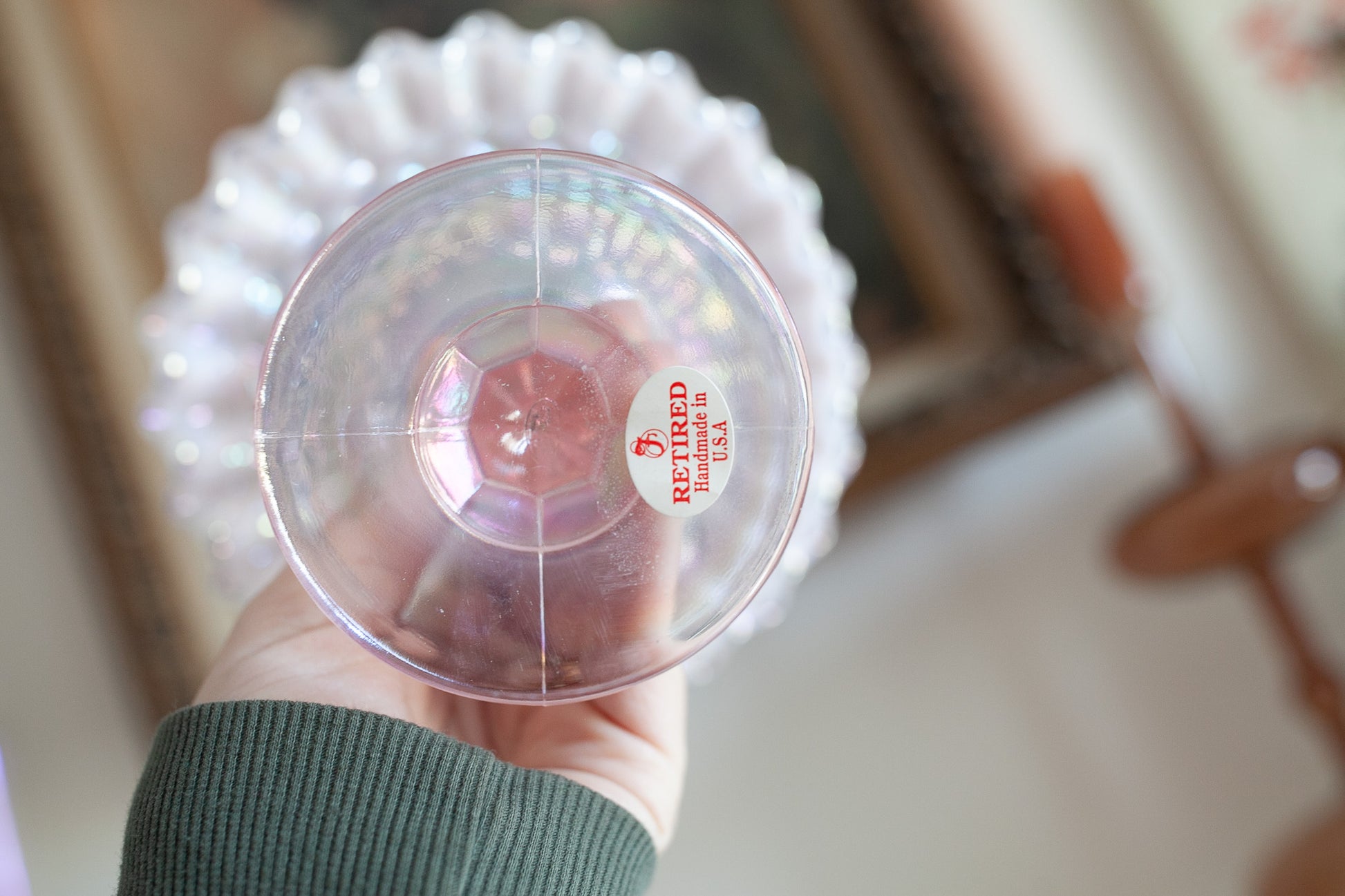 This beauty is about 8.5" tall. It has 3 pieces that make up the piece. It has a beautiful ruffle edge and hobnail details. It is simply stunning. It is stamped Fenton on the glass. It also has two original stickers. No chips or cracks.