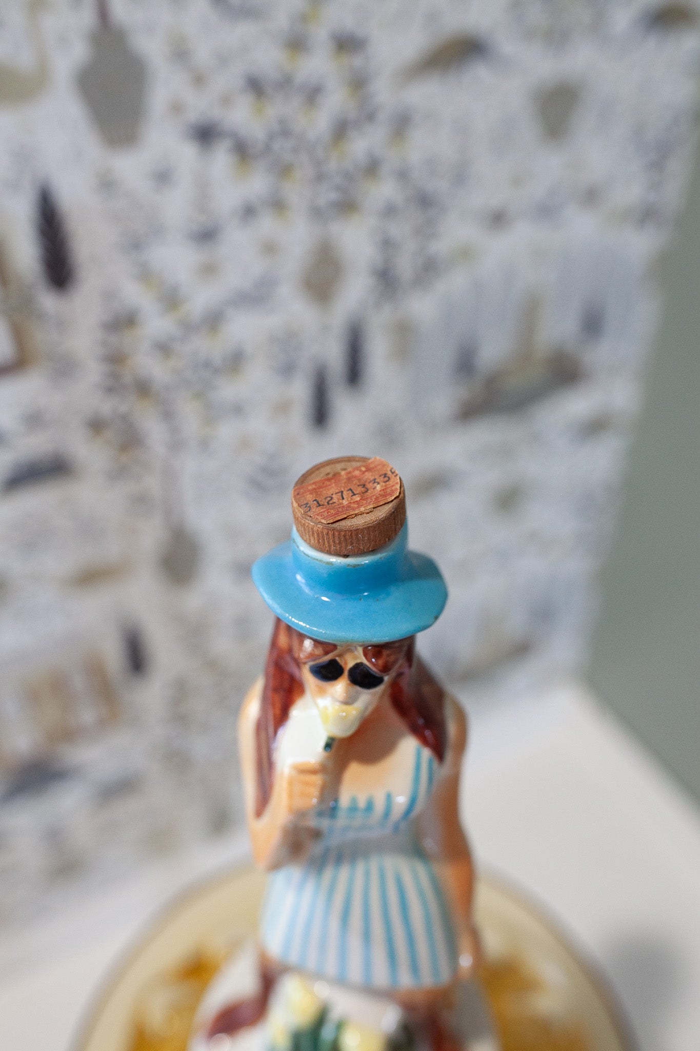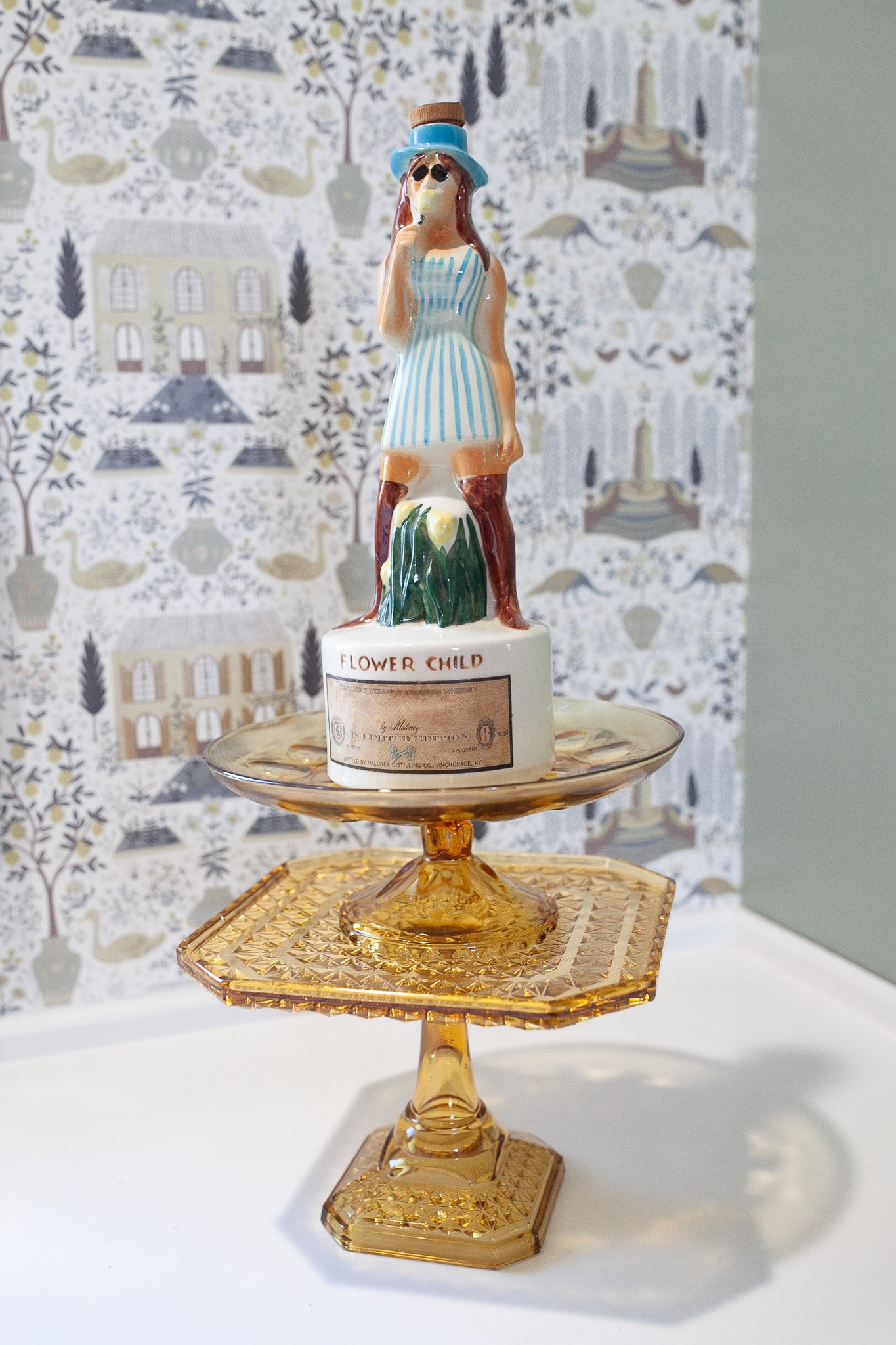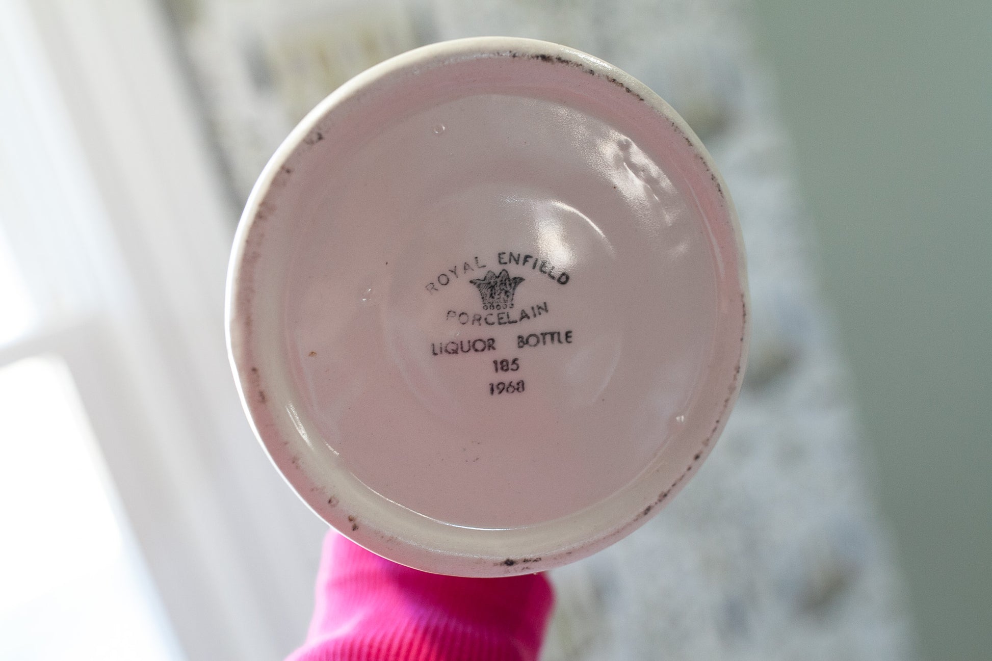 This awesome vintage 1960s Royal Enfield porcelain 'Flower Child' hippie girl liquor bottle would be great to use it for storing you liquors in your bar. You can also use it for a display piece in your bar area. This bottle is made out of Porcelain. It is a hippie girl holding flowers and wearing a striped dress with a hat standing on a white base. The white base says "Flower Child. The makers mark on the bottom says "Royal Enfield Porcelain Liquor Bottle 185 1968. Overall, a very nice vintage bottle in great condition. Sold empty.